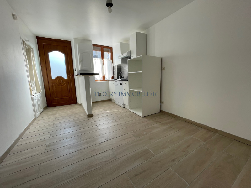 Une entrée sur cuisine aménagée, salon ou chambre, salle de douche avec wc.