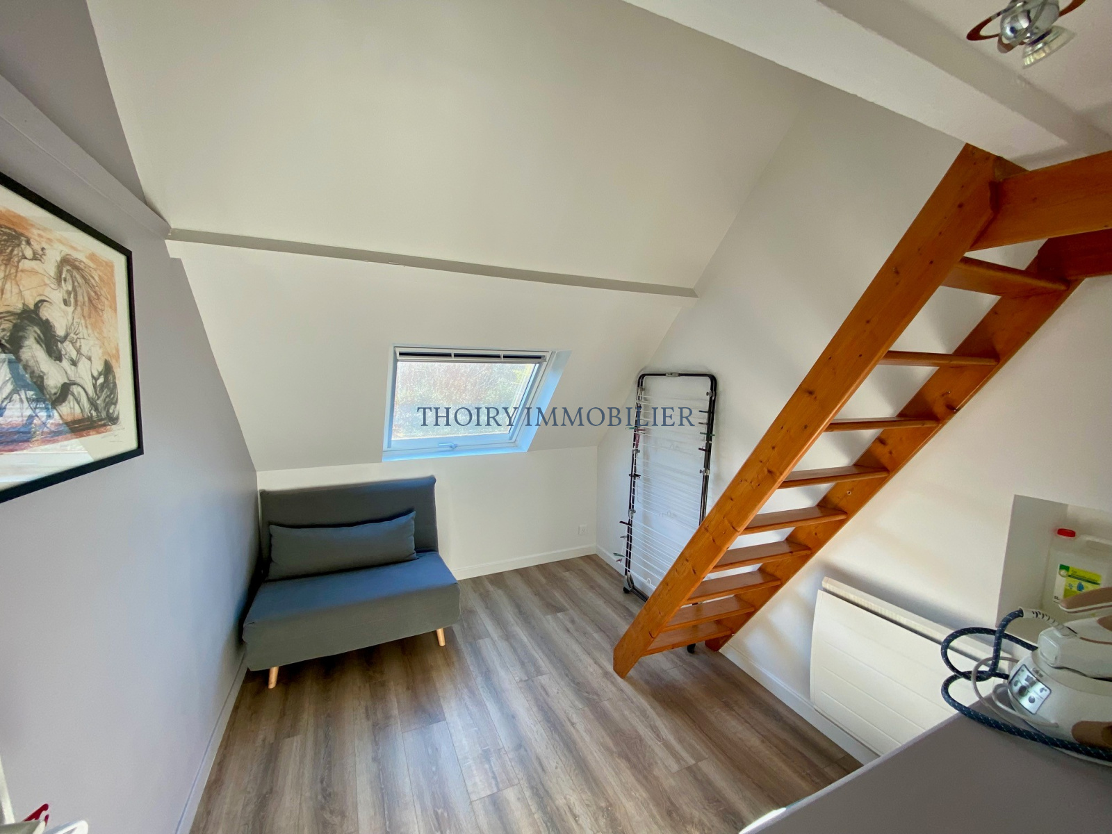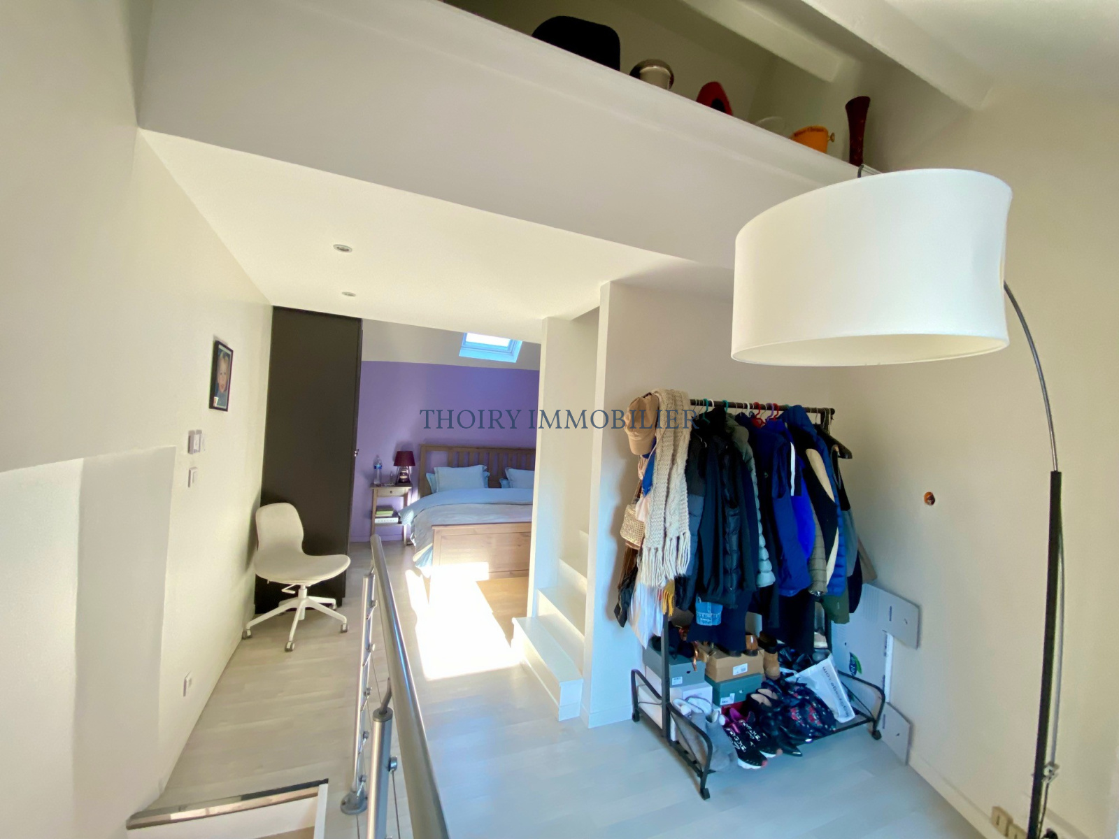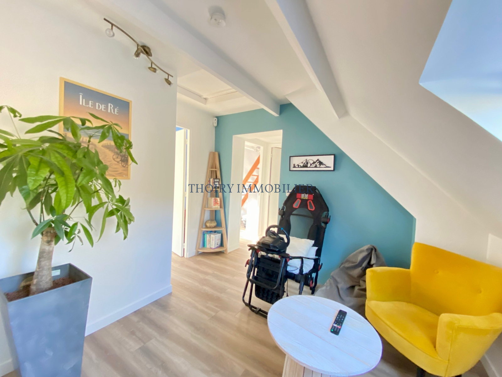 A l'étage : Un palier détente desservant 2 chambres dont une avec mezzanine et une salle de bains avec wc.
