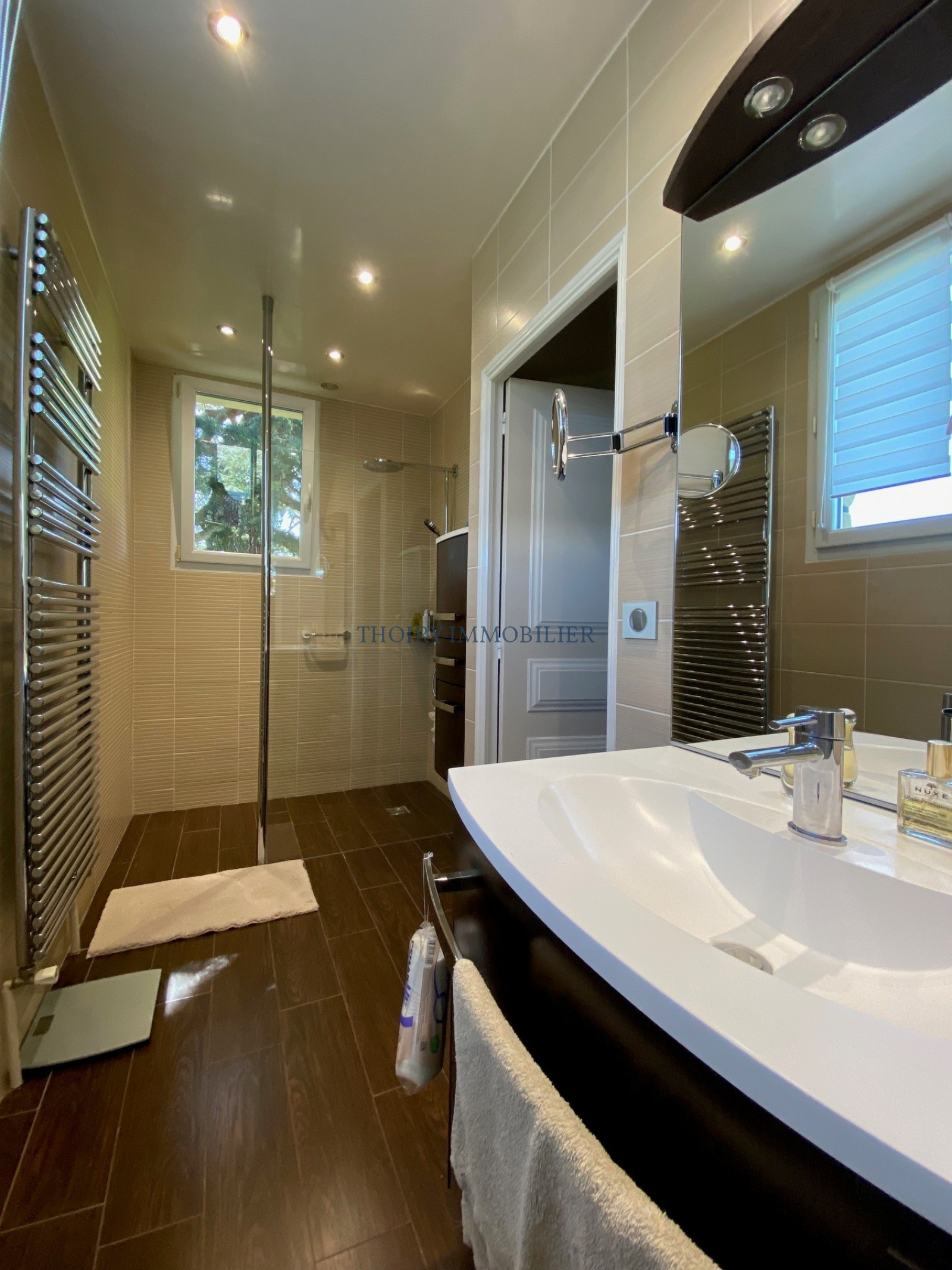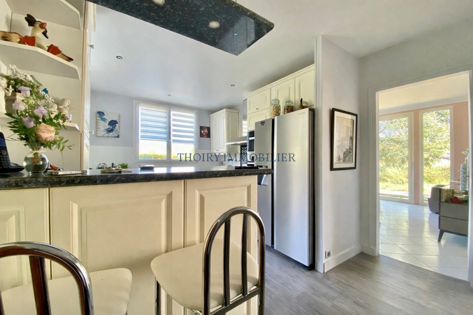 Au rez-de-chaussée : Entrée sur cuisine aménagée équipée ouverte sur le séjour avec une superbe vue sur le jardin, une suite parentale composée d'une chambre avec salle de douche à l'italienne, dégagement et wc suspendus.