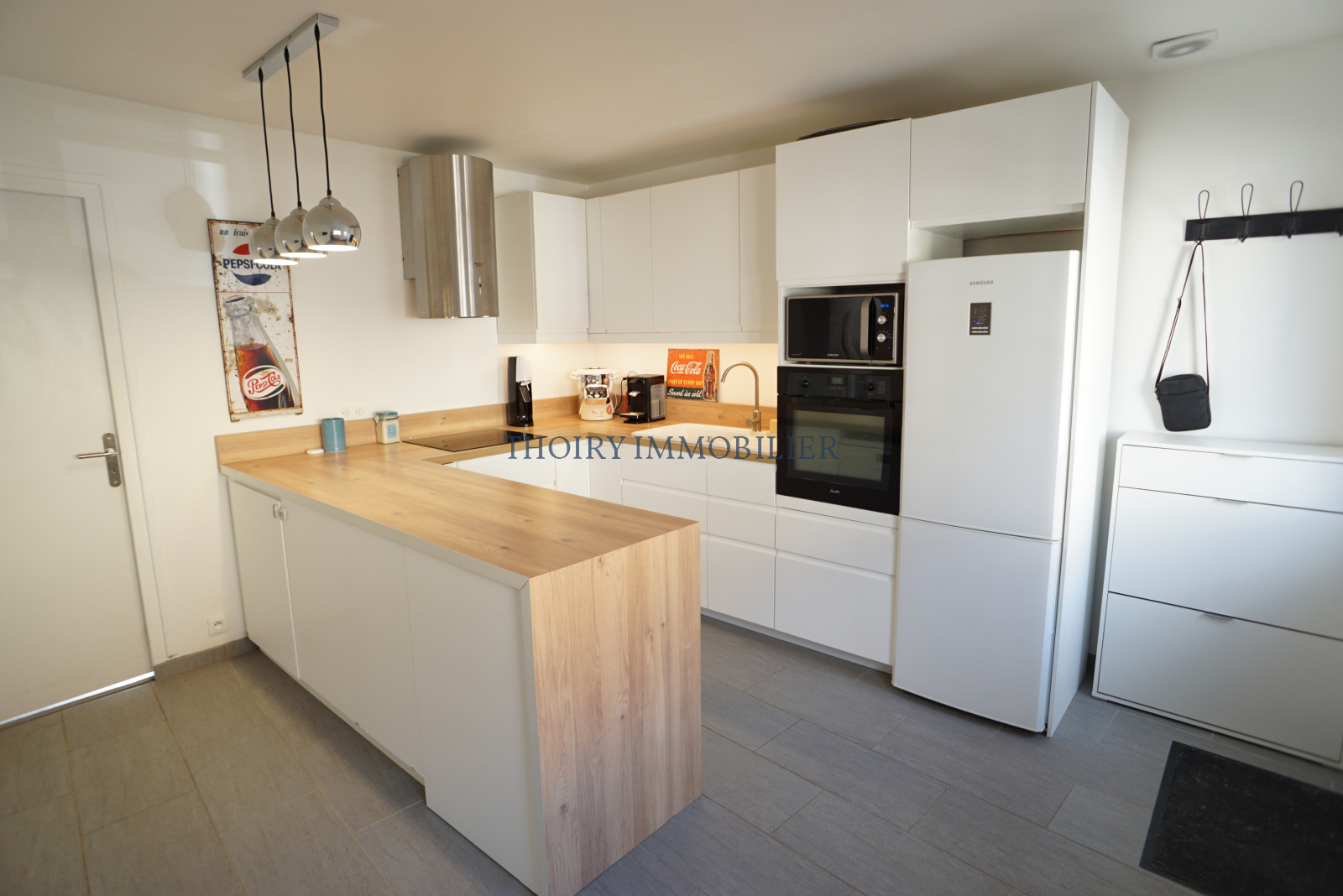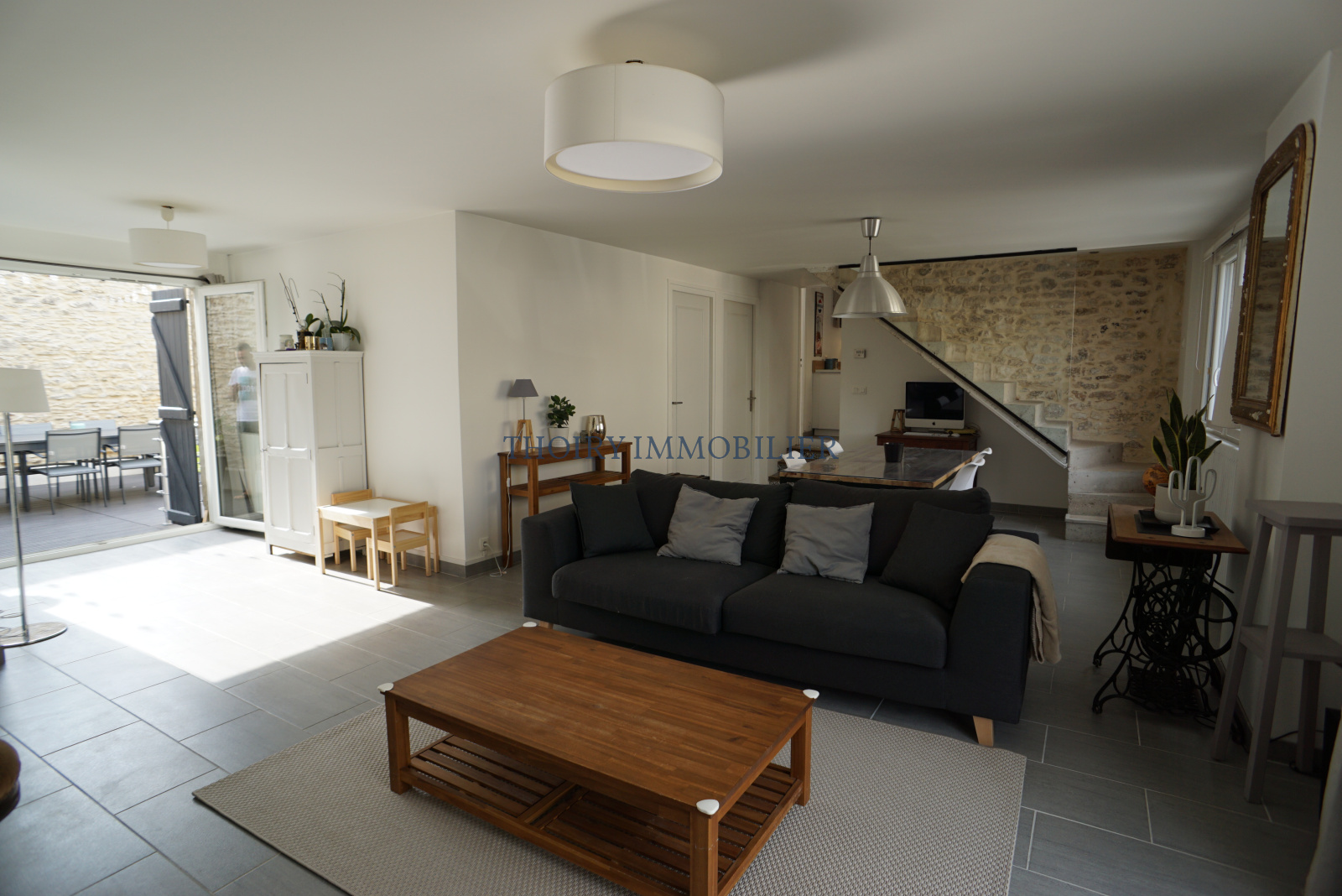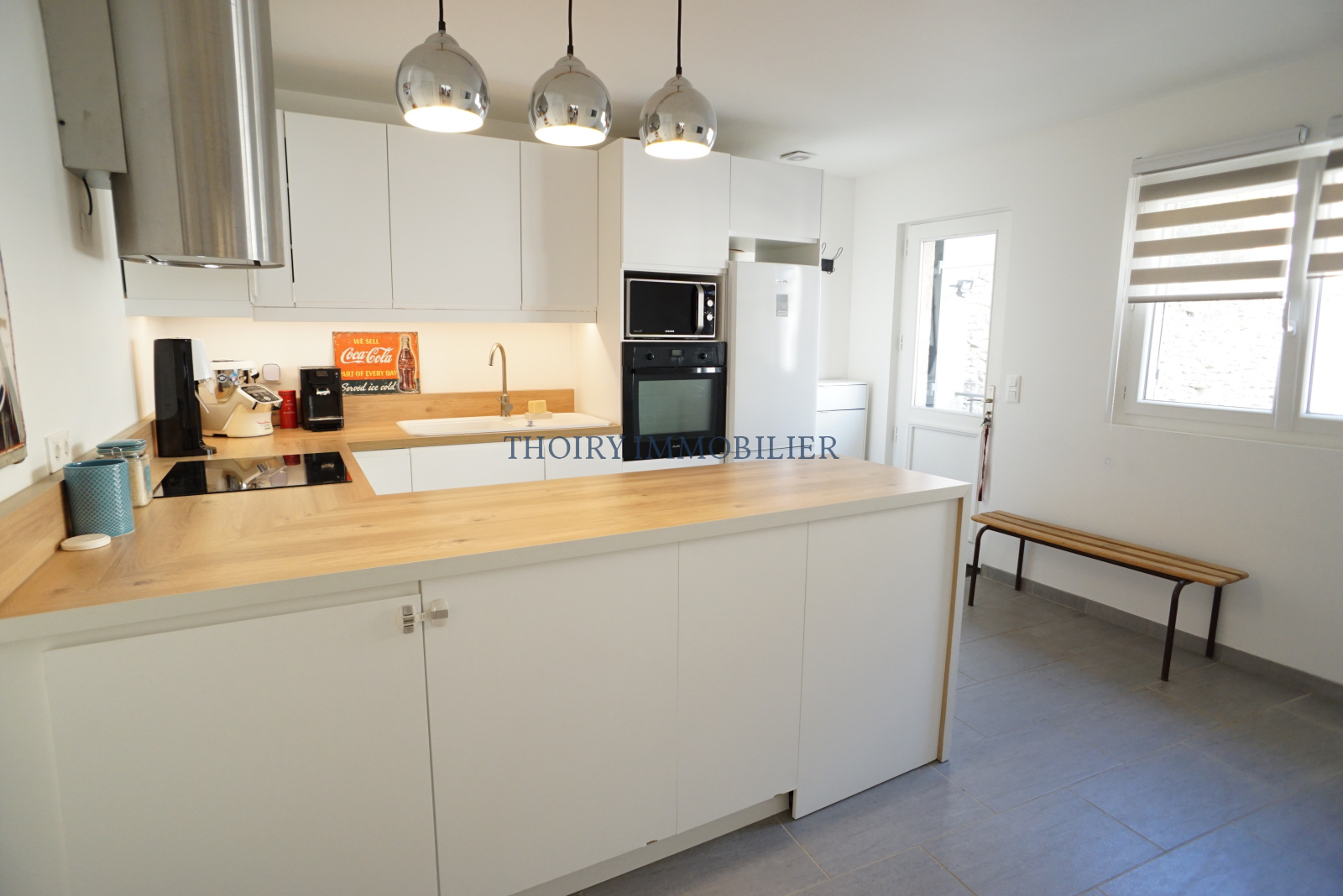 - Au rez-de-chaussée : cuisine aménagée équipée, séjour double avec poële, deux chambres, salle de bains, wc.