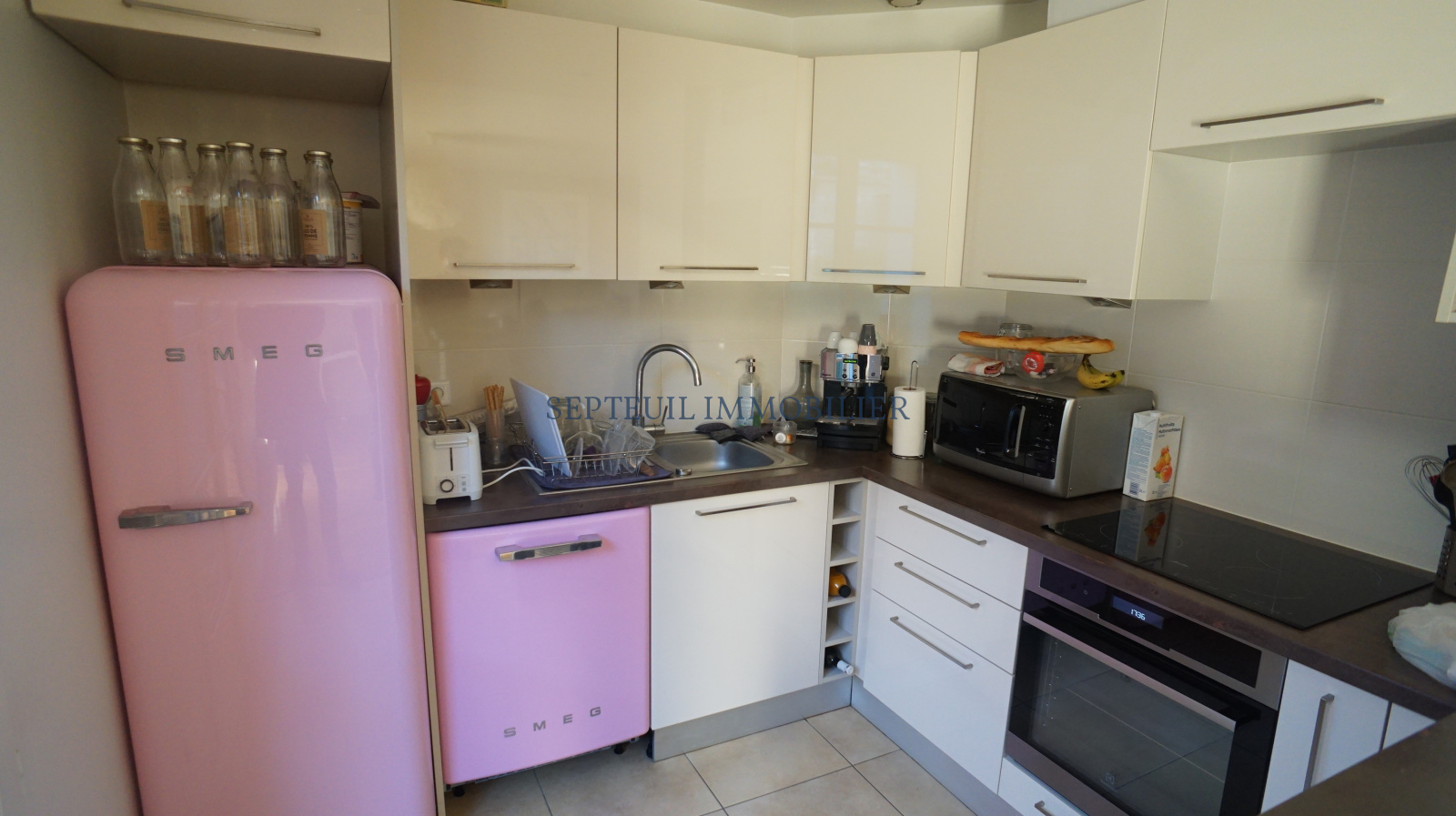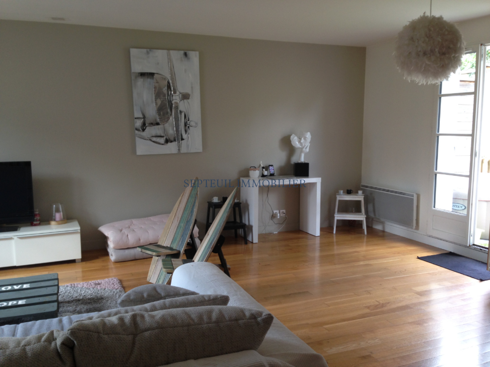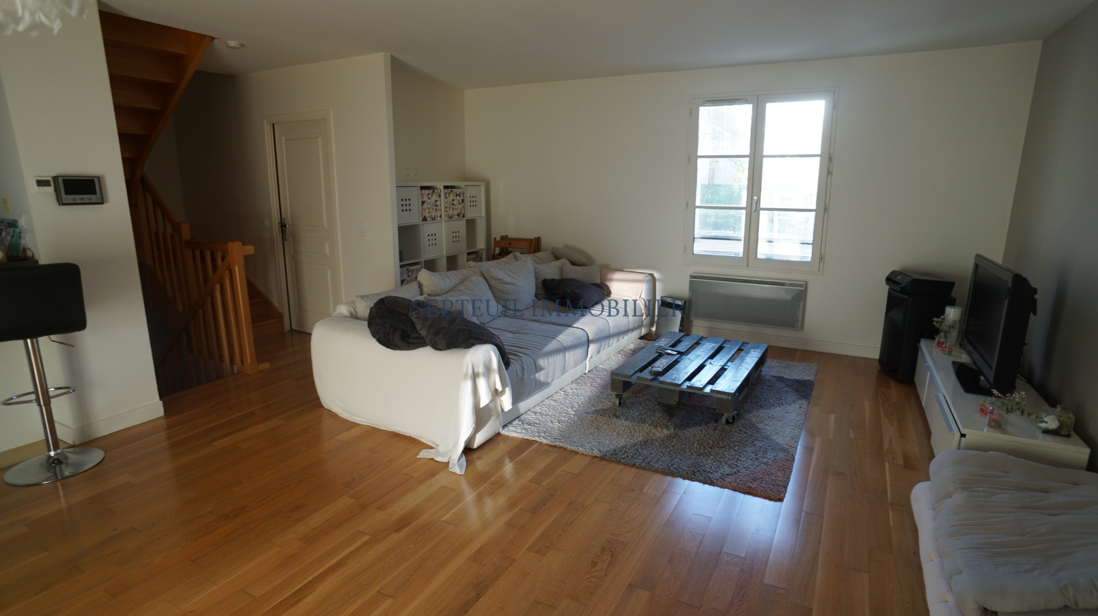 Entrée, séjour avec cuisine us aménagée ( 38 m² ), 3 chambres, salle de bains, 2 wc.