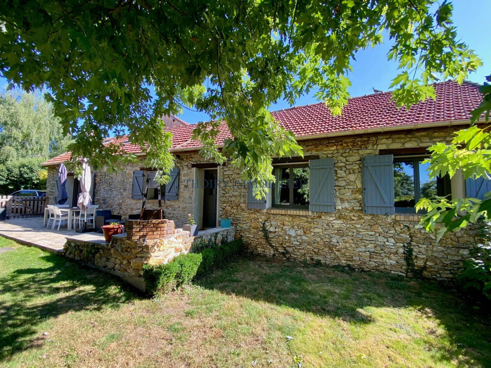 Charmante longère en pierres apparentes comprenant au rez de chaussée: Entrée, très beau séjour cathédrale avec poêle à bois, cuisine u.s aménagée et équipée, dégagement avec placard, 3 chambres, salle de bains avec baignoire et douche, wc séparé, buanderie/ cellier.