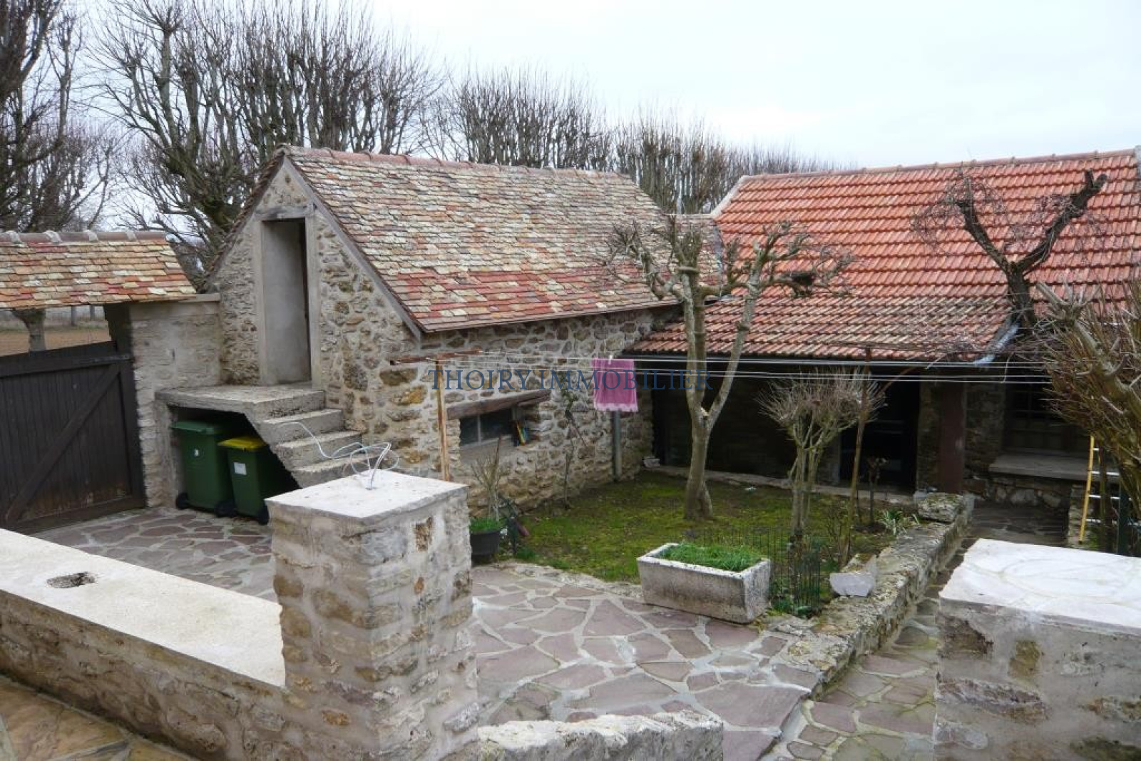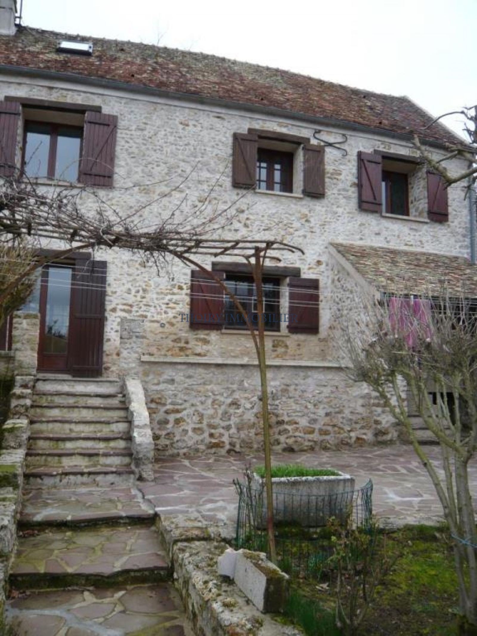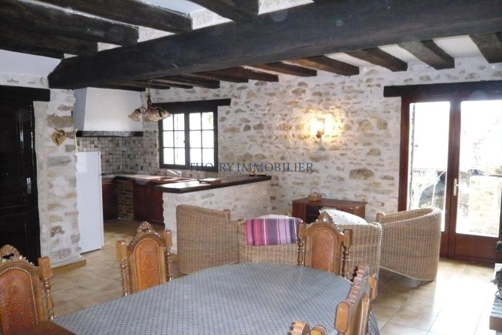 Maison ancienne en pierres apparentes sur 350 m² de terrain environ. Séjour + cuisine u.s aménagée. 5 chambres, palier/ bureau. Salle de bains et salle de douche. Cellier. 2 garages, dépendance aménageable.