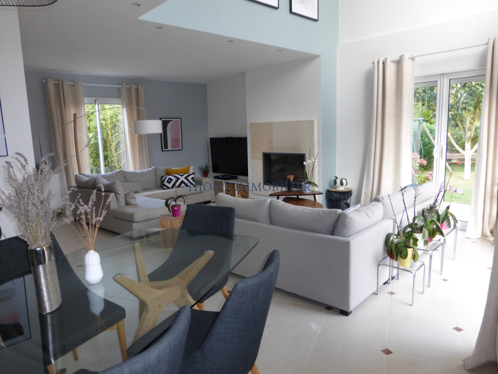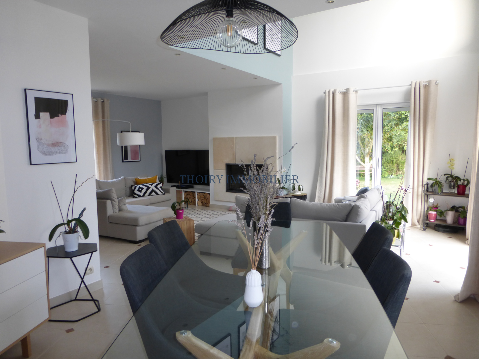 En rez-de-chaussée : Hall d'entrée, toilettes d'invités, une chambre avec douche privative, une cuisine aménagée équipée et un vaste séjour de 56 m², tripe exposition, avec cheminée.