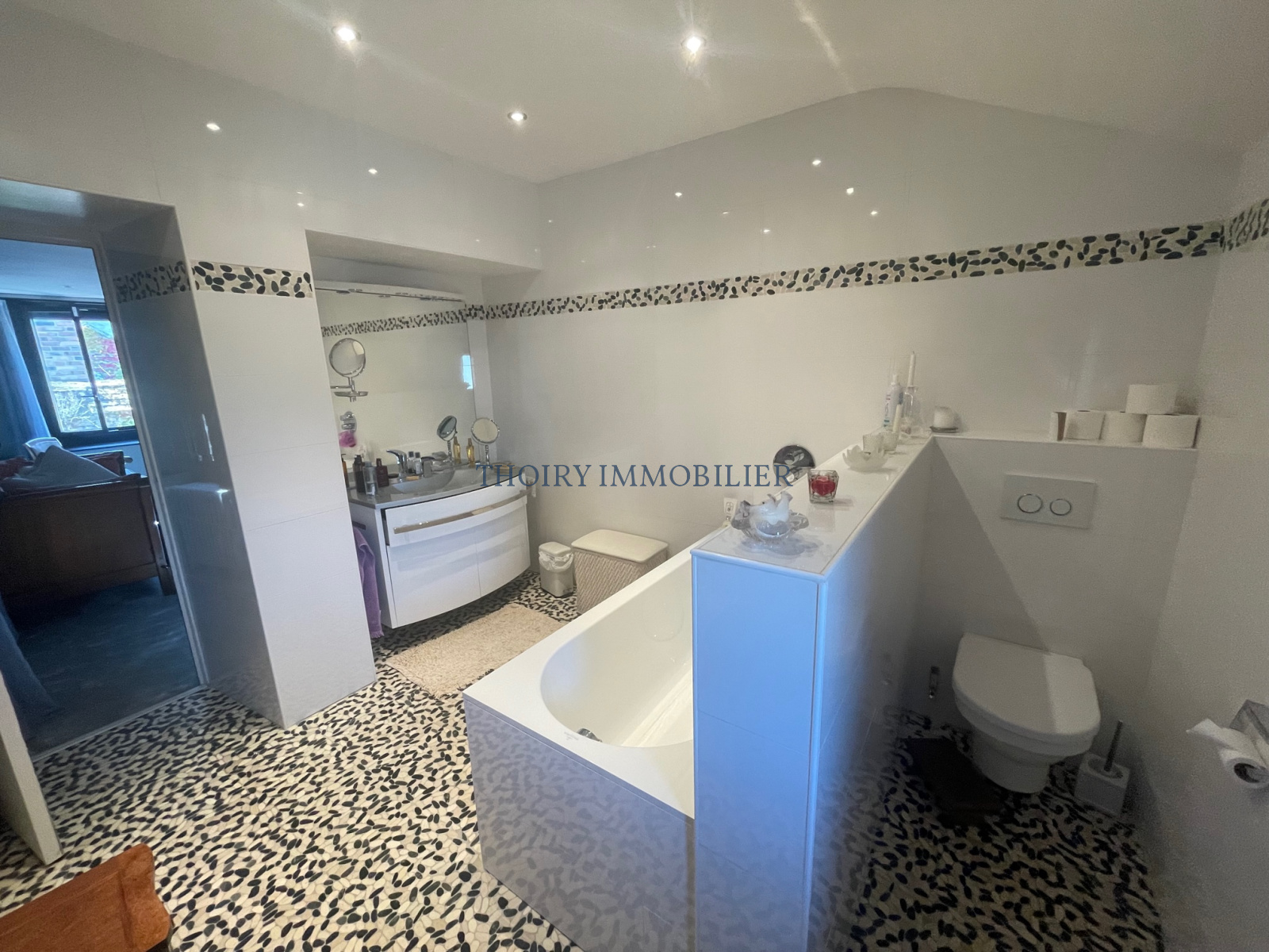 - Au rez-de-chaussée majestueuse entrée en marbre avec poêle à granule, séjour salon avec cheminée insert, cuisine aménagée équipée, salle de douche à l'italienne avec buanderie, wc avec lave-mains.