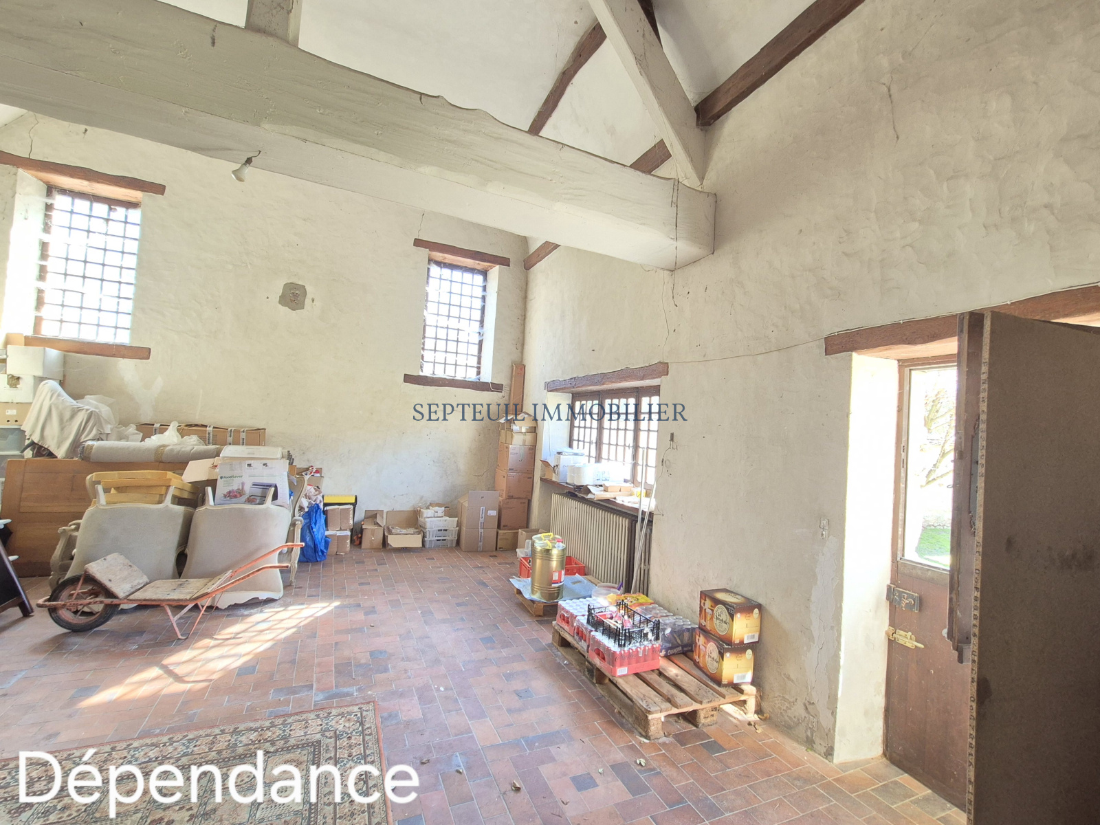 Maison principale : salon avec cheminée à insert, cuisine familiale, avec accès terrasse, grande pièce voûtée de 40m², à finir d'aménager, toilettes et buanderie.