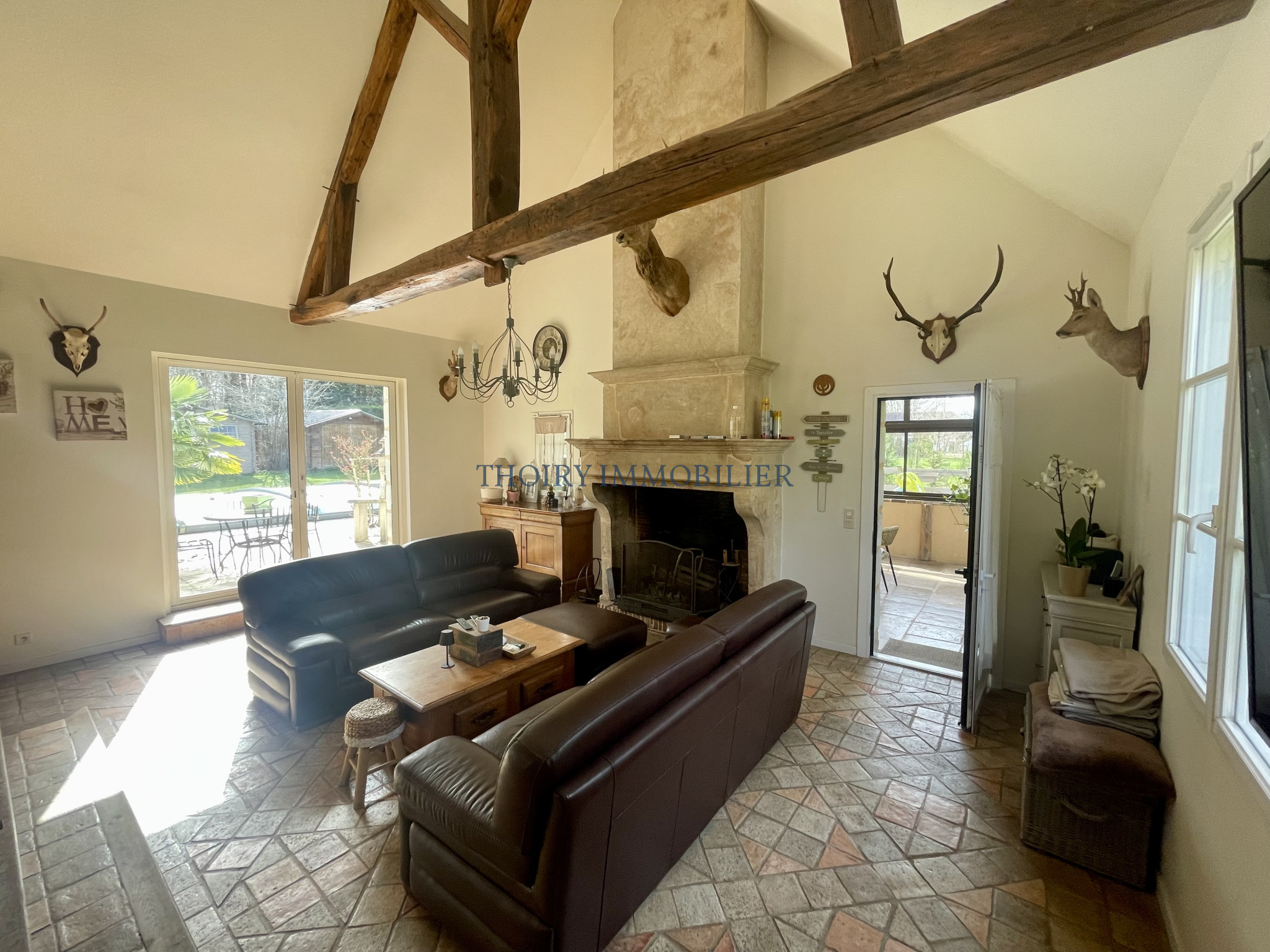 - Au rez-de-chaussée entrée, grande cuisine dînatoire, cellier, wc, une suite avec dressing et salle de douche, séjour avec cheminée 70 m² (poutres), salon d'été avec accès direct sur la piscine de 30 m².