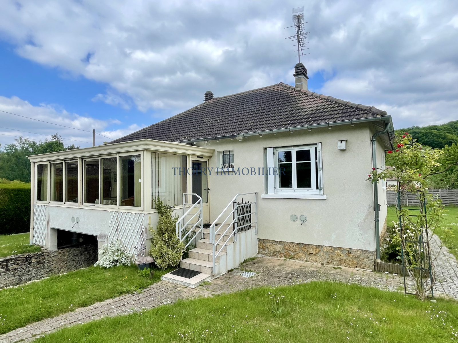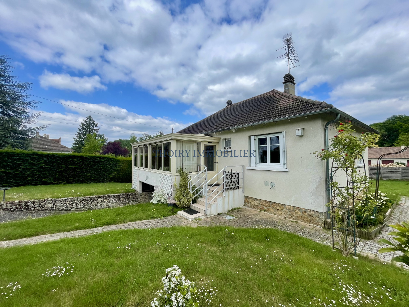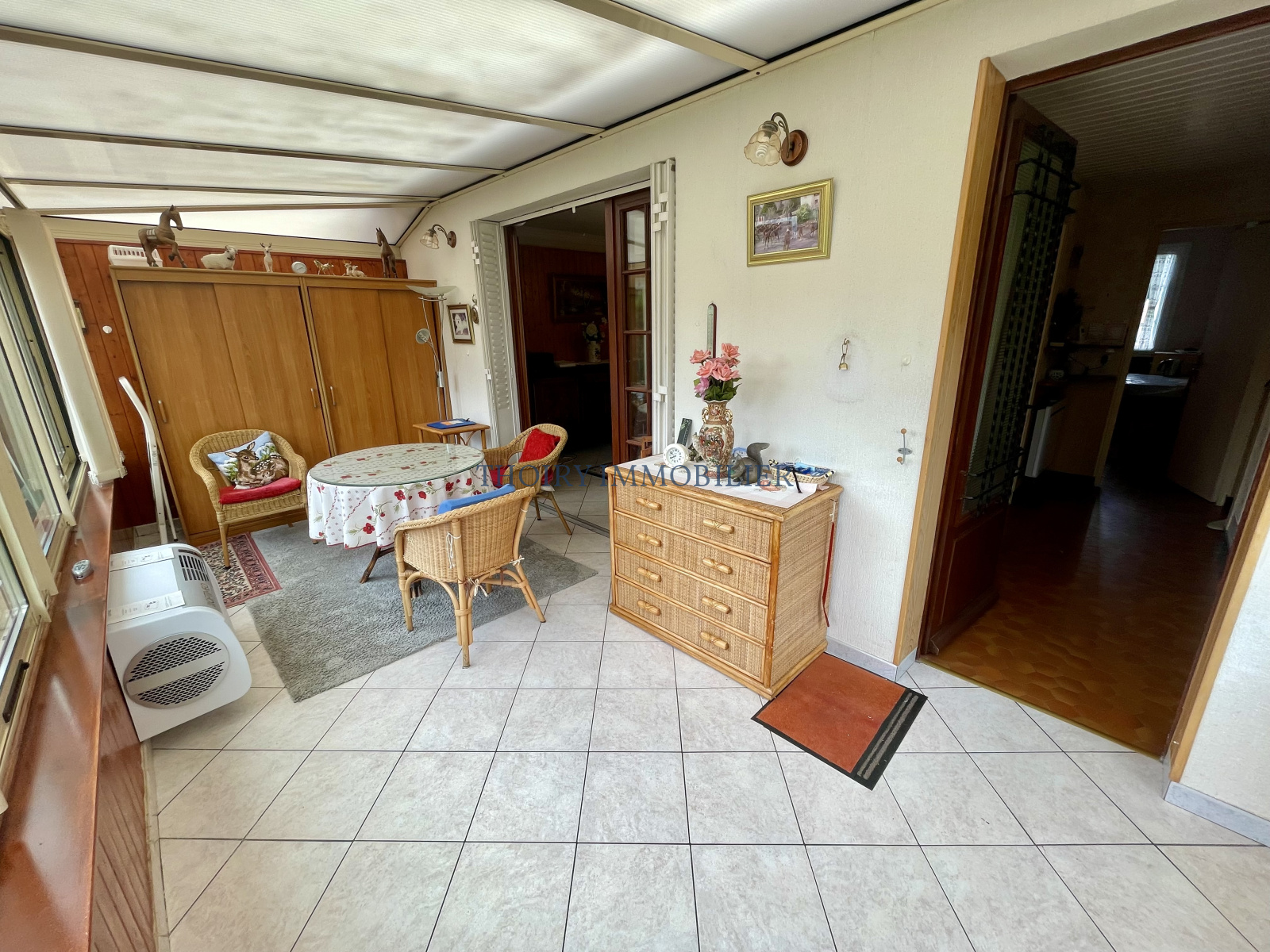 Entrée, séjour avec véranda 39 m², cuisine aménagée, couloir, deux chambres avec placards, salle de douche, wc séparés.