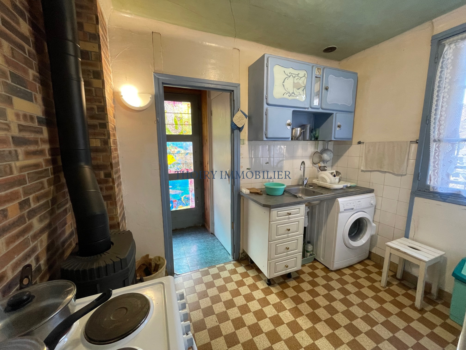 En rez-de-chaussée : Entrée, wc, cuisine avec poële à bois, séjour, 3 chambres et une salle de douche.