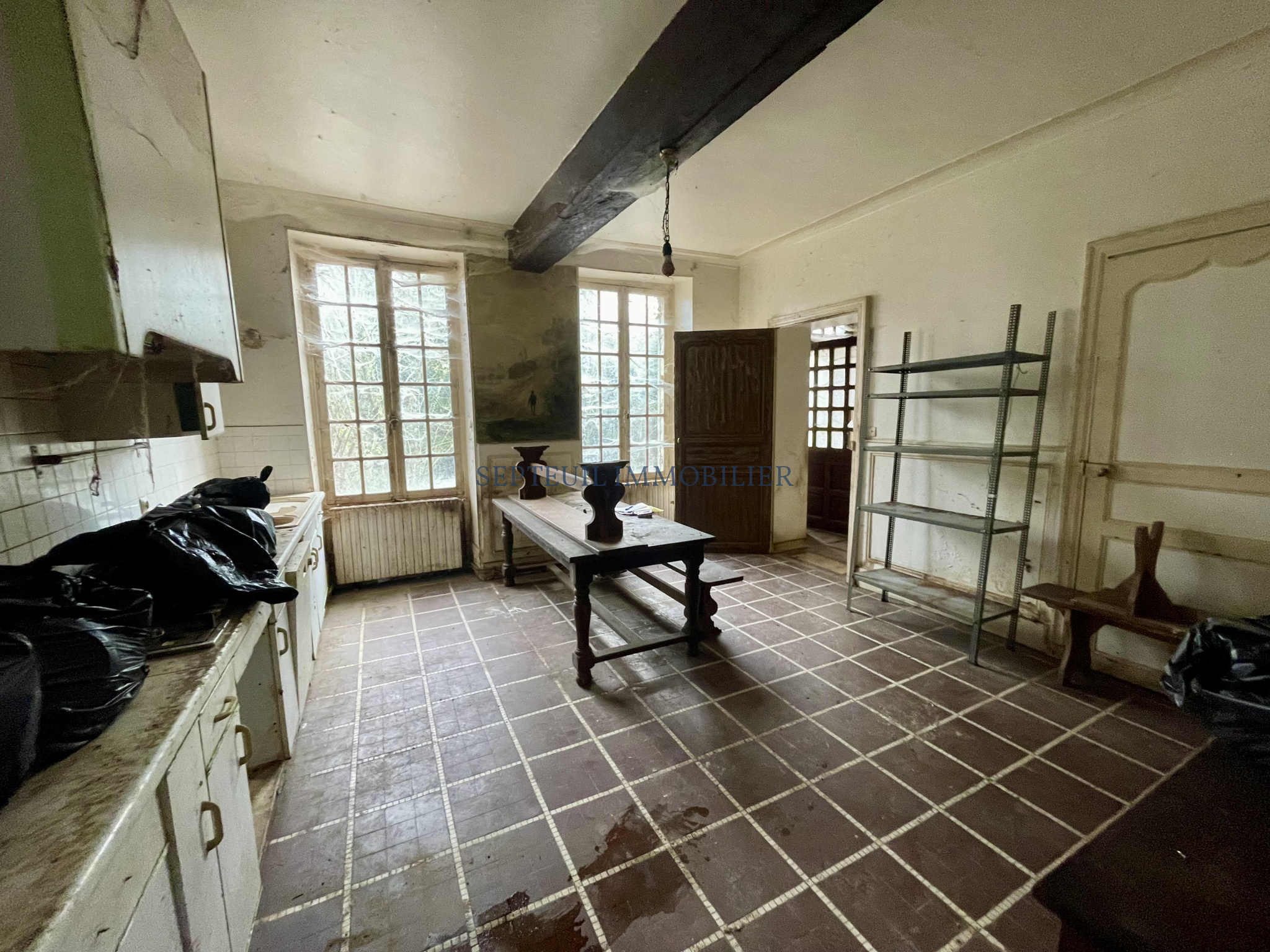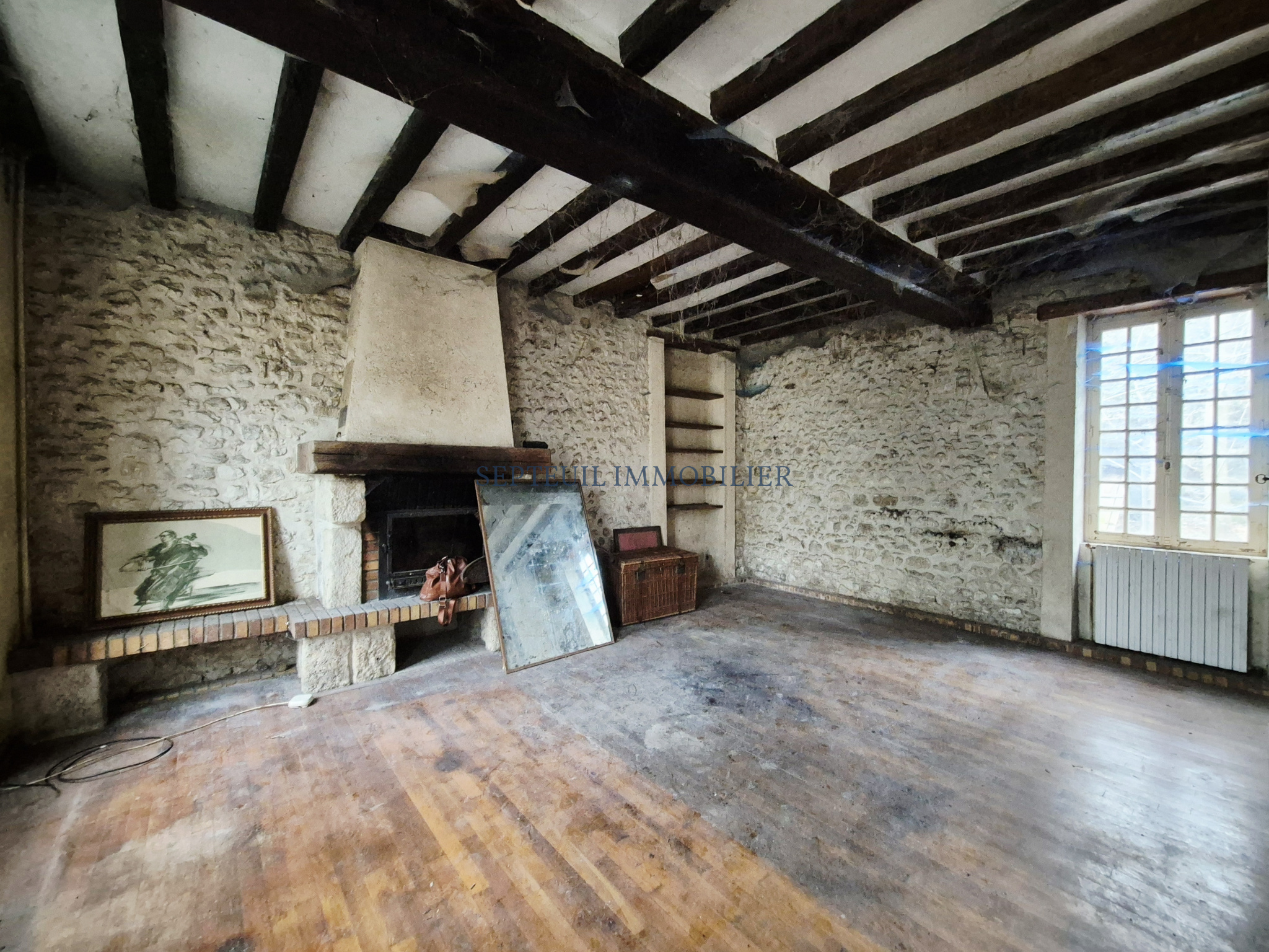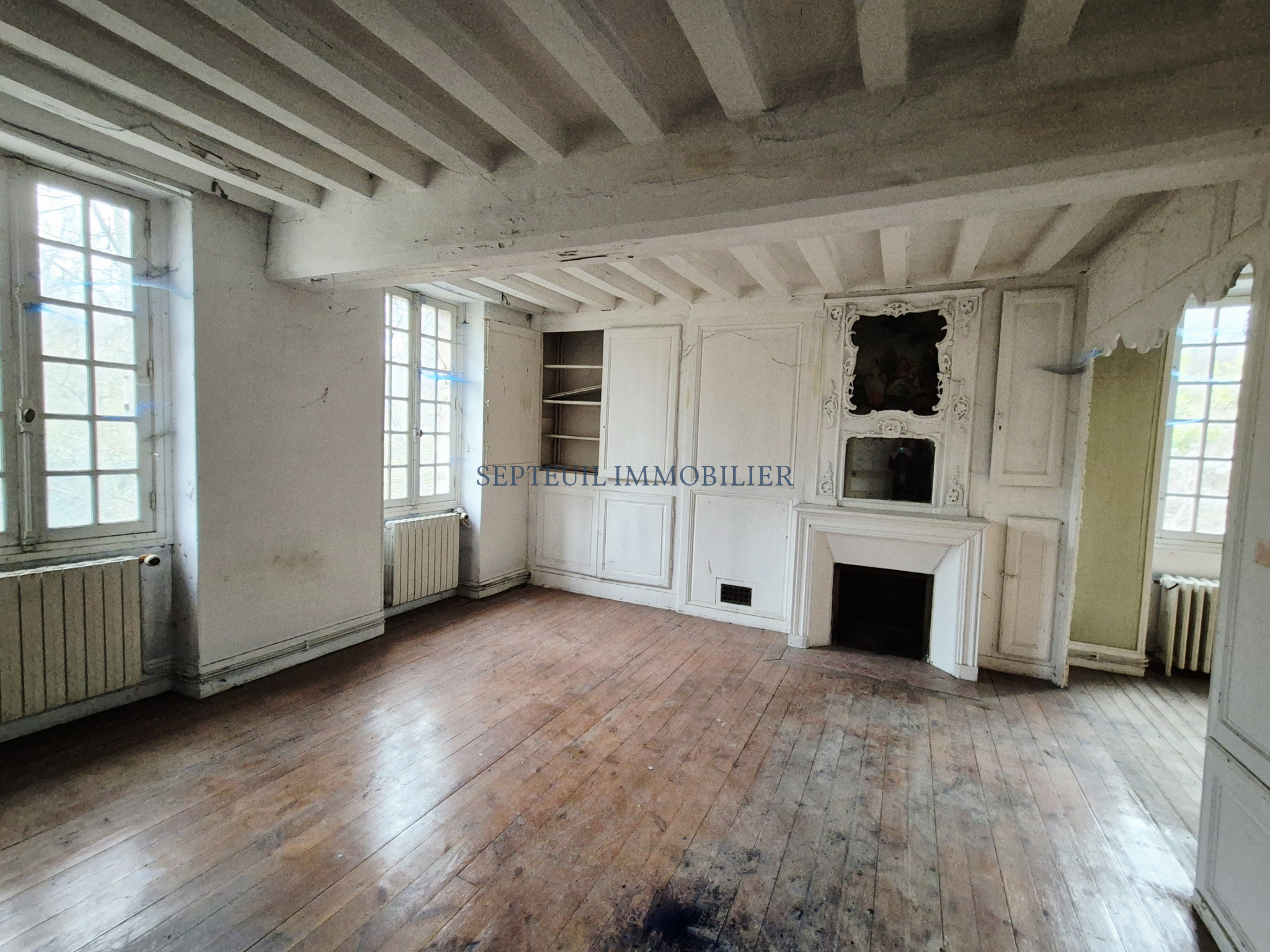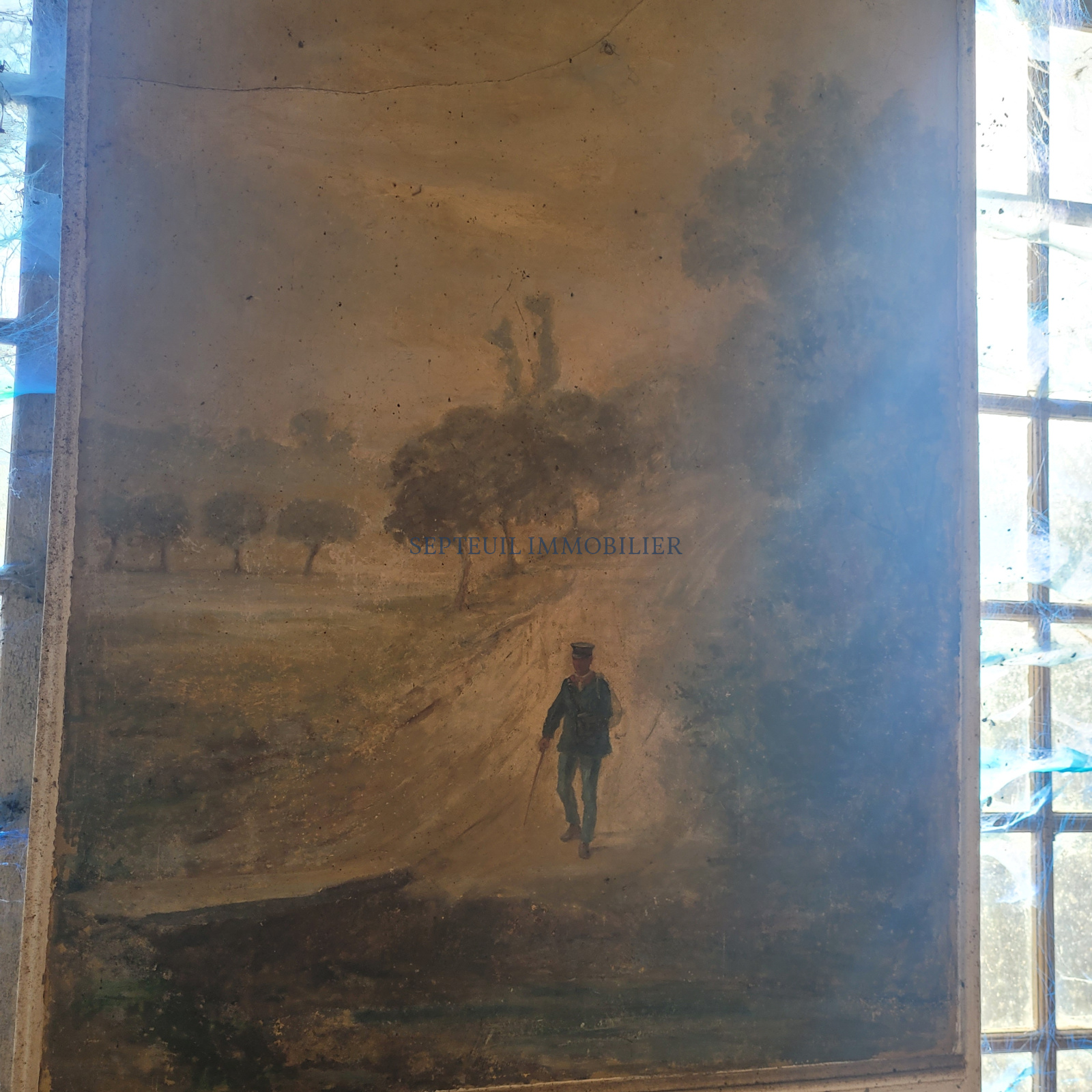 - Au rez-de-chaussée vestibule, séjour avec cheminée, salle à manger avec fresques d'origine, grande cuisine dinatoire, wc, cave