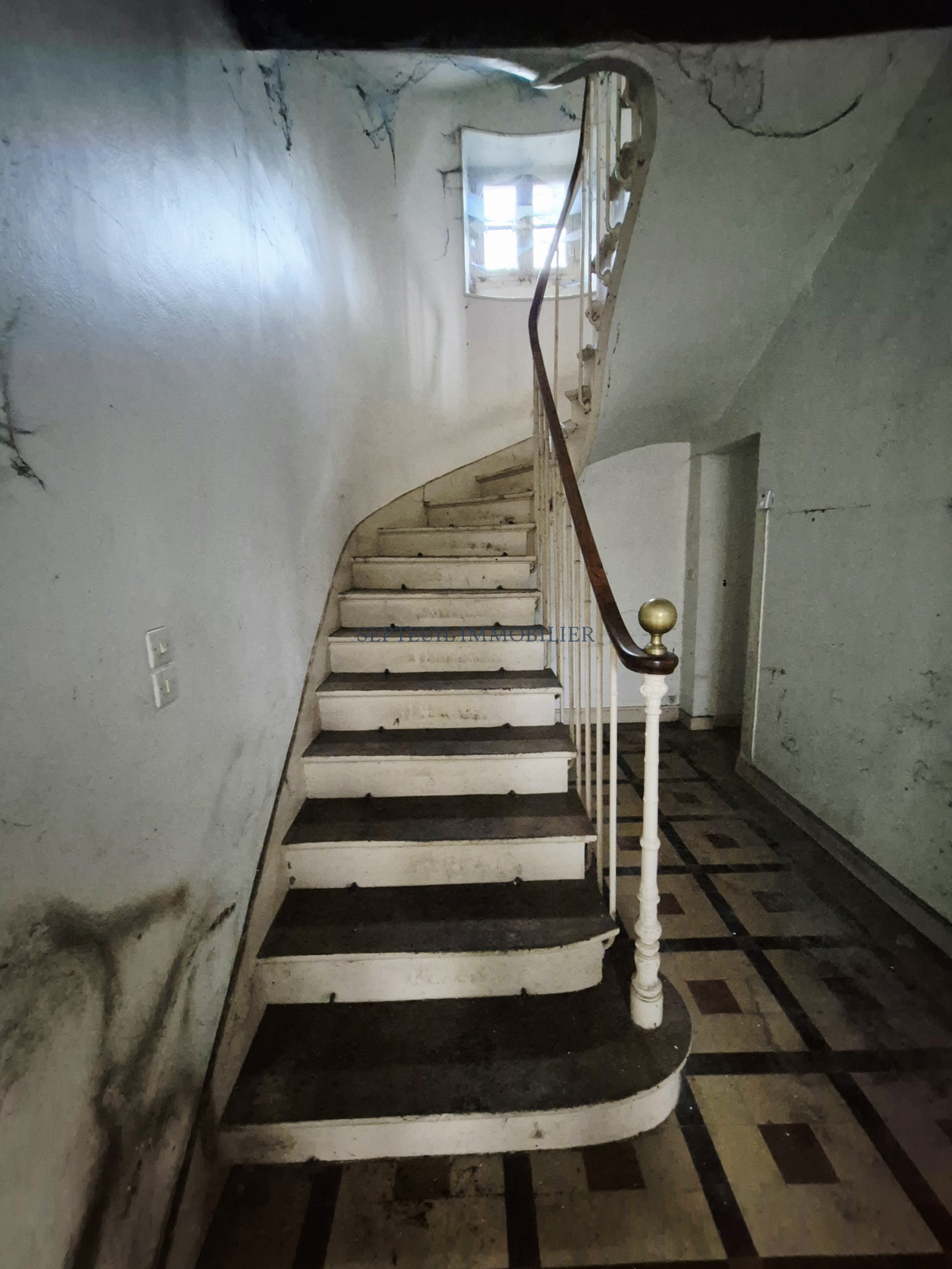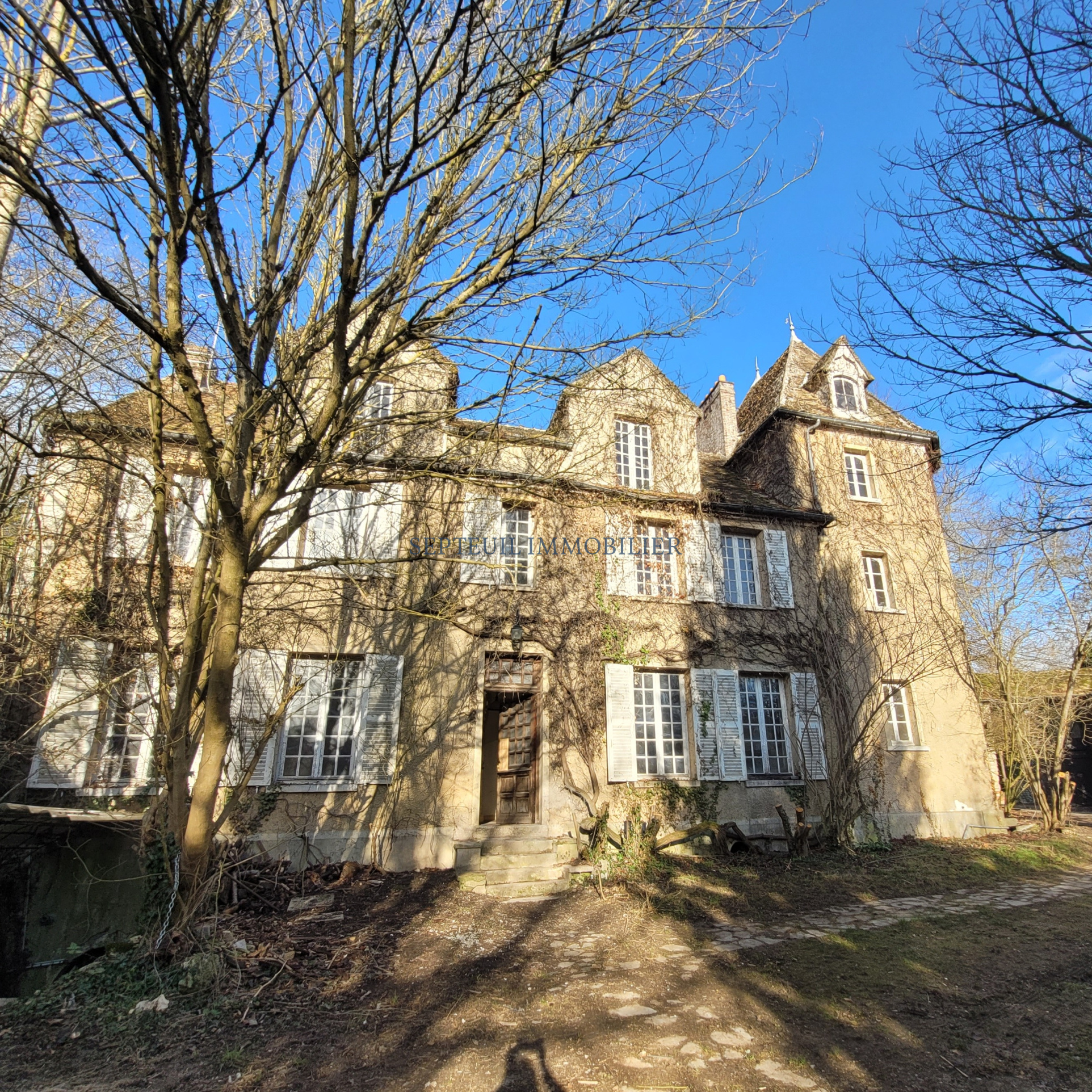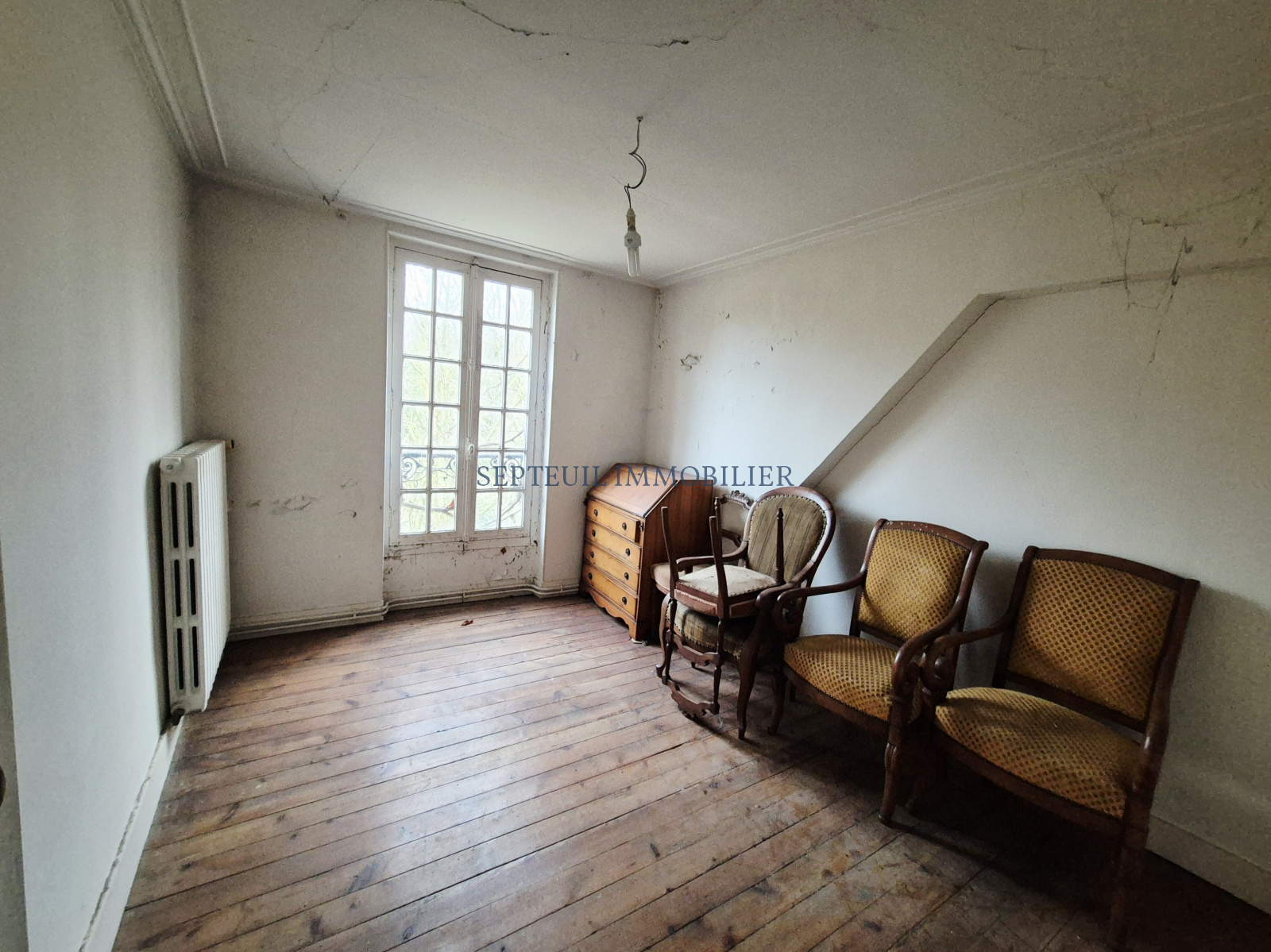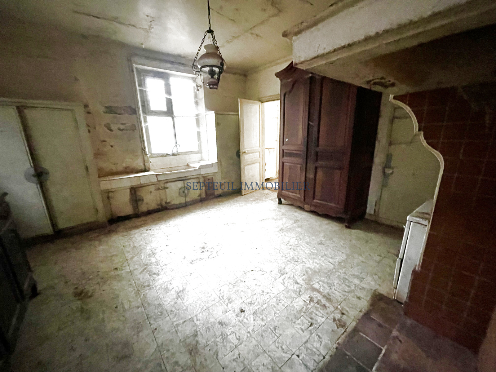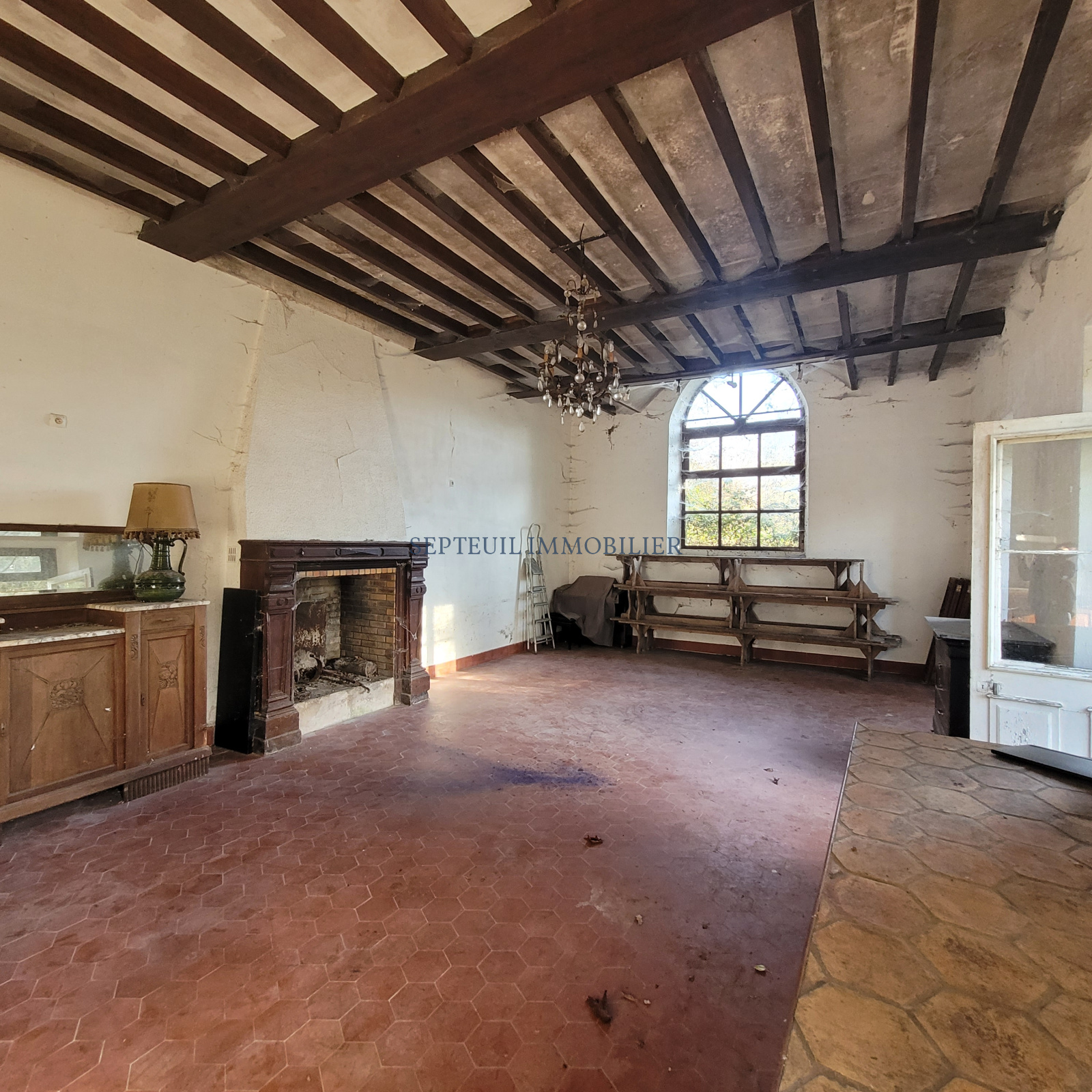 - Au rez-de-chaussée vestibule, séjour avec cheminée, salle à manger avec fresques d'origine, grande cuisine dinatoire, wc, cave