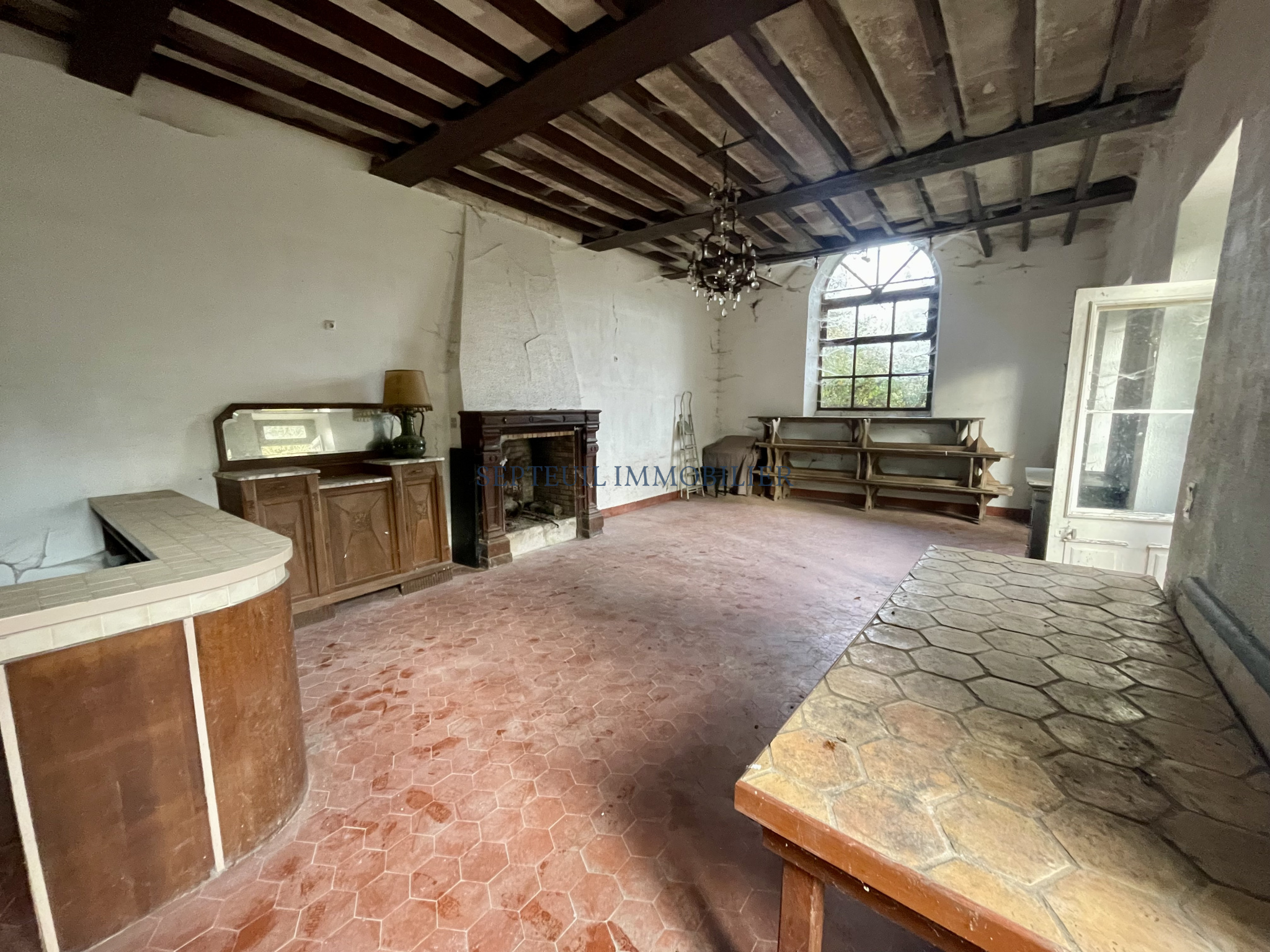 En annexe, "Salon de chasse", pièce de réception d'environ 60m² avec cheminée, bar et cuisine avec une belle hauteur sous plafond et poutres apparentes.