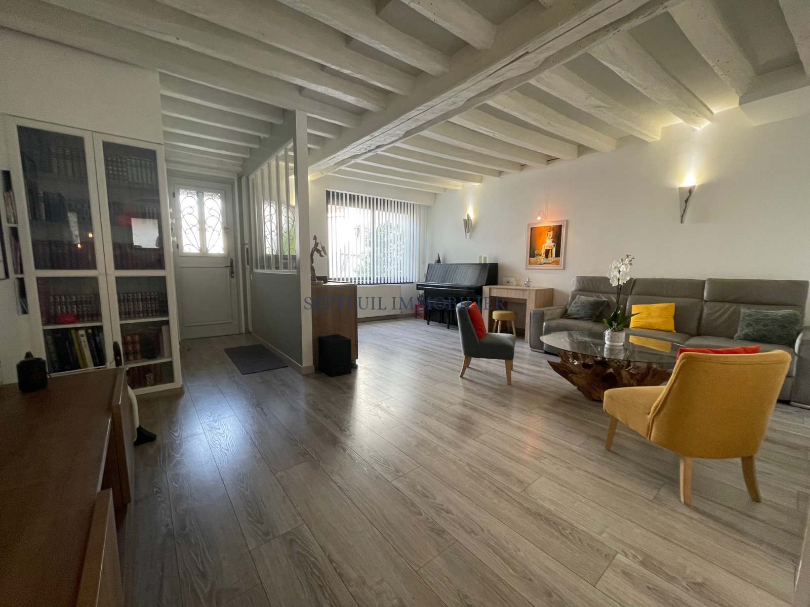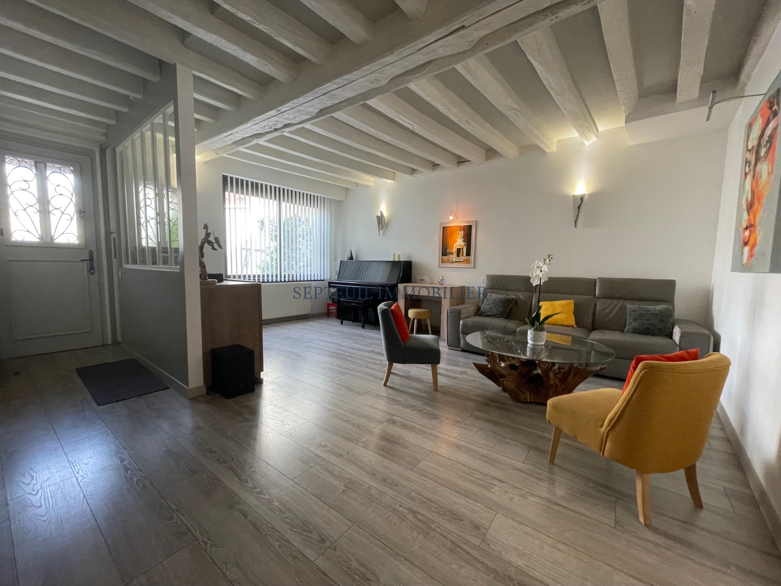 Entrée, séjour double, grande cuisine équipée de 16 m² et wc indépendant.