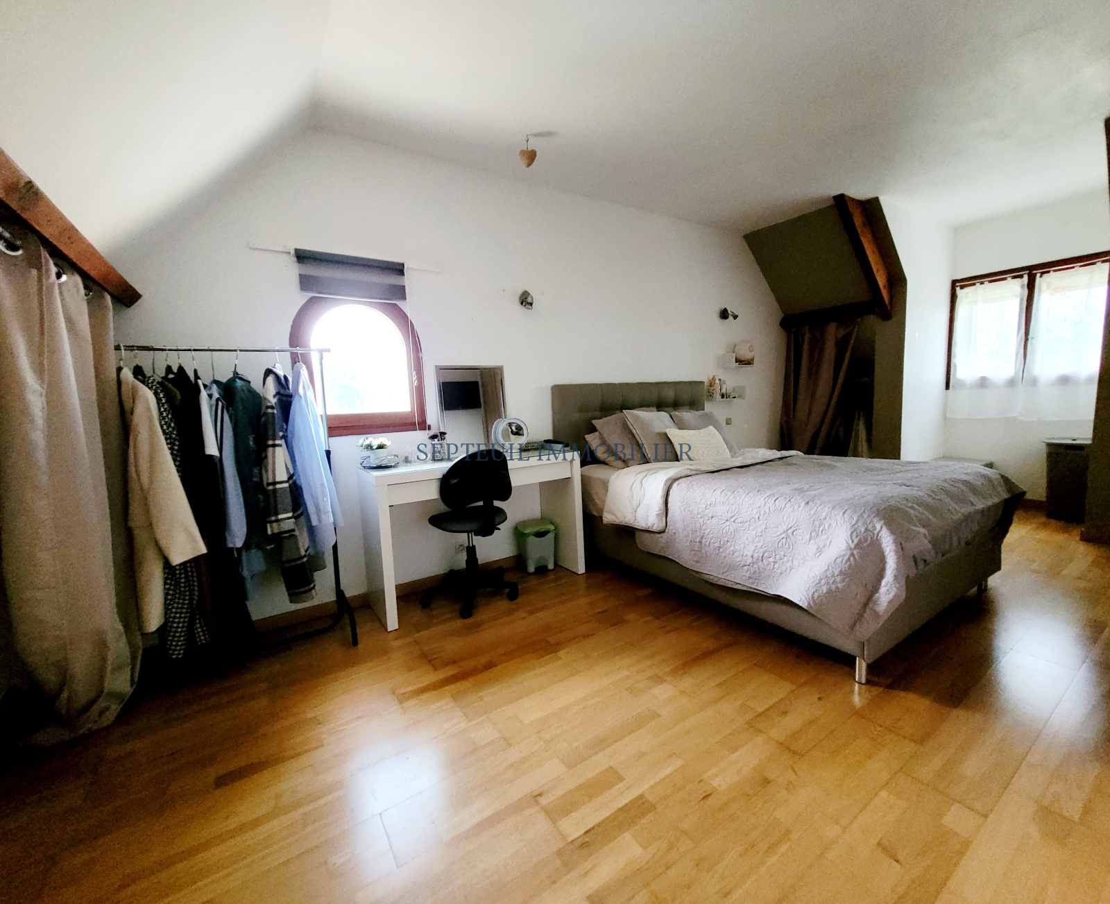 A l'étage : le palier distribue 3 chambres avec placards, dont une de 20m², salle de douche, WC séparés.