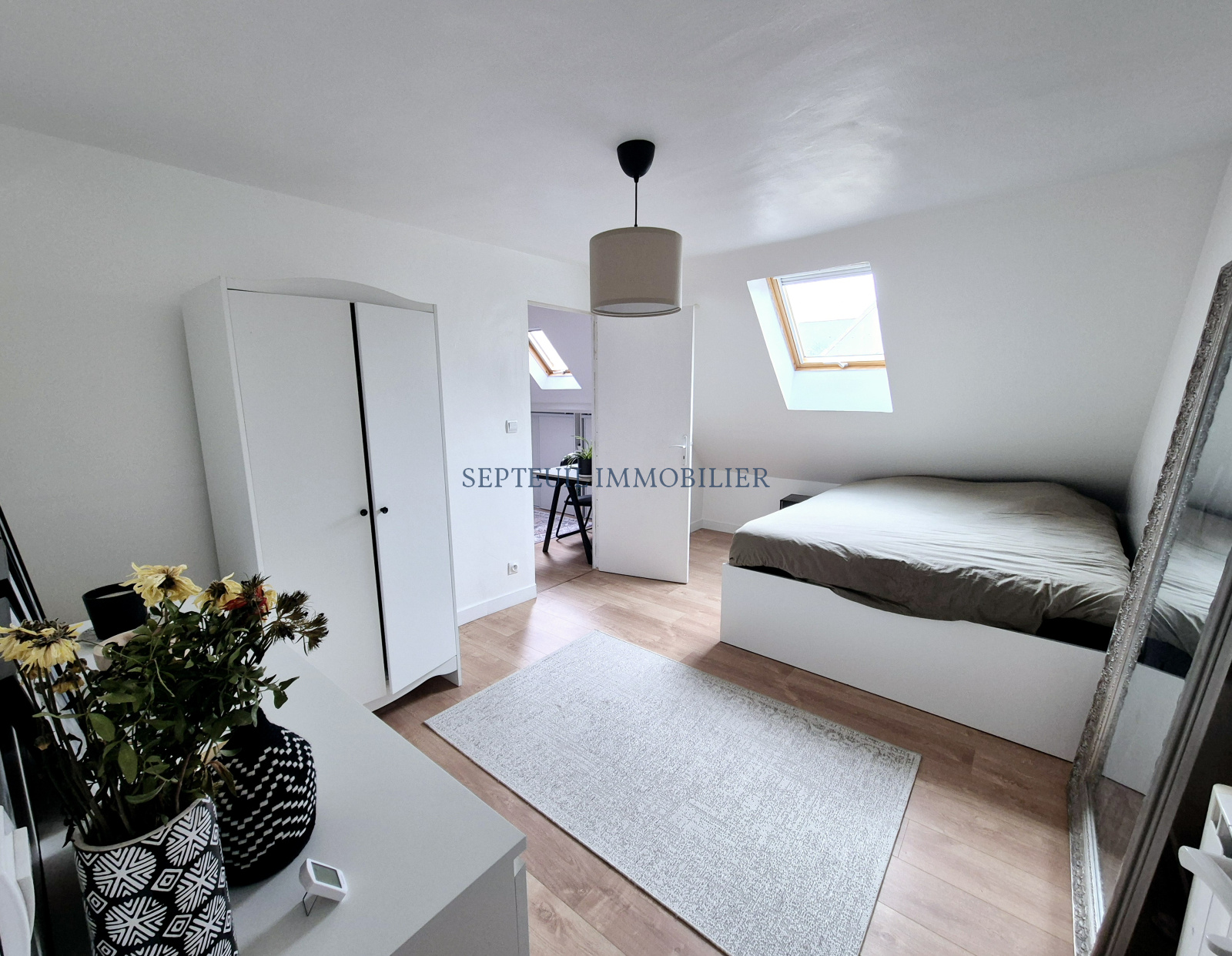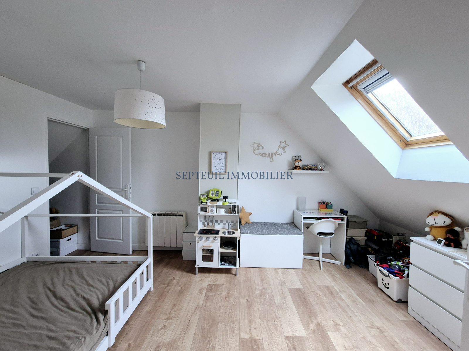 A l'étage : palier bureau distribuant deux grandes chambres avec dressing, salle de bains avec wc.
