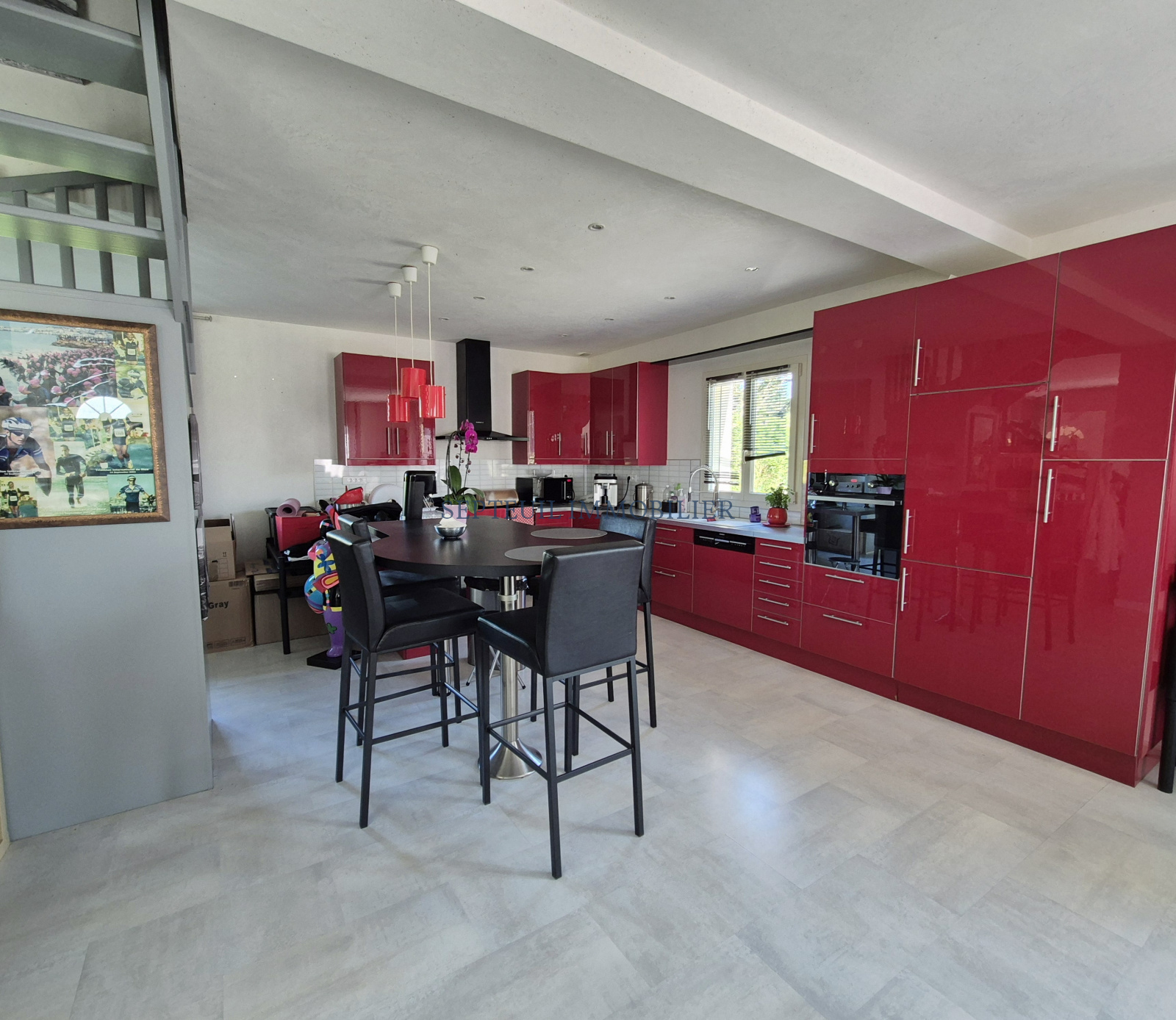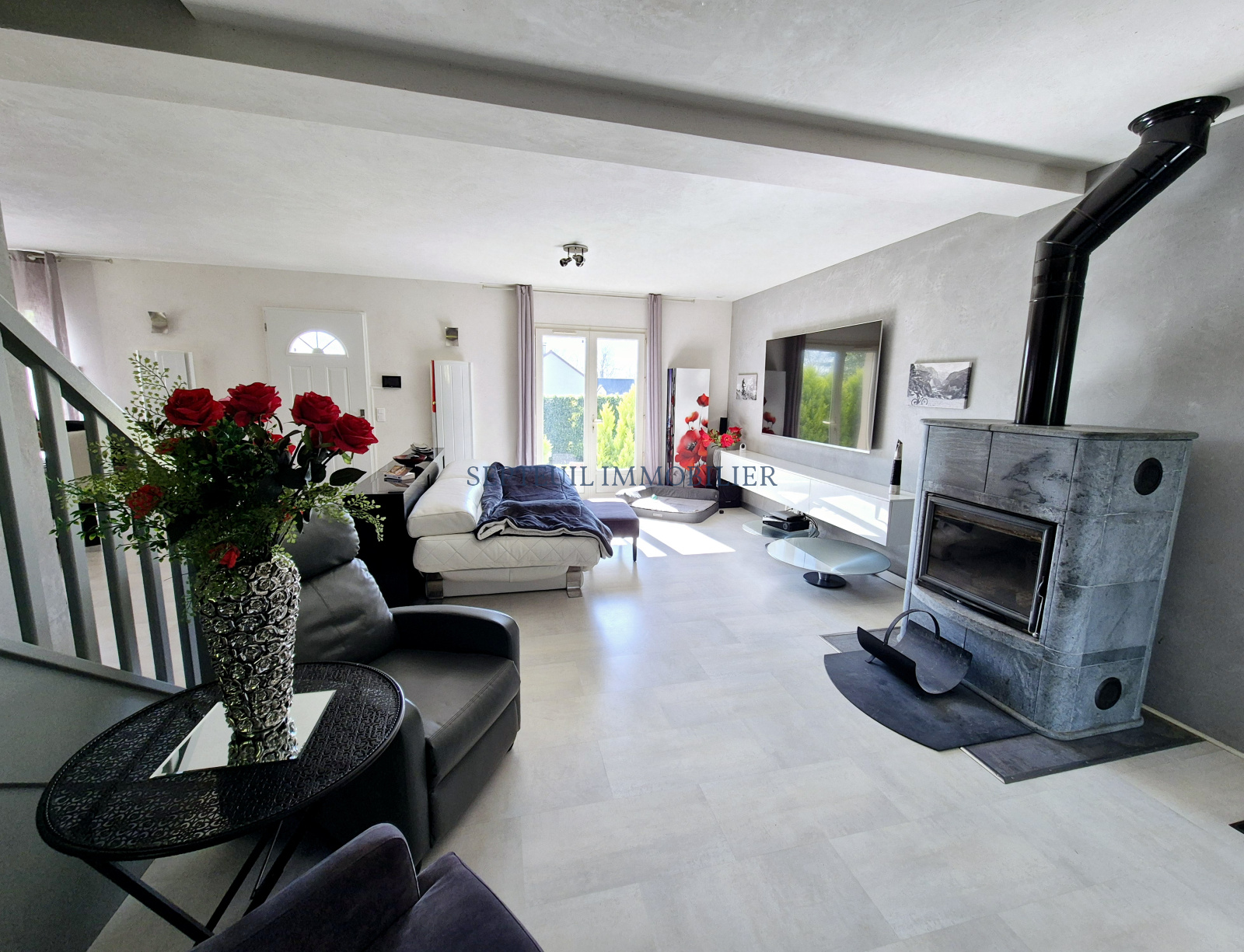 - Au rez-de-chaussée :Grand séjour lumineux 70 m² avec poêle à bois (pierre de lave) et cuisine dinatoire aménagée équipée, dressing, wc indépendant.