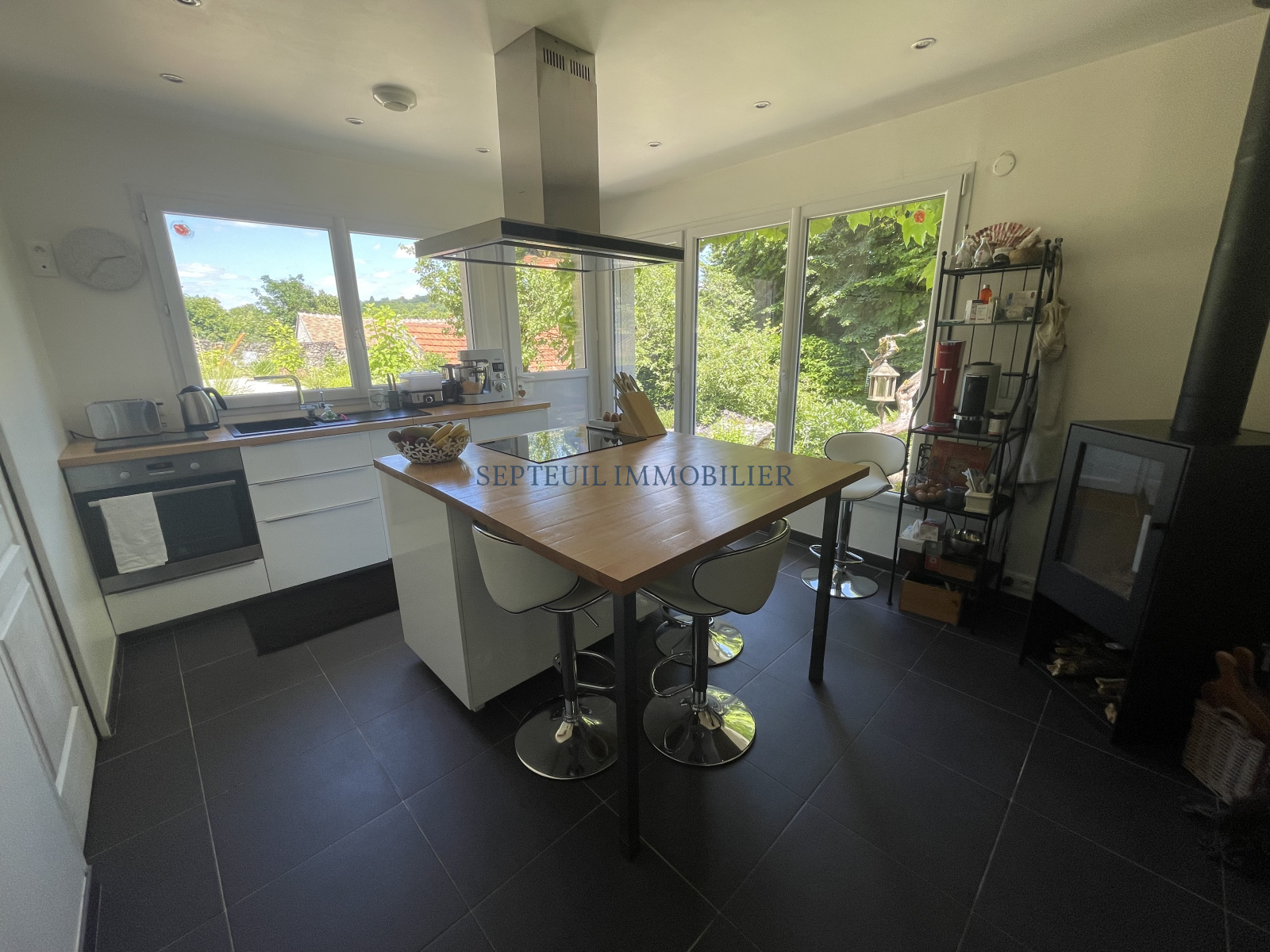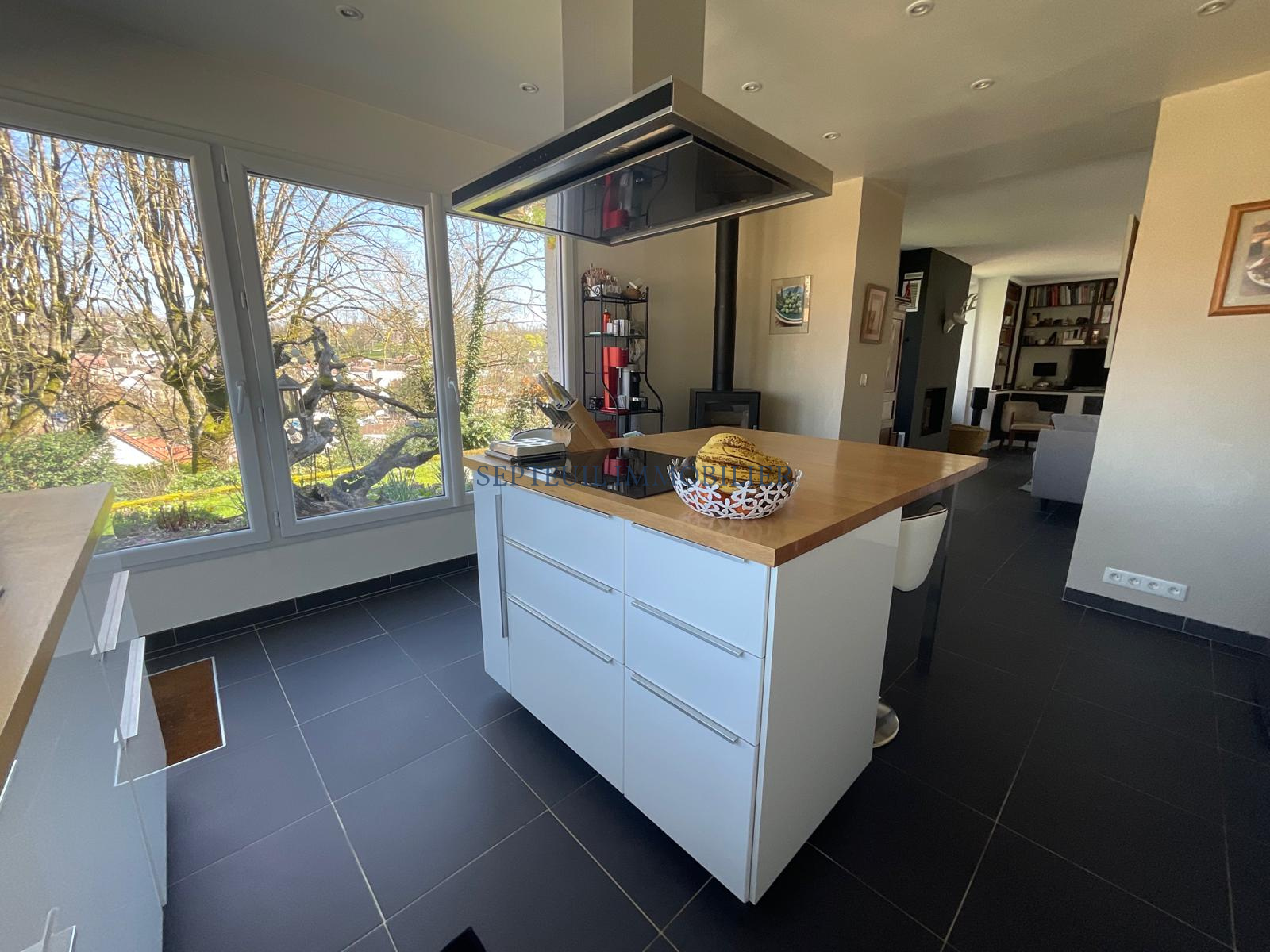 Au rez-de-chaussée : entrée sur séjour de 50 m² avec cheminée insert, cuisine aménagée équipée avec ilôt central et pôele à bois, une suite parentale avec baignoire douche et dressing, wc, chaufferie.
