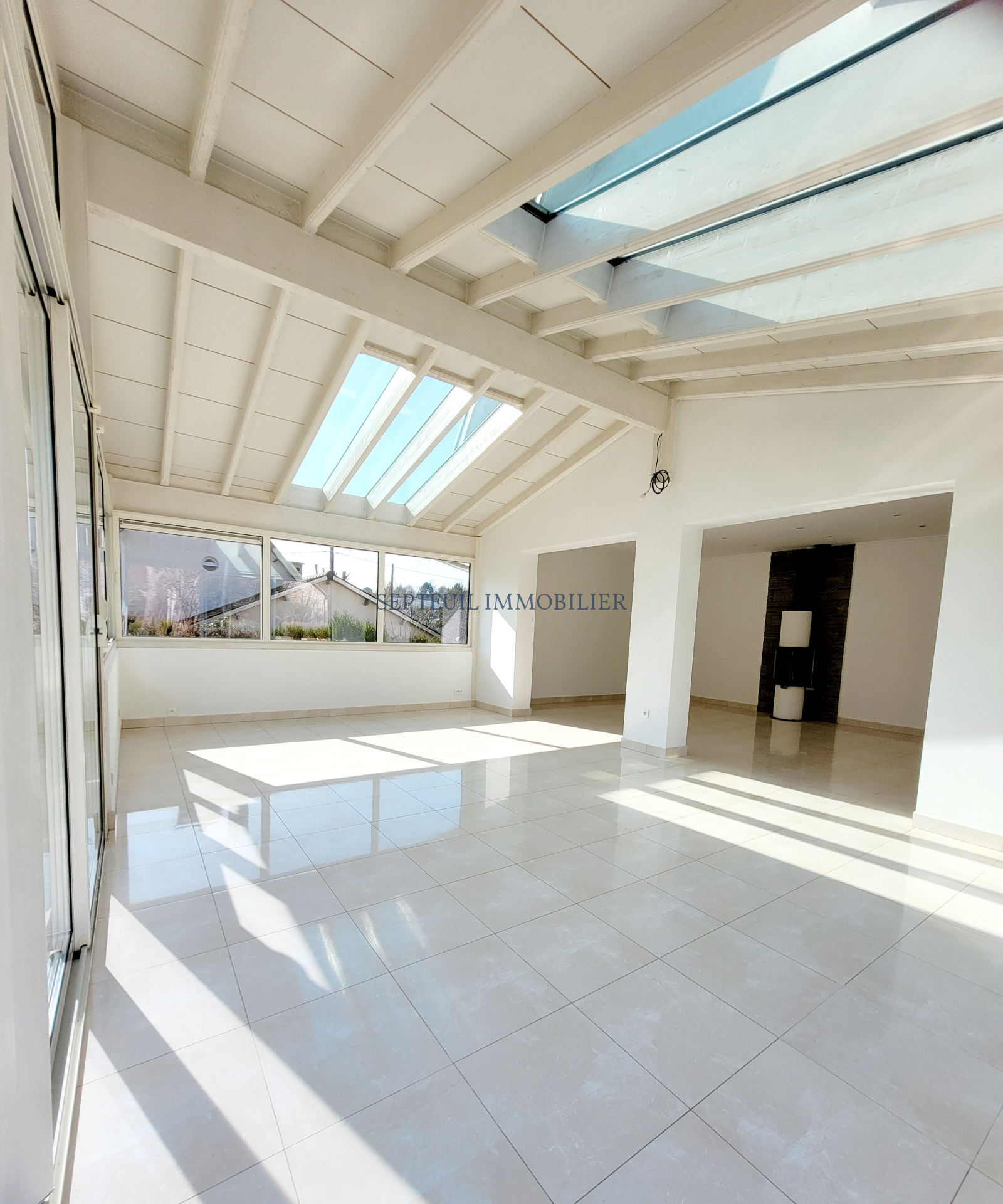 - Au rez-de-chaussée entrée, séjour avec poêle 53 m², grande cuisine dînatoire équipée de 21 m², une chambre, salle de bains, wc, dressing.