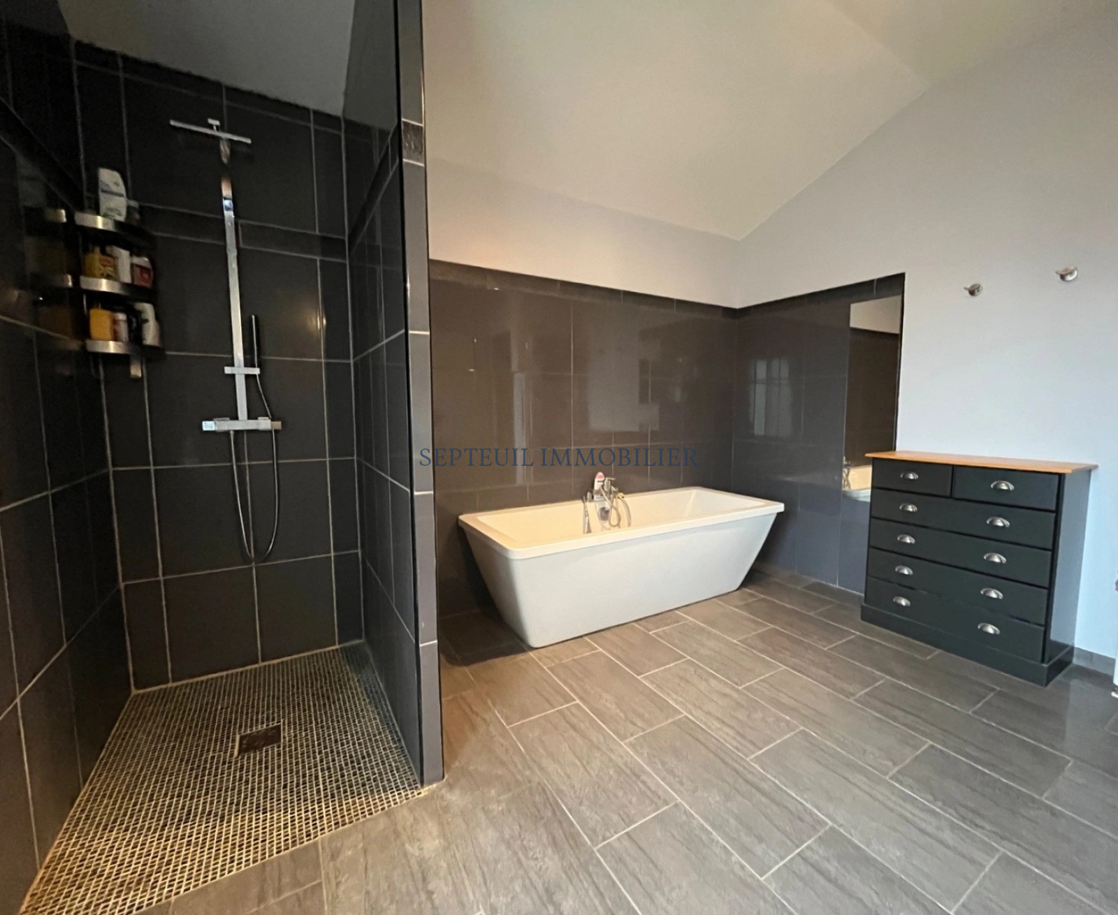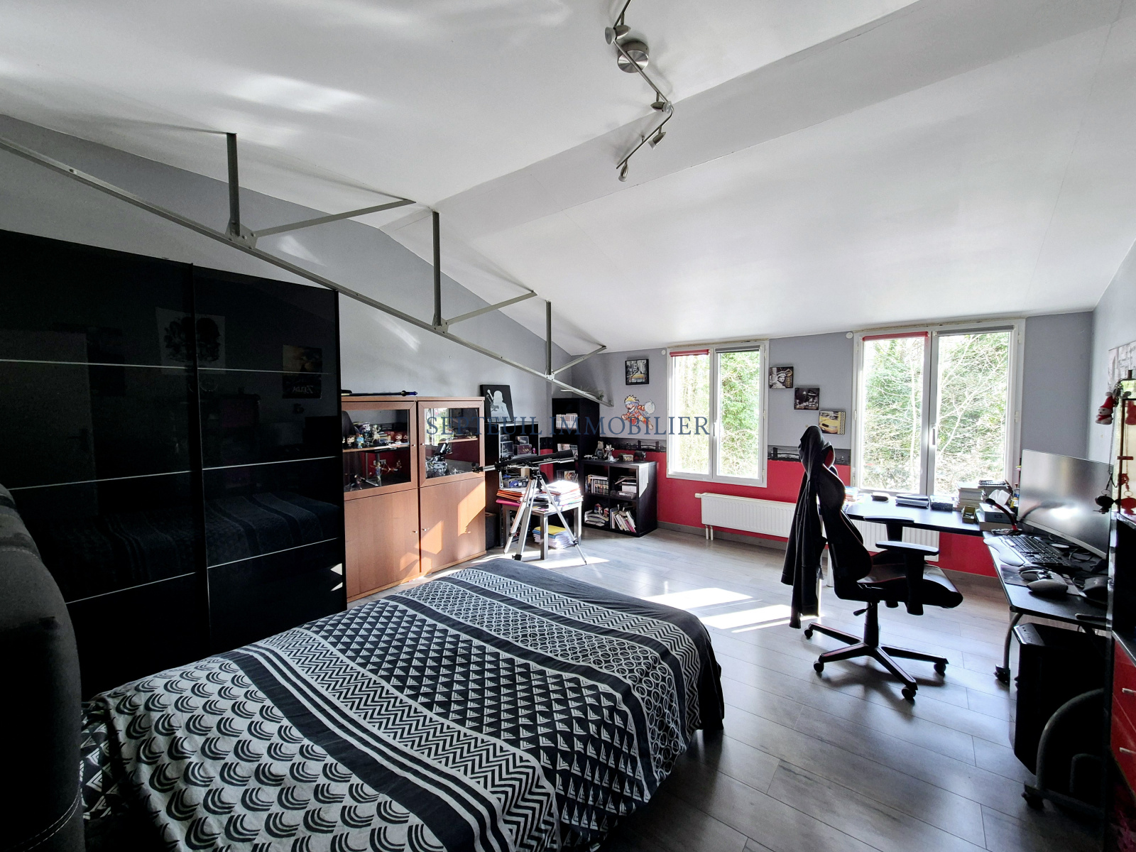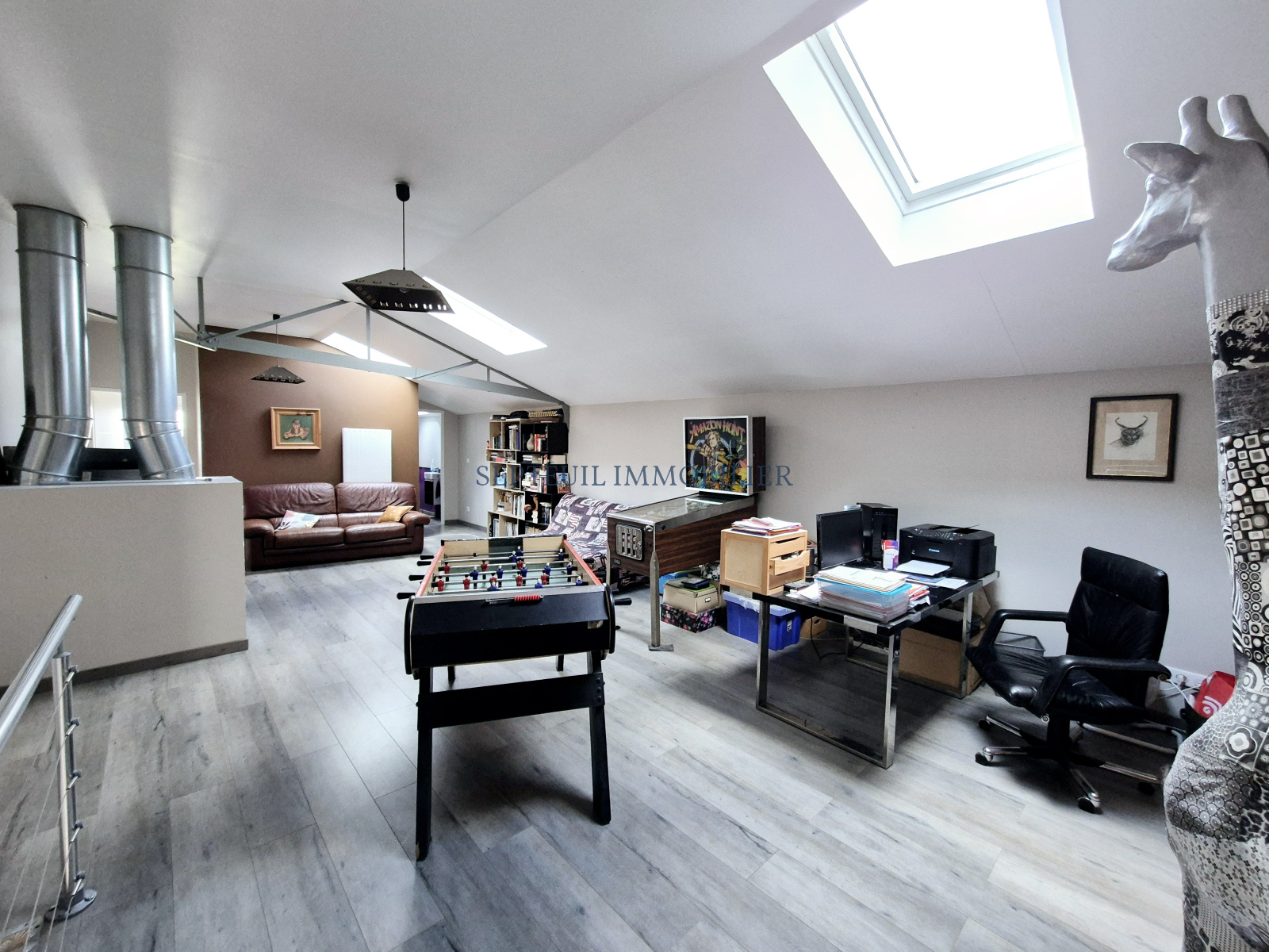 - Une maison d'habitation esprit loft, composée au rez-de-chaussée d'un séjour avec poêle à bois de 47m², cuisine équipée, dégagement, salle de douche, une chambre. A l'étage une pièce salle de jeux bureau 47 m², trois grandes chambres, salle de bains avec douche, wc.