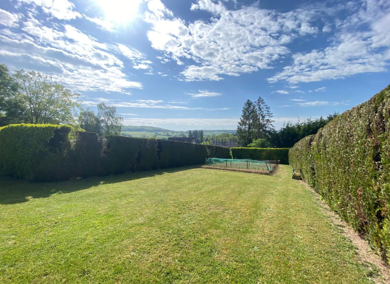 Très beau terrain plat, arboré et clos, au calme et sans vis-à-vis de 2 000 m². 2 terrasses dont une dominant la vallée. Grand potager.