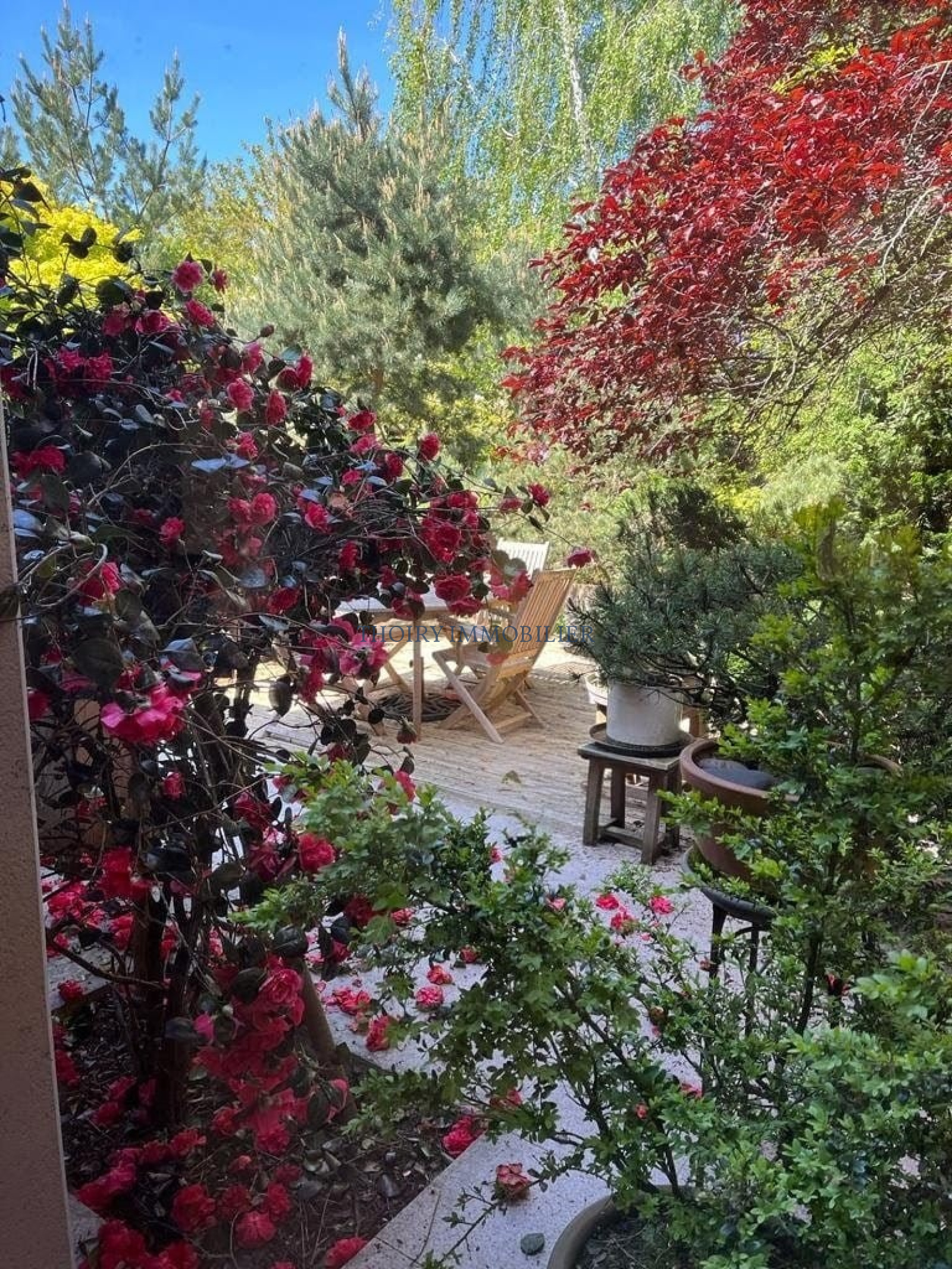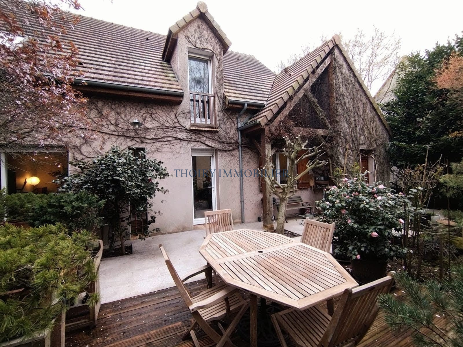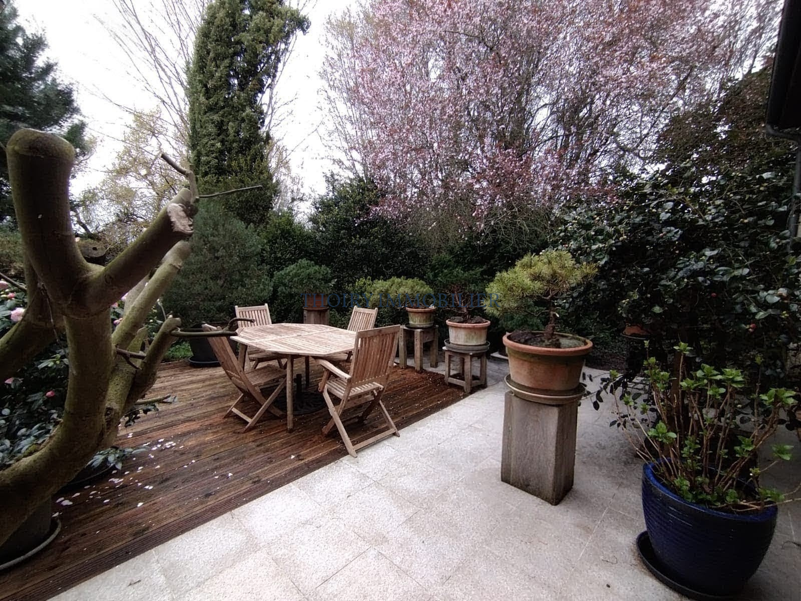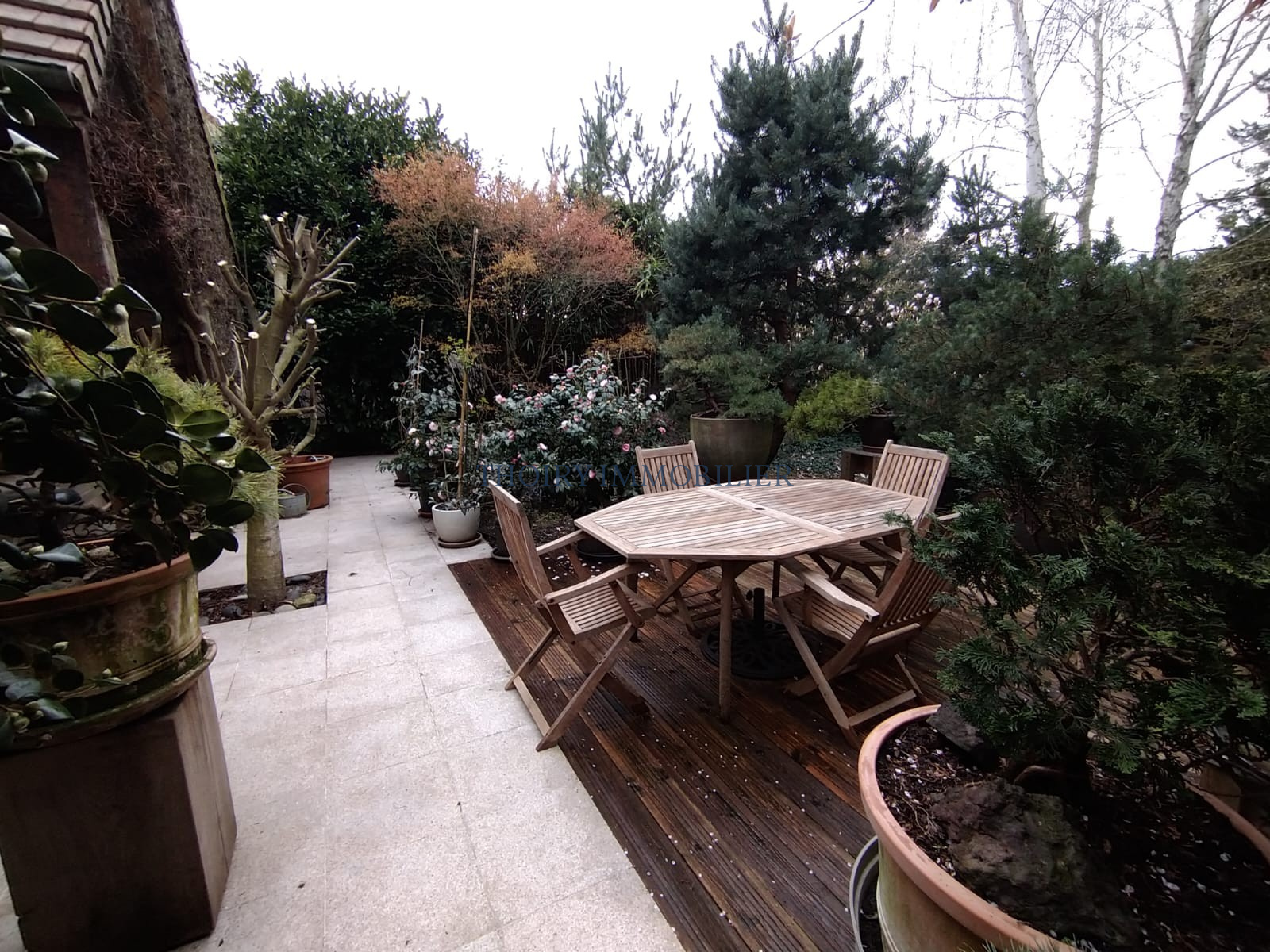 Terrasse en granit et bois. Garage moto/atelier avec grenier au dessus.