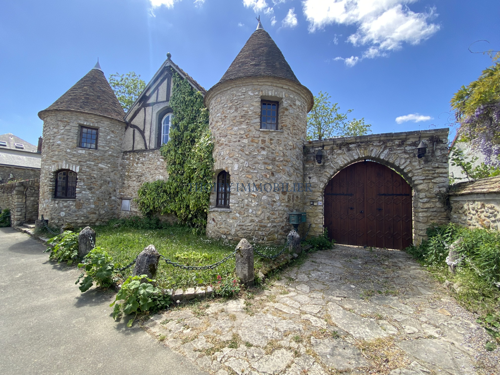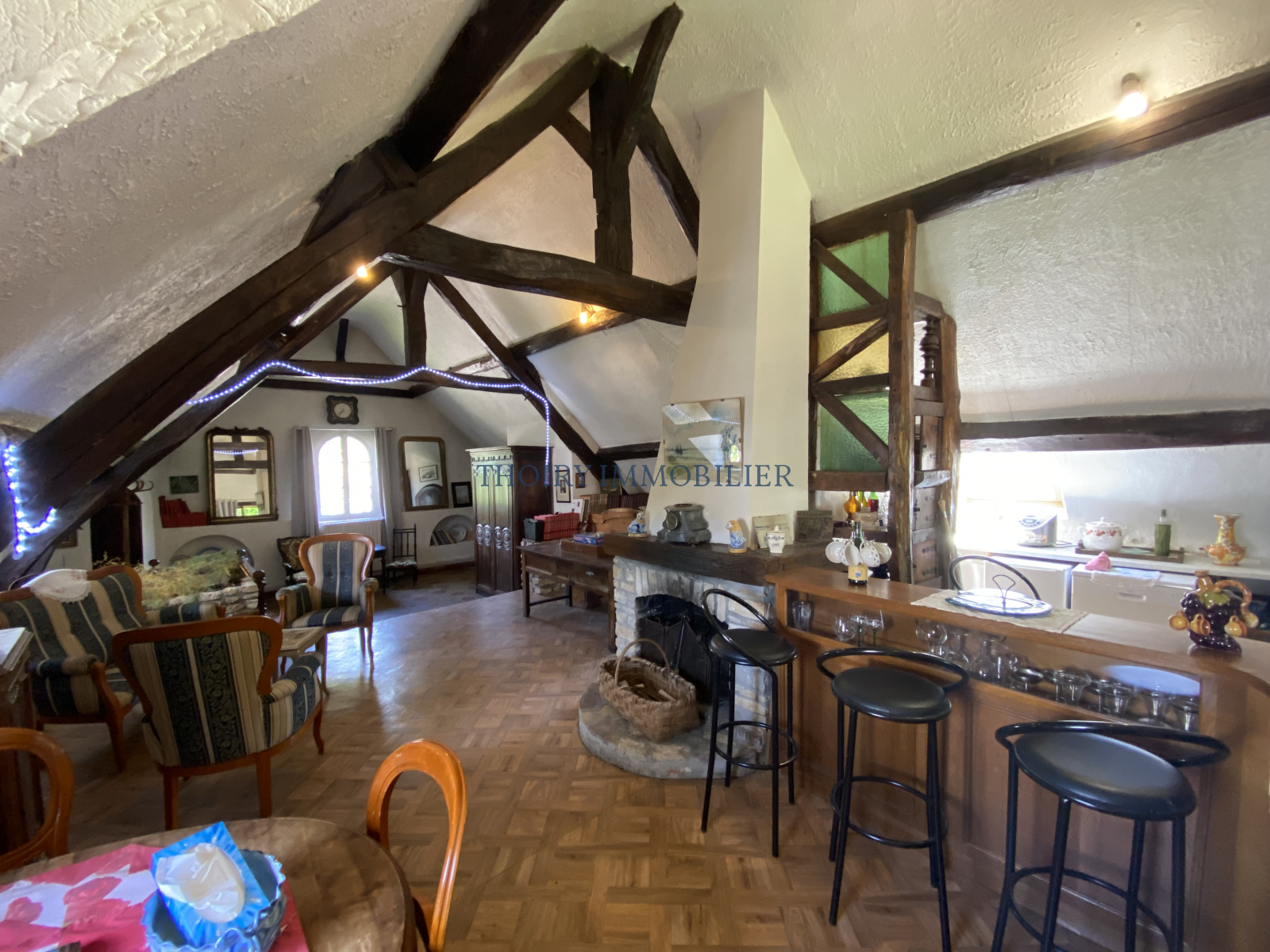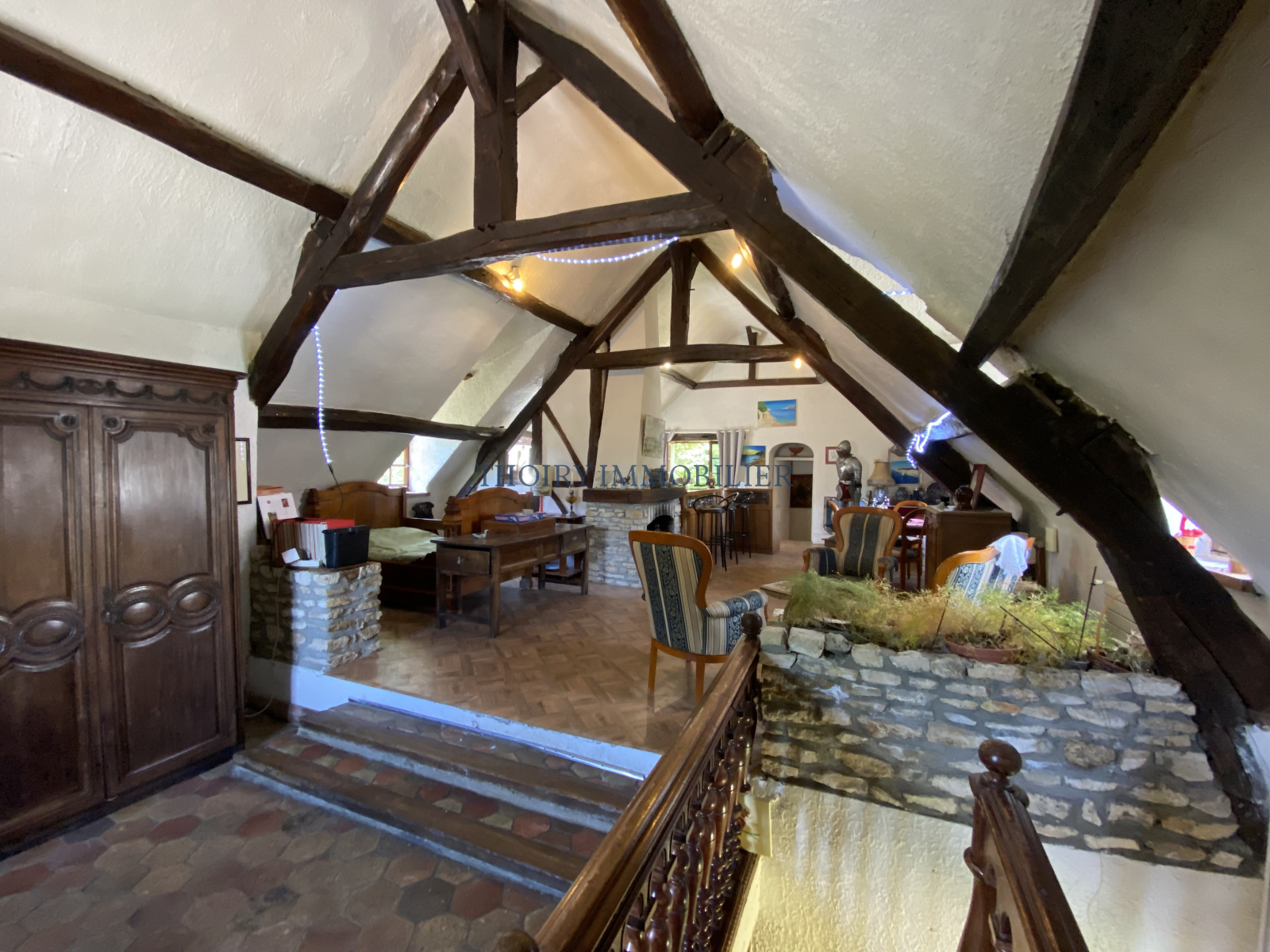 Au 1er étage: Palier/ dégagement, grand séjour cathédrale de 75 m² avec cheminée, 4 chambres, salle de bains et salle de douche.
