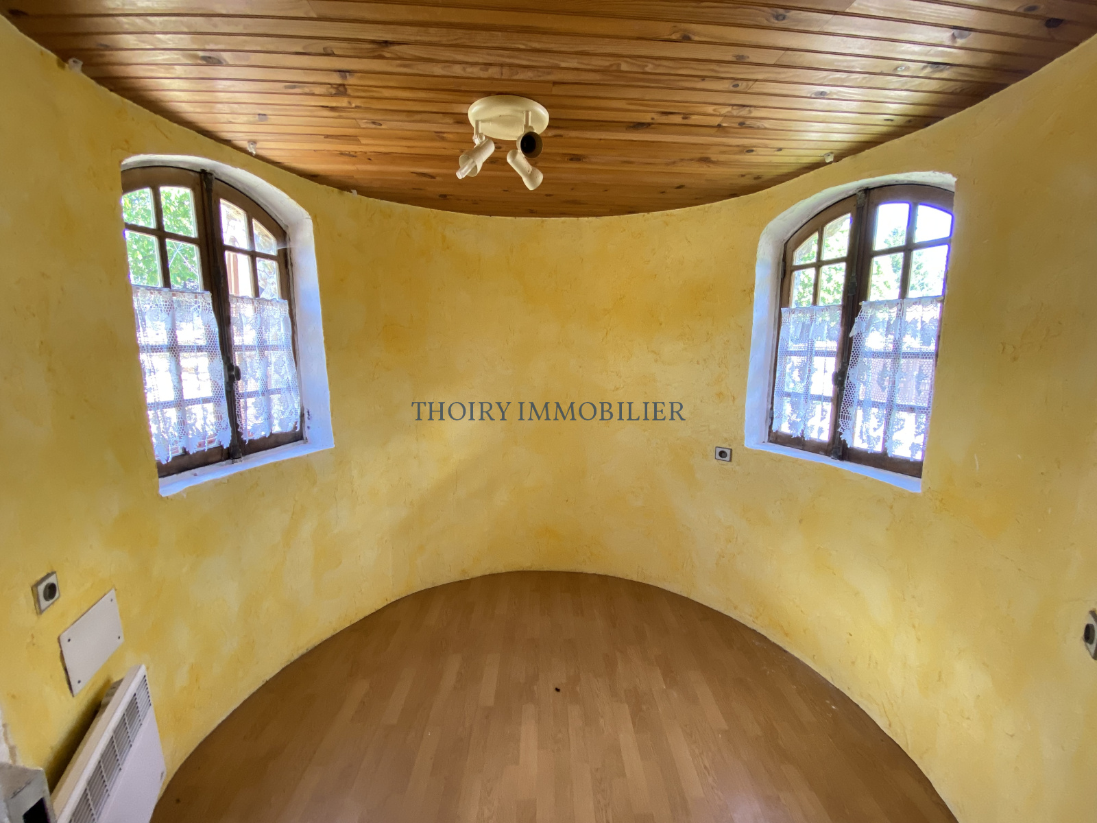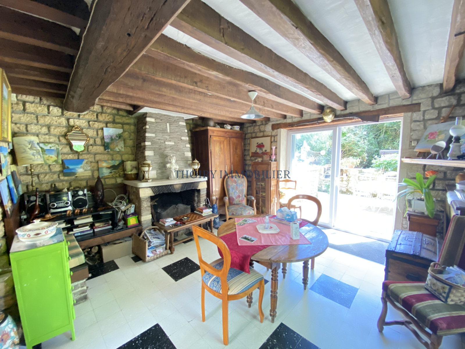 Superbe maison en pierres apparentes de 1800 comprenant au rez de chaussée: 2 salons, 2 cuisines et une chambre pouvant être réunis pour former un espace unique de vie de 65 m², salle de douche + wc, bureau.