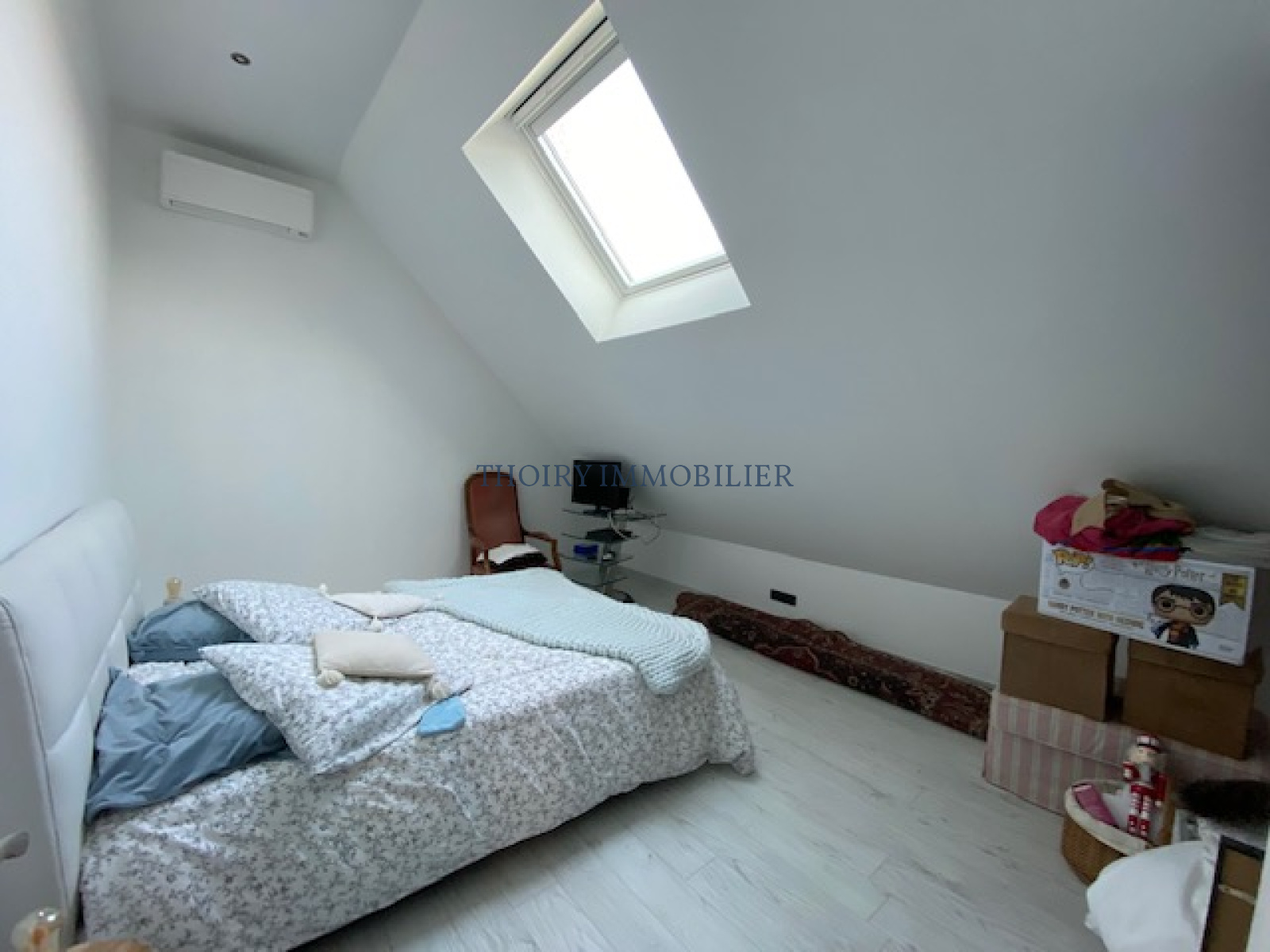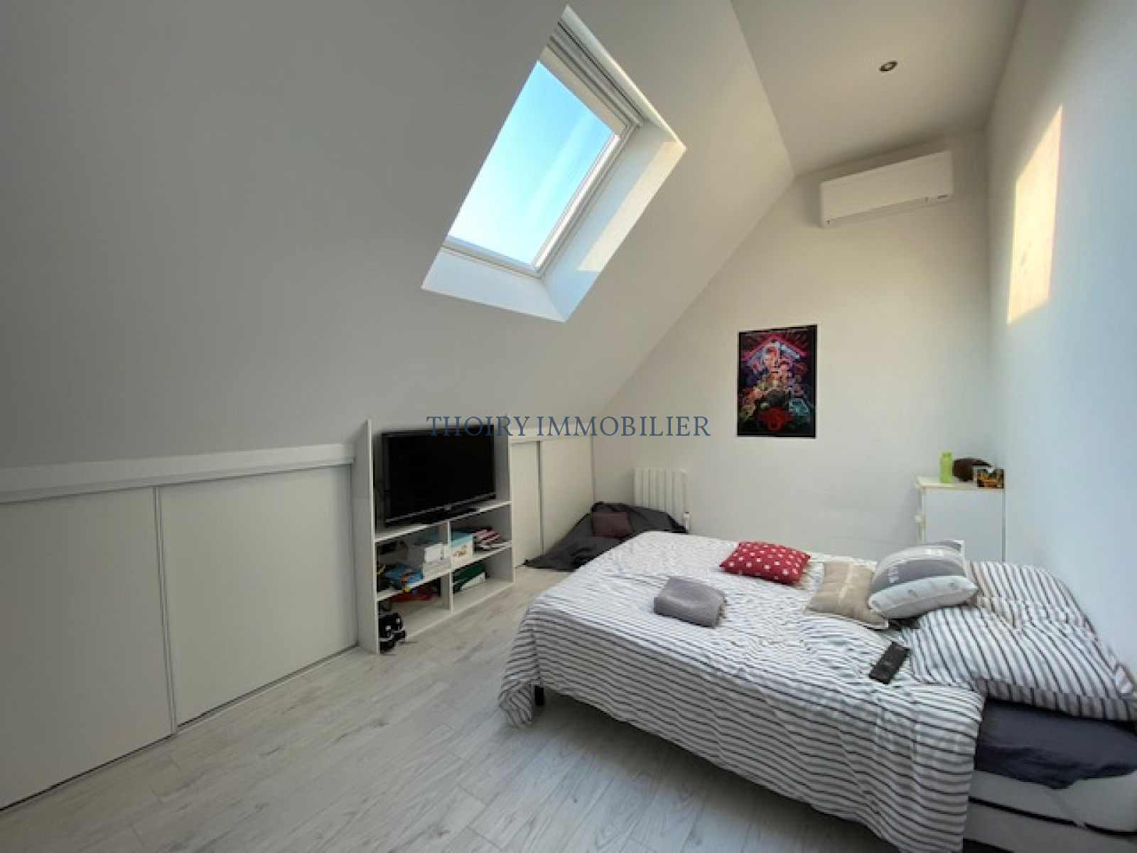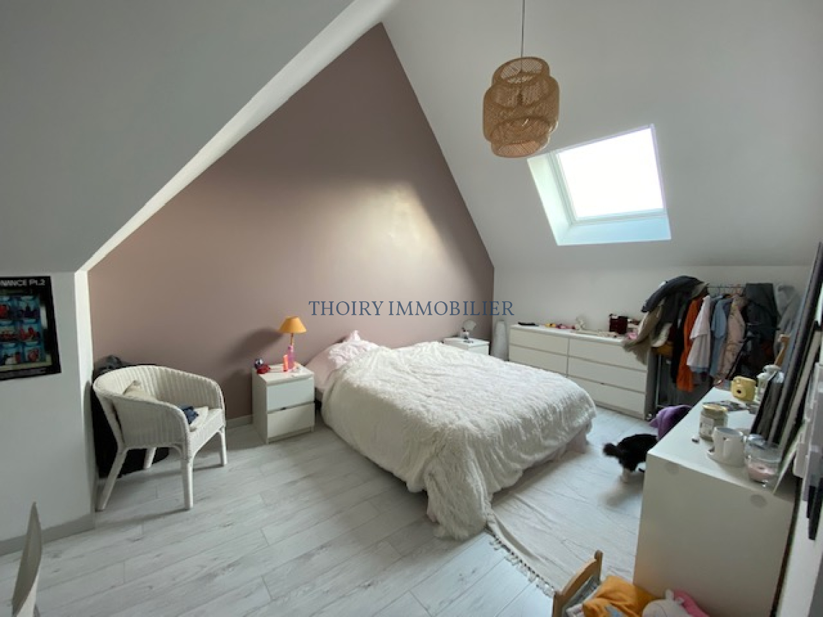 A l'étage : un vaste palier mezzanine menant à 3 chambres avec dressings, salle de bains avec douche.