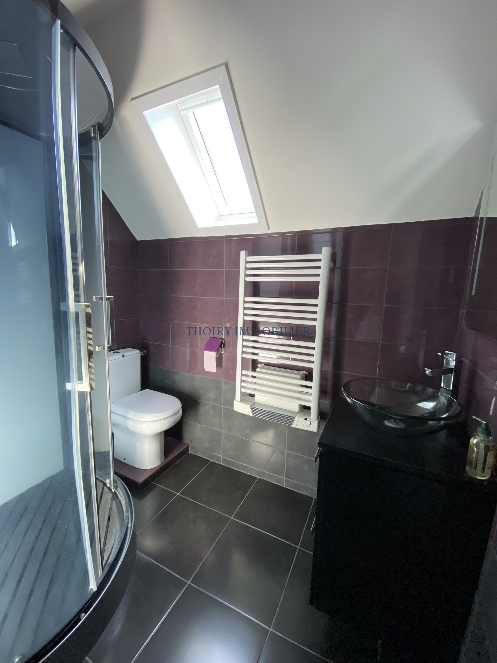 A l'étage : un palier avec placard desservant 2 chambres (3 possible) et une salle de douche avec wc.