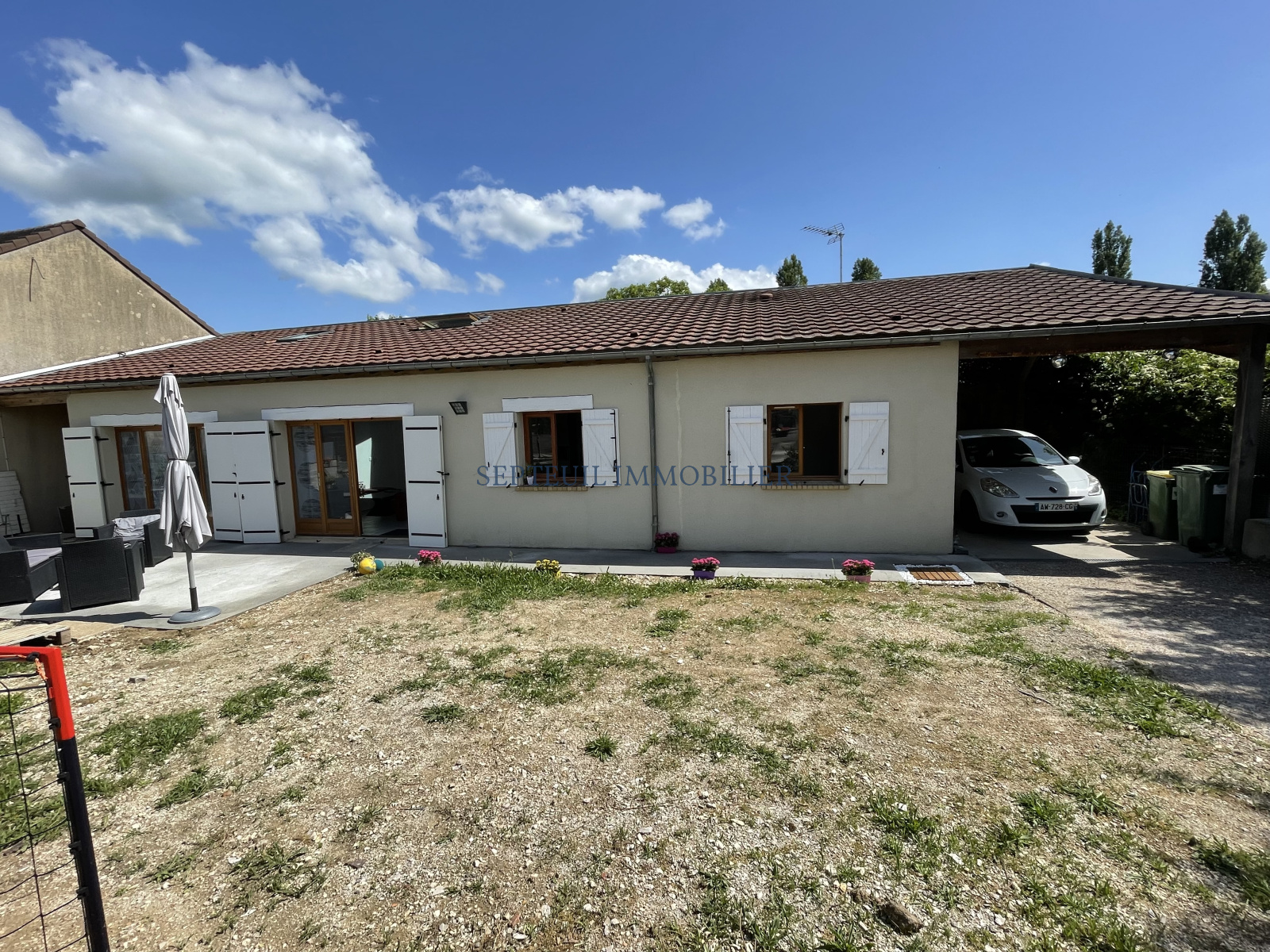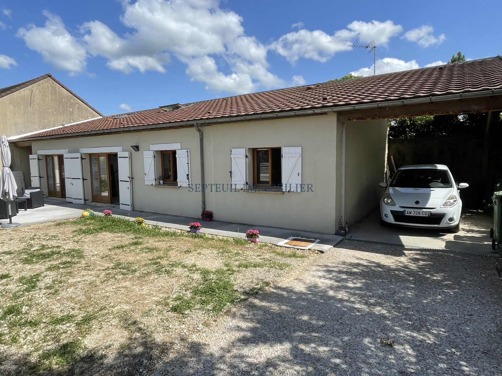 En annexe : une cave de 16 m², un auvent et une place de stationnement extérieure dans la petite impasse commune aux 3 maisons.