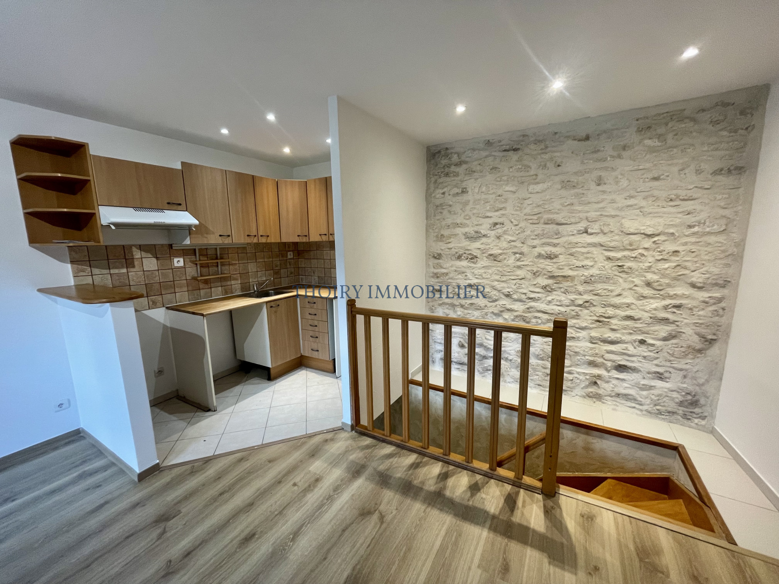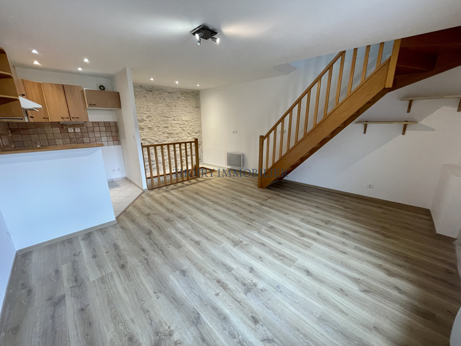 A l'étage : séjour avec cuisine US aménagée.