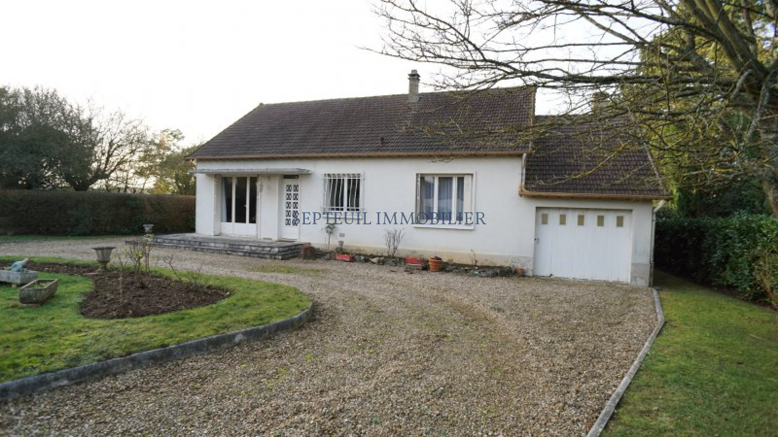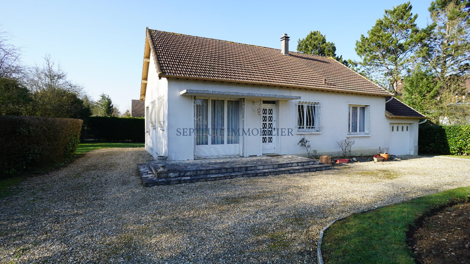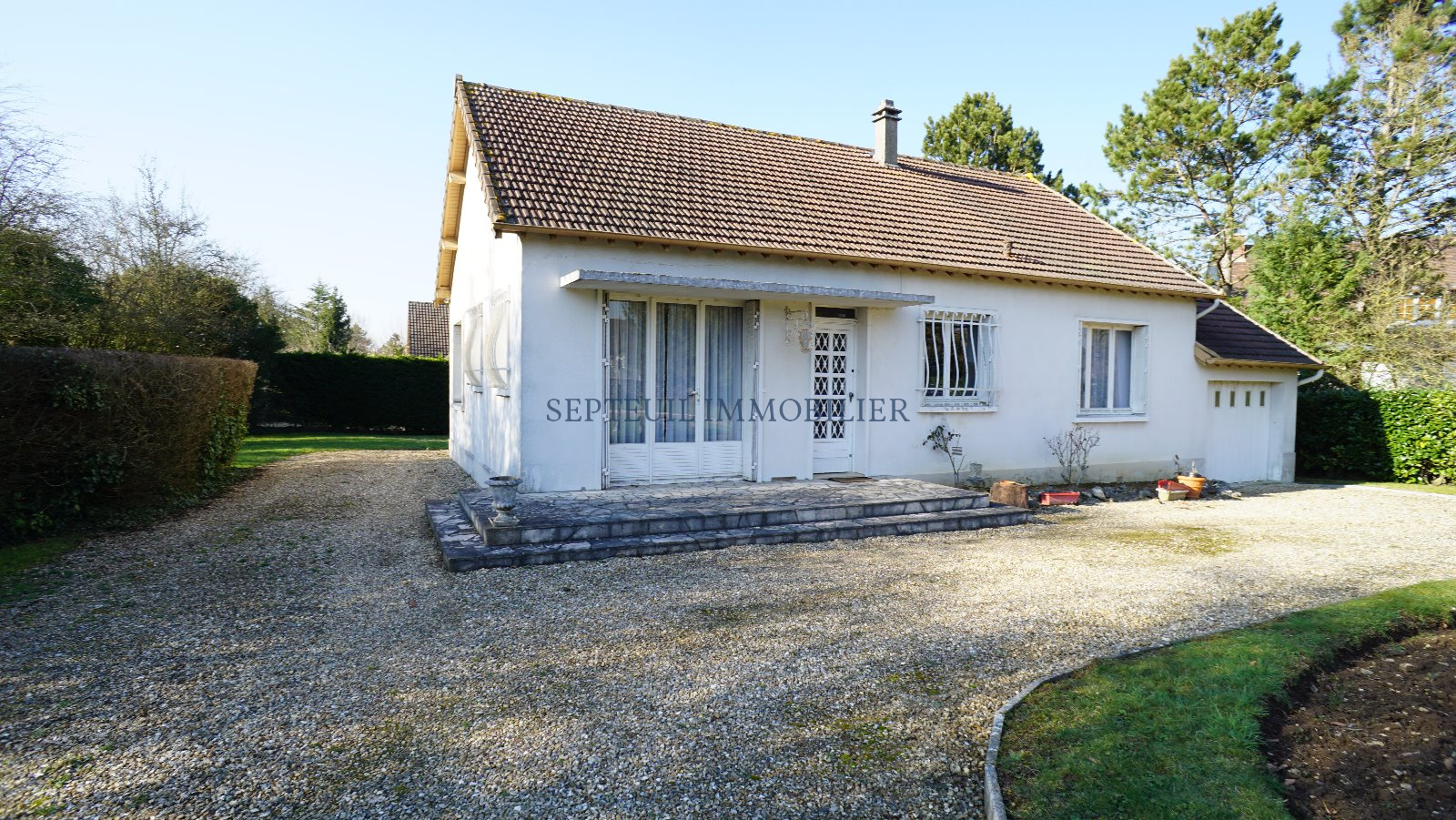 Maison de plain-pied de 1967 comprenant : entrée, séjour avec cheminée, cuisine équipée, 3 chambres, salle de bains, wc, garage et buanderie.