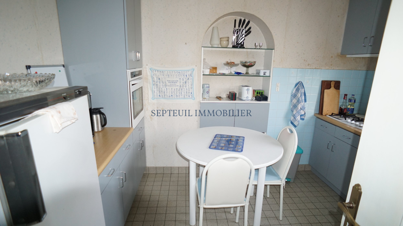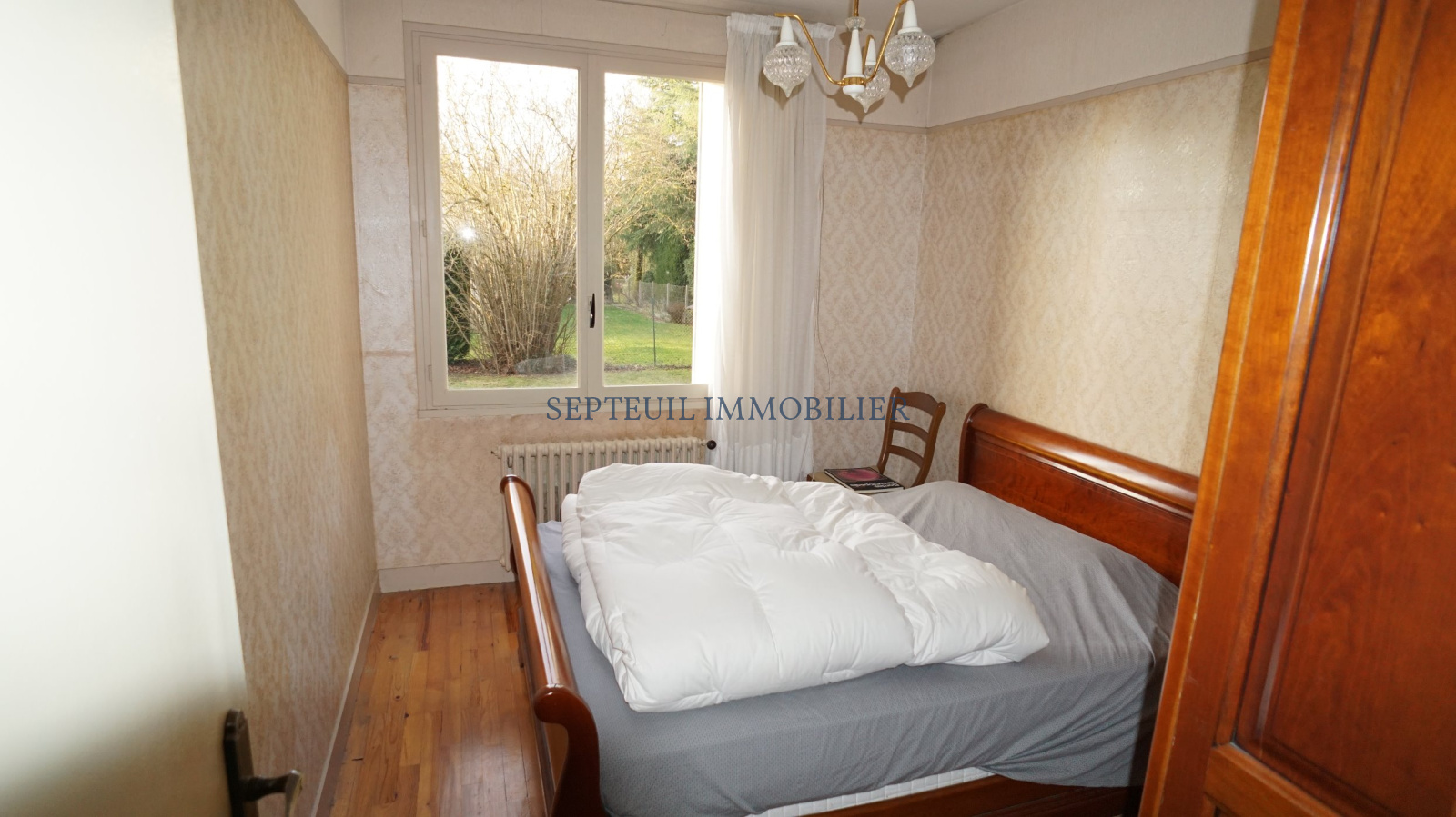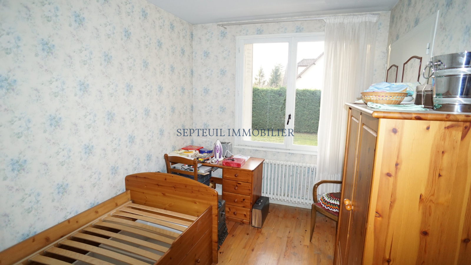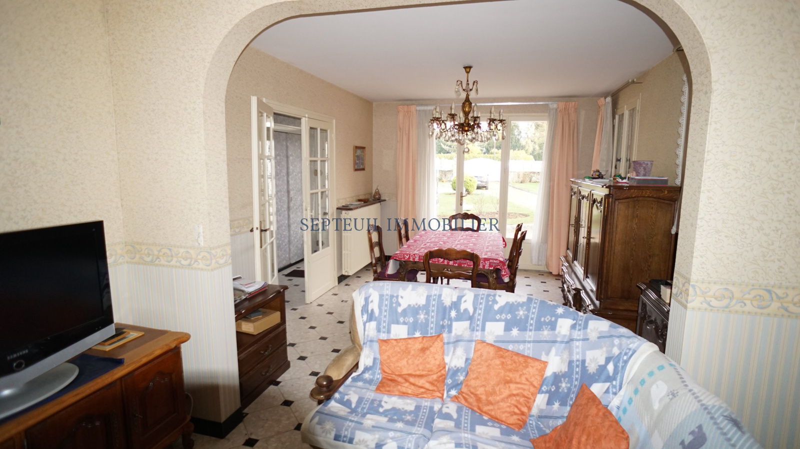 Maison de plain-pied de 1967 comprenant : entrée, séjour avec cheminée, cuisine équipée, 3 chambres, salle de bains, wc, garage et buanderie.