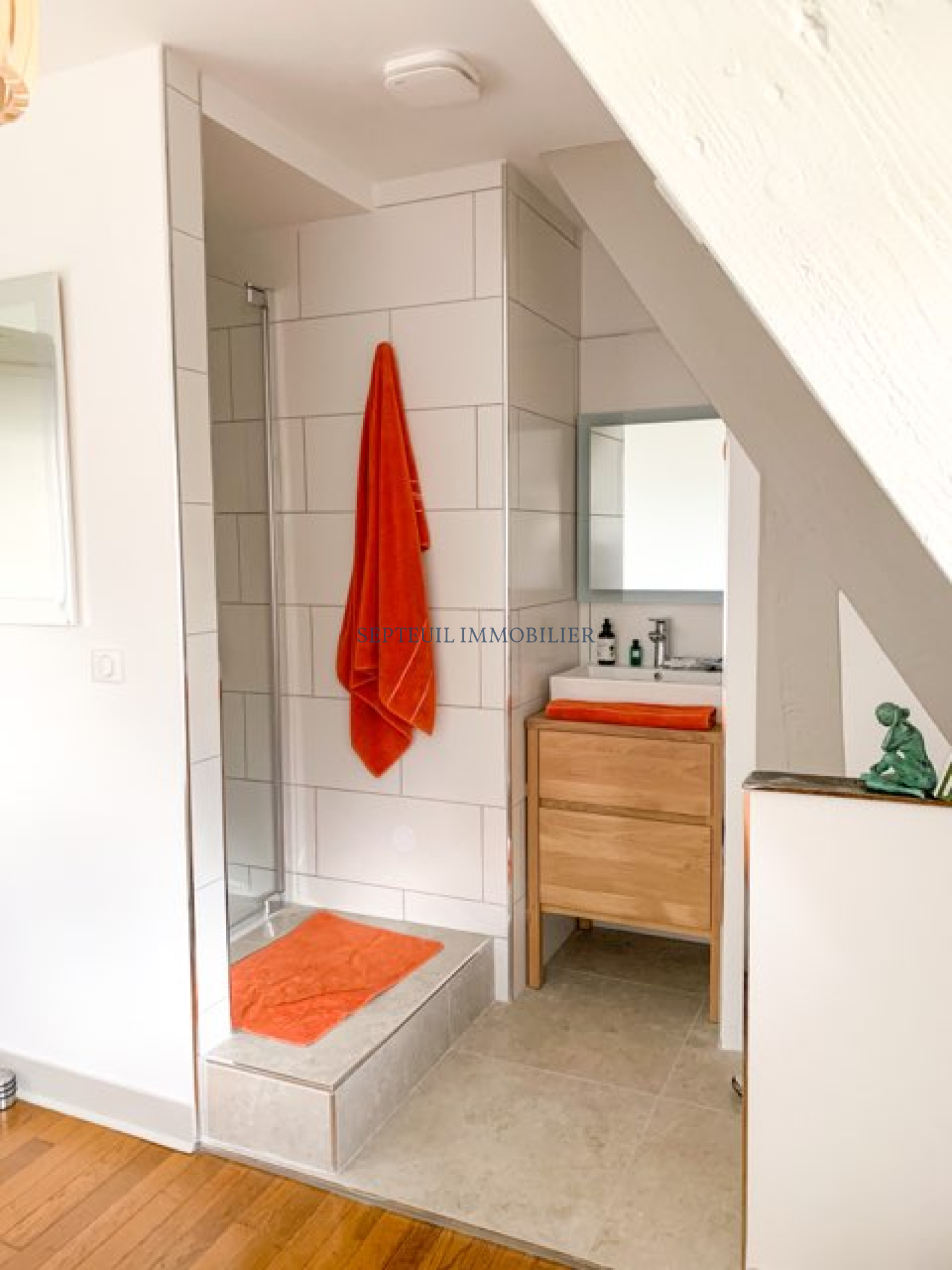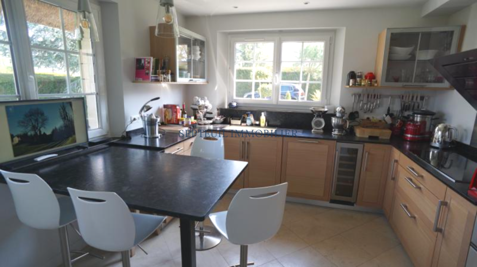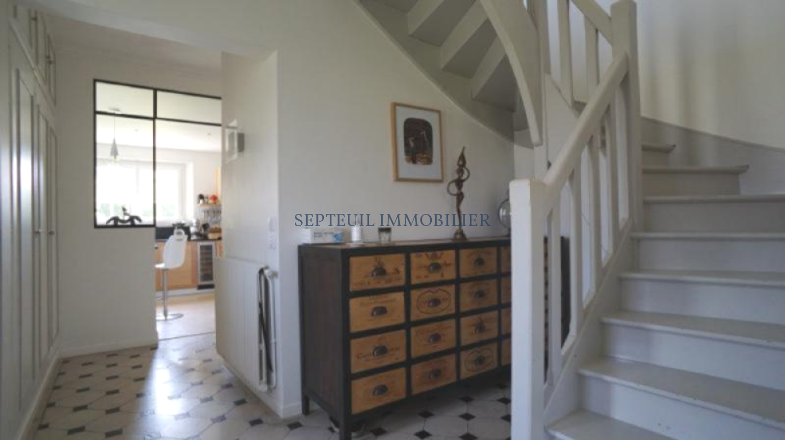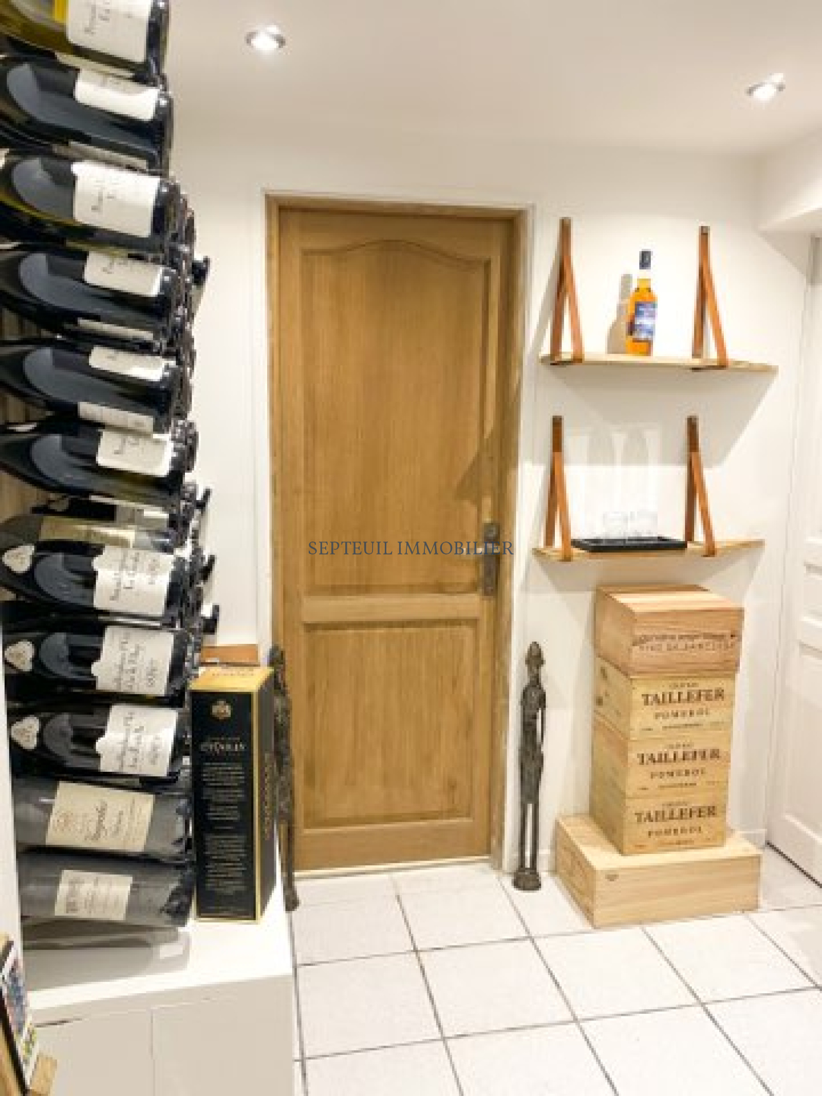 Elle comprend, au rez-de-chaussée : une entrée, un séjour lumineux avec cheminée et un accès sur la terrasse (120m²) exposée sud, une cuisine dinatoire équipée, une suite parentale (avec salle de bains et douche), un bureau, des WC séparés.