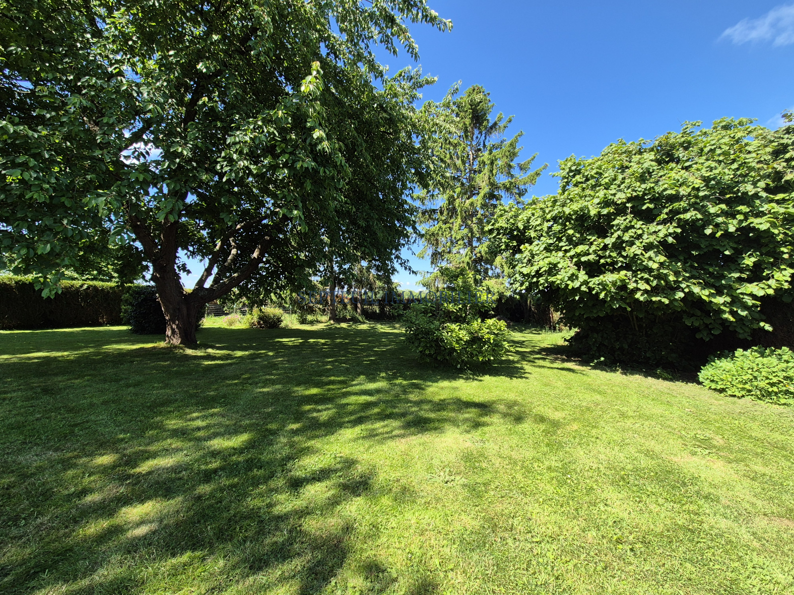 Joli jardin arboré plat, abri bois, récupérateur d'eau.