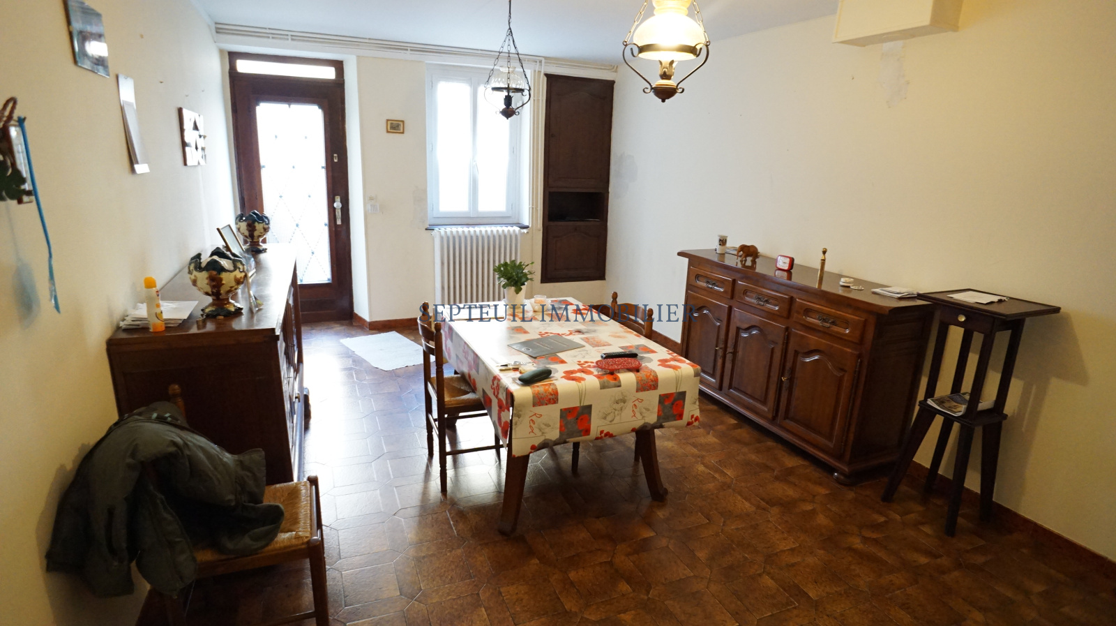 Entrée, séjour, cuisine, grand garage et wc.
