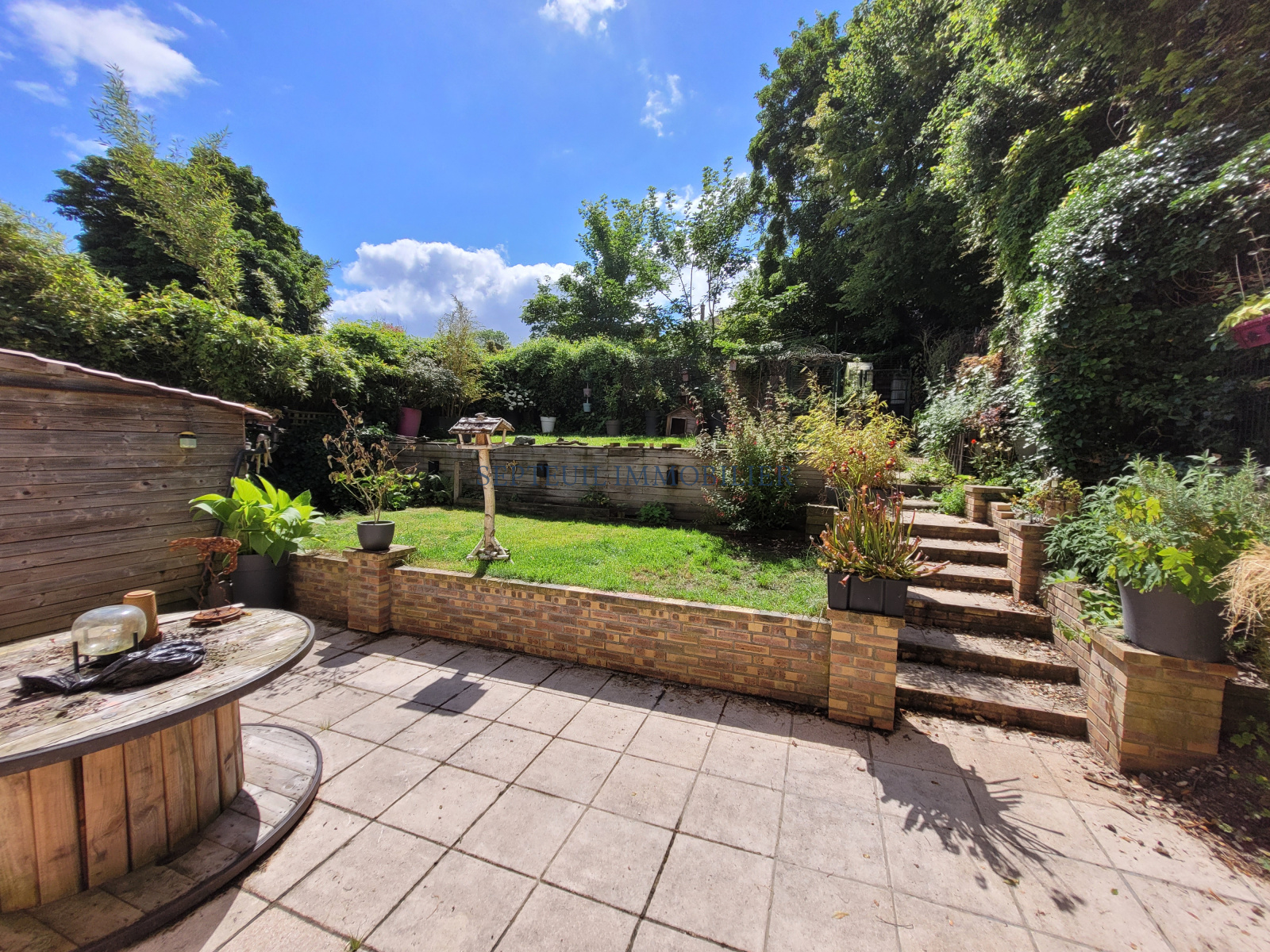 Baies double vitrées avec accès sur terrasse bien exposée, jardin avec cabanon, poulailler, abri bois.