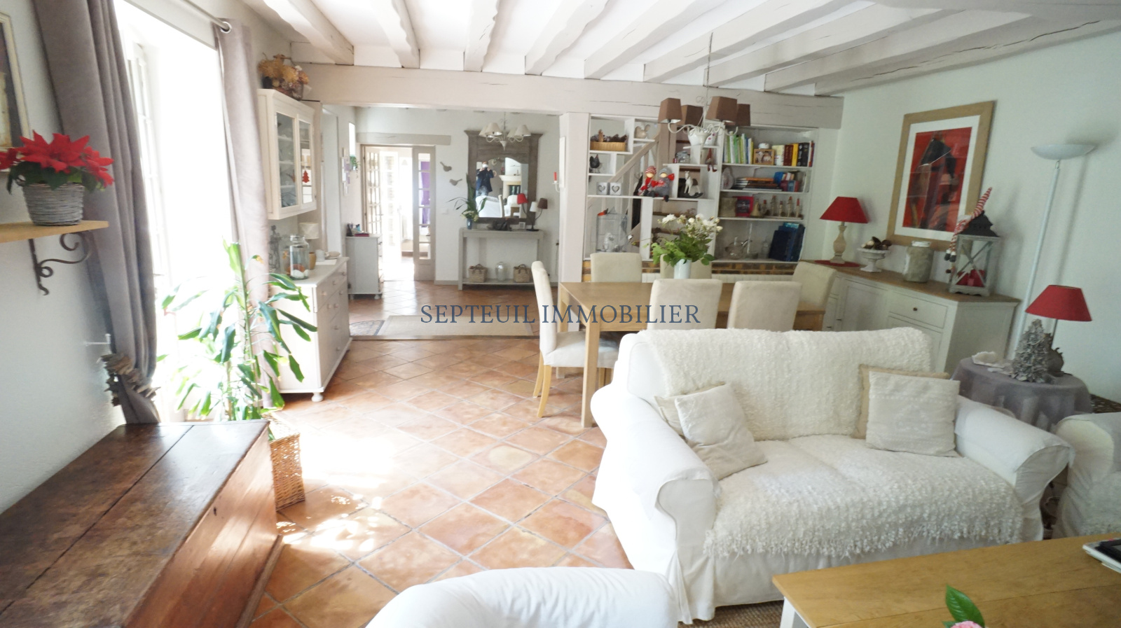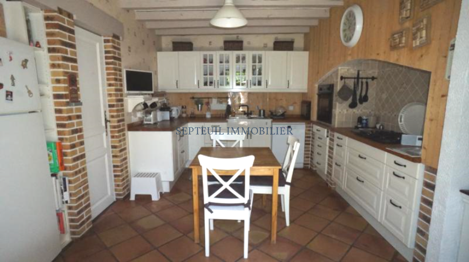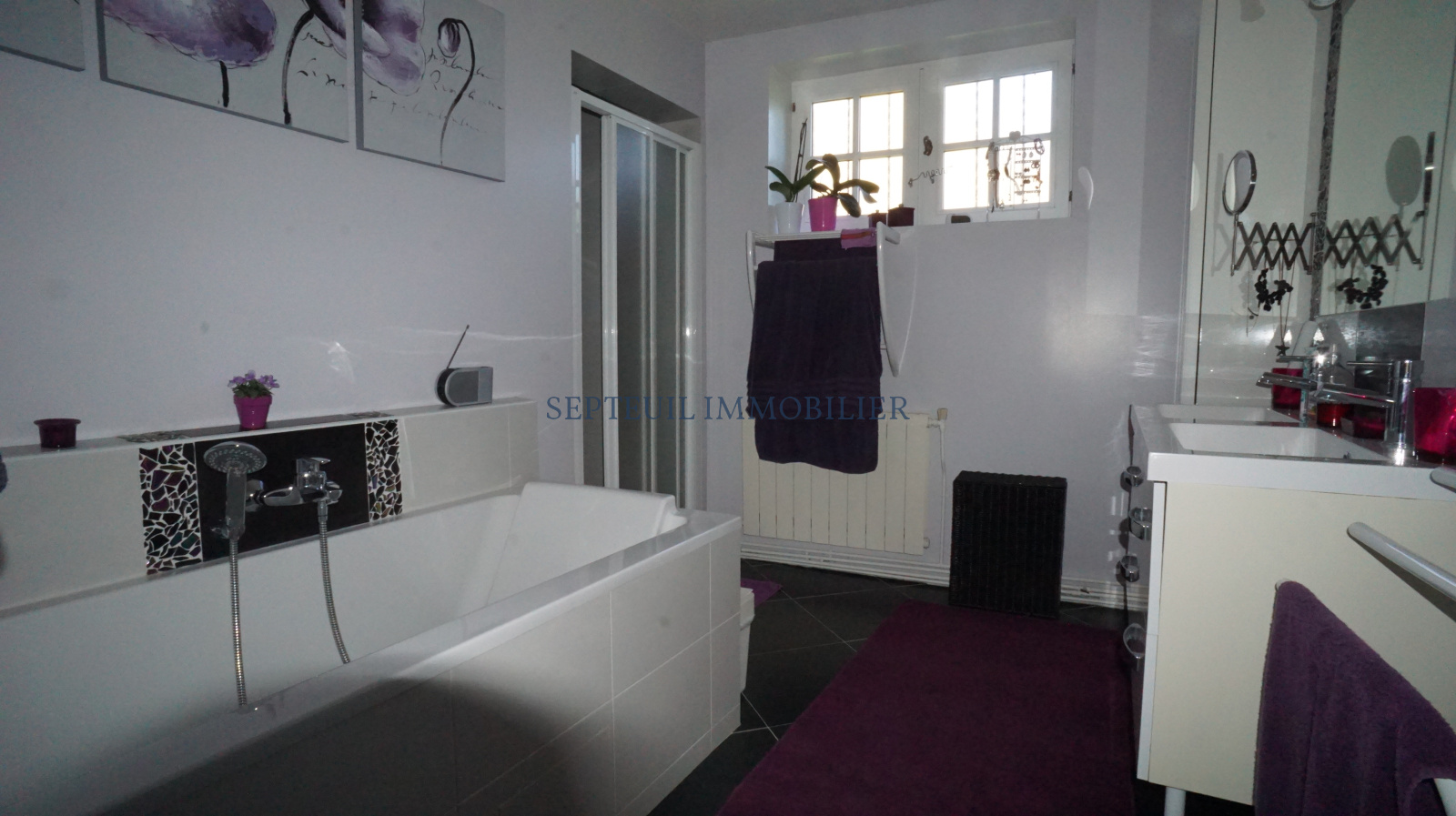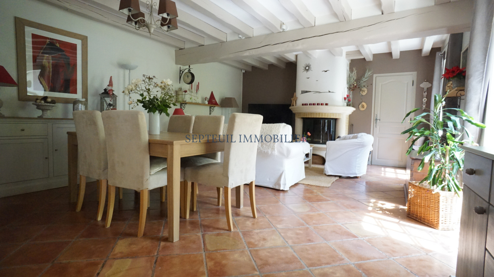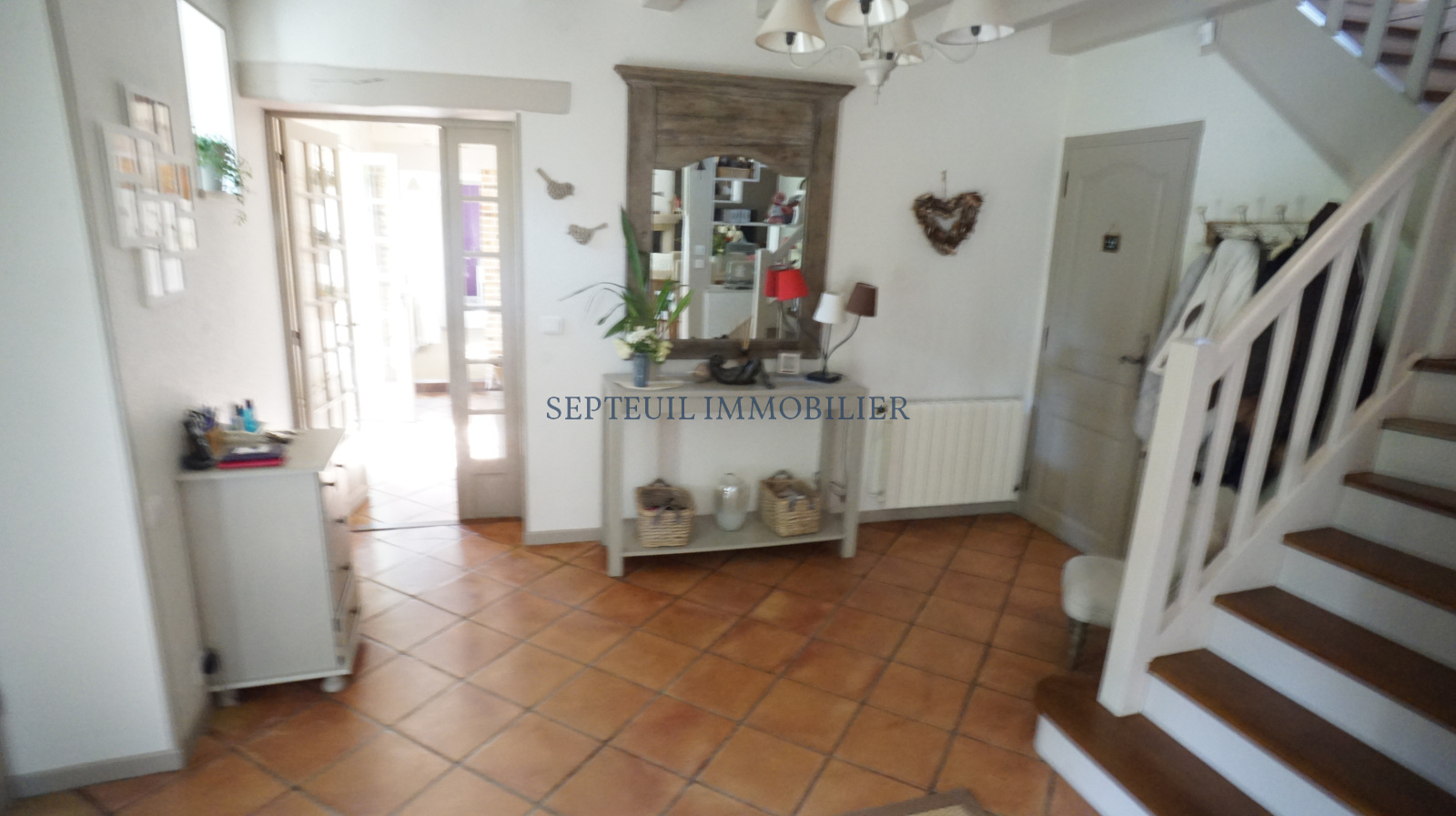 Belle entrée, séjour double avec cheminée, grande cuisine équipée, cellier, une chambre, salle de bains avec baignoire, douche et wc, buanderie et wc.