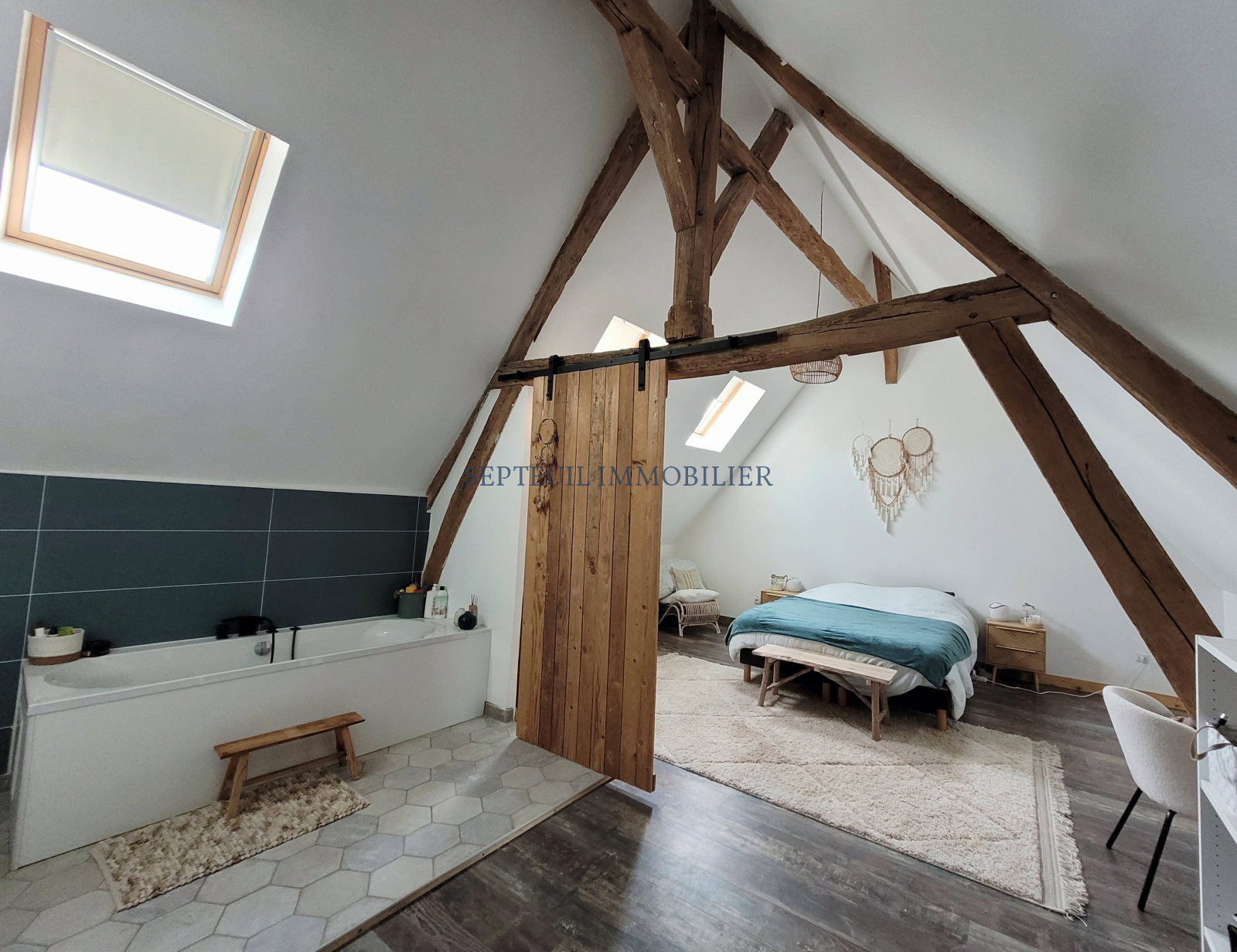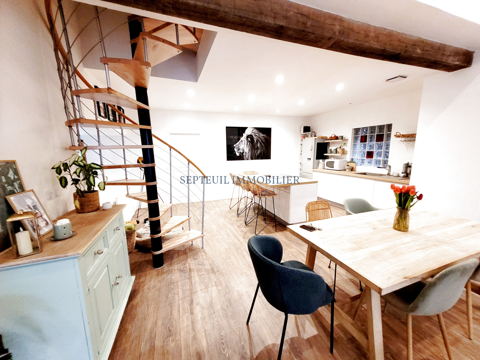 Dans un charmant village, belle maison ancienne rénovée en style loft sur 400 m² de terrain, comprenant :