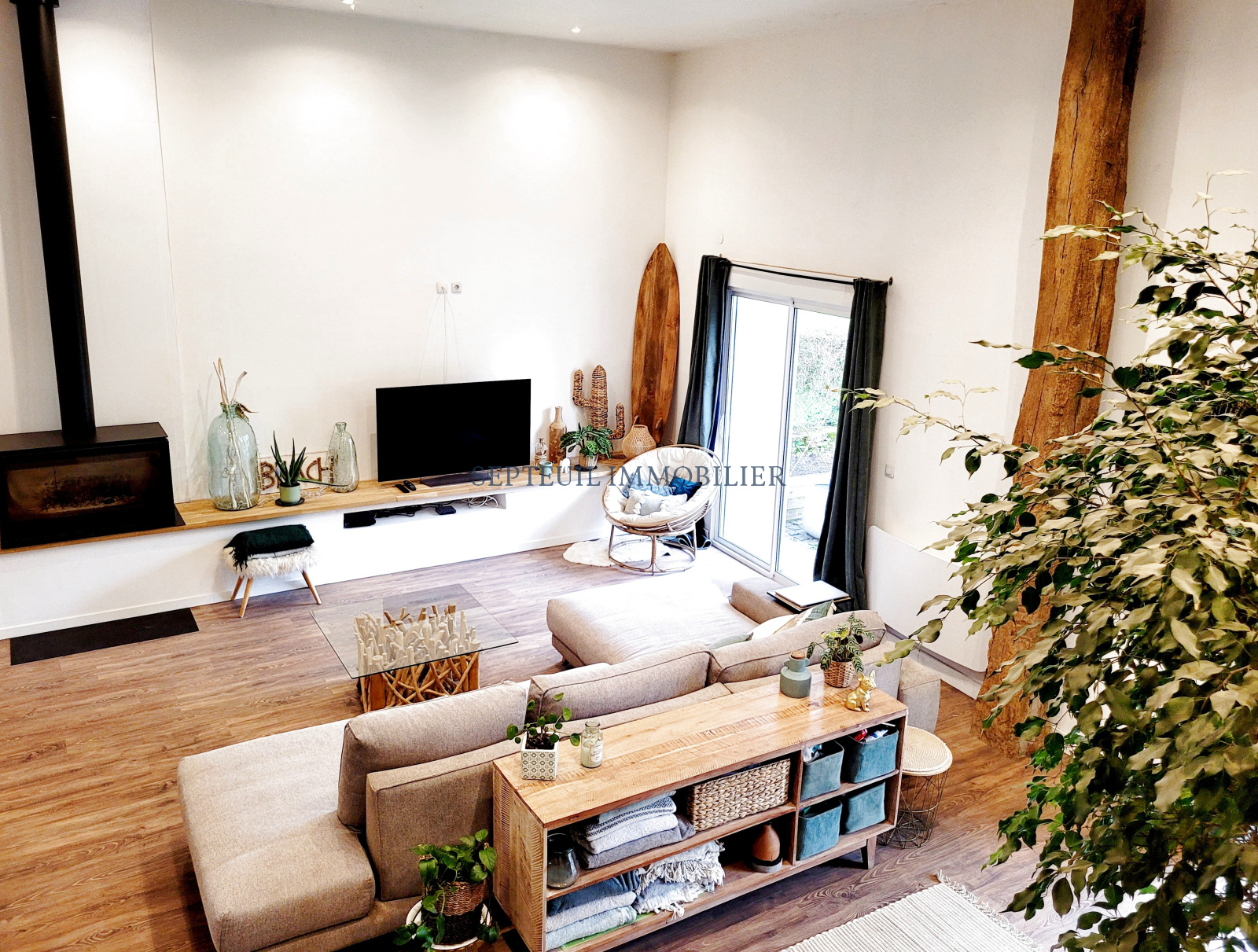 - Au rez-de-chaussée : Entrée, séjour avec cuisine us aménagée et équipée de 75 m² avec 4 mètres de hauteur sous plafond, poêle à bois, jardin de plain-pied, wc indépendant. Garage avec espace buanderie.