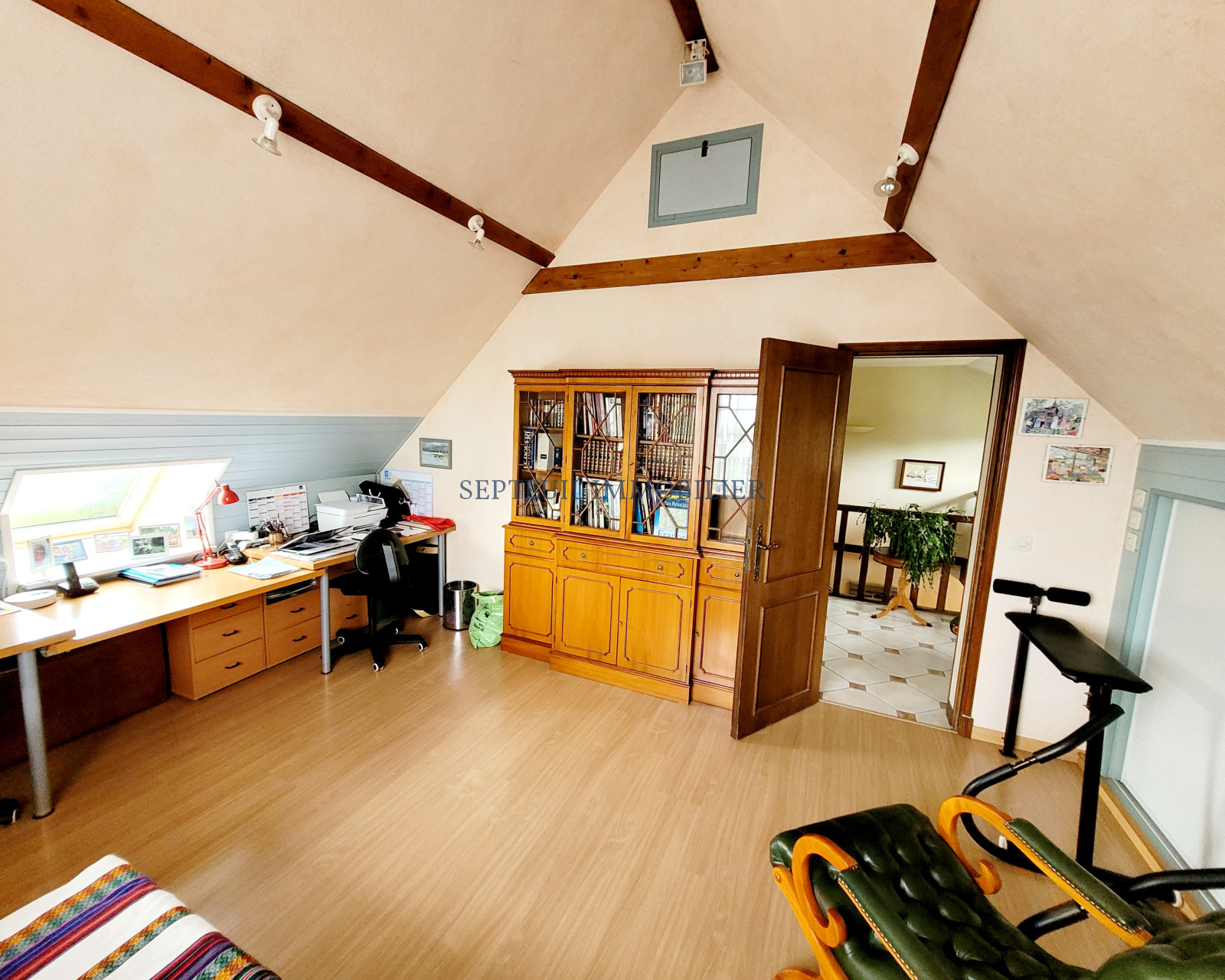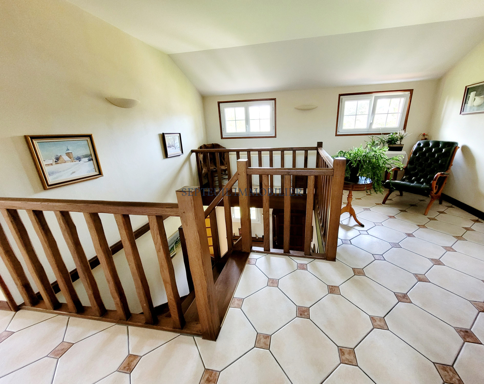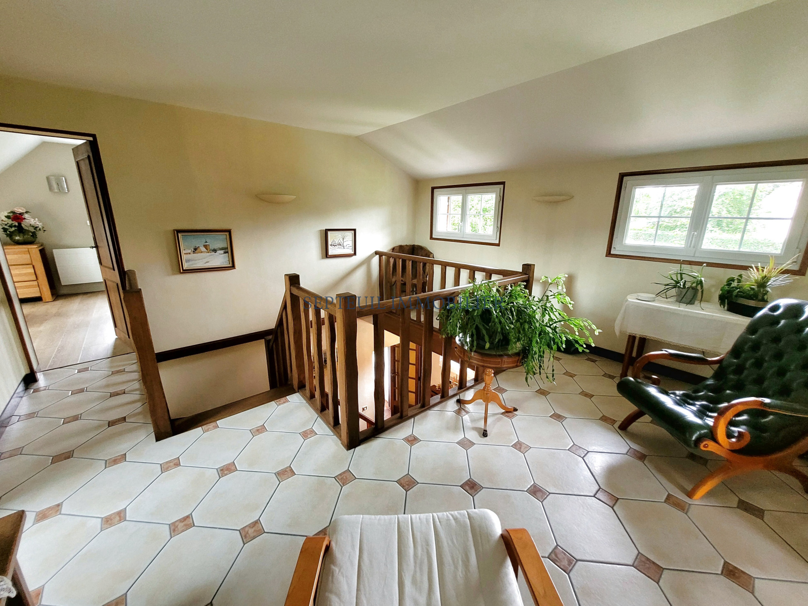 -A l'étage : un palier lumineux distribue deux chambres, salle de douche, des wc.