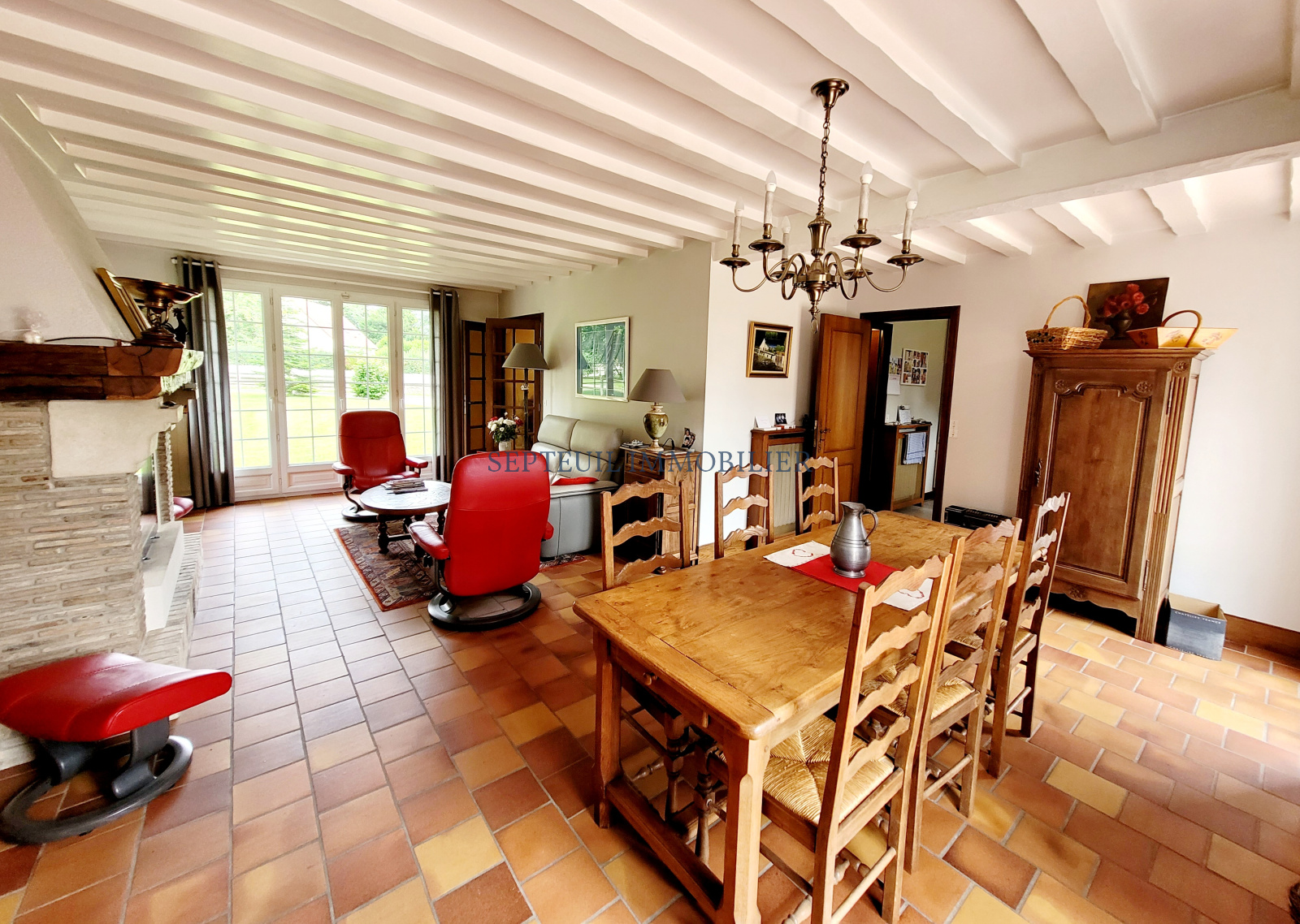 -Au rez-de-chaussée : entrée, double séjour traversant avec cheminée (insert) et accès de plain-pied sur une vaste terrasse, cuisine aménagée et équipée (accès terrasse), deux chambres dont une avec accés terrasse, salle de bains, wc séparés.