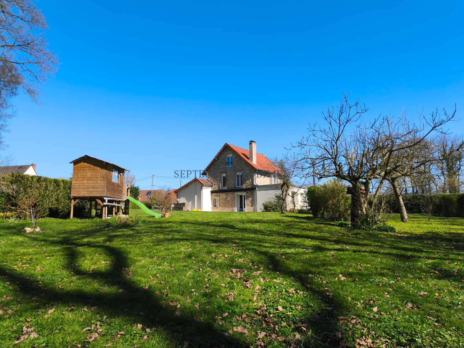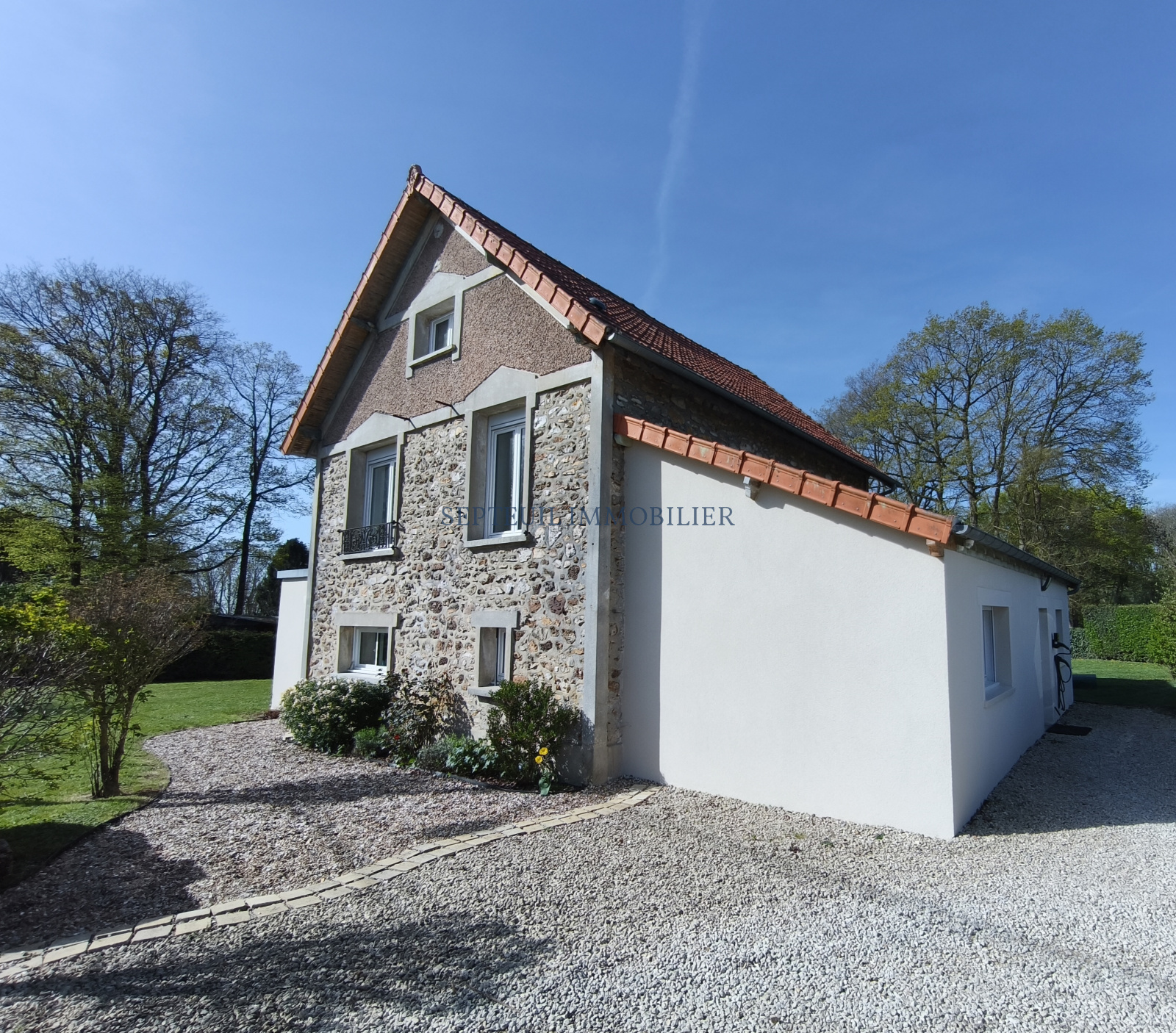 Sur 3801 m² de terrain clos, plat et arboré, maison de maître en meulières, agrandie et rénovée, d'environ 150 m², offrant :