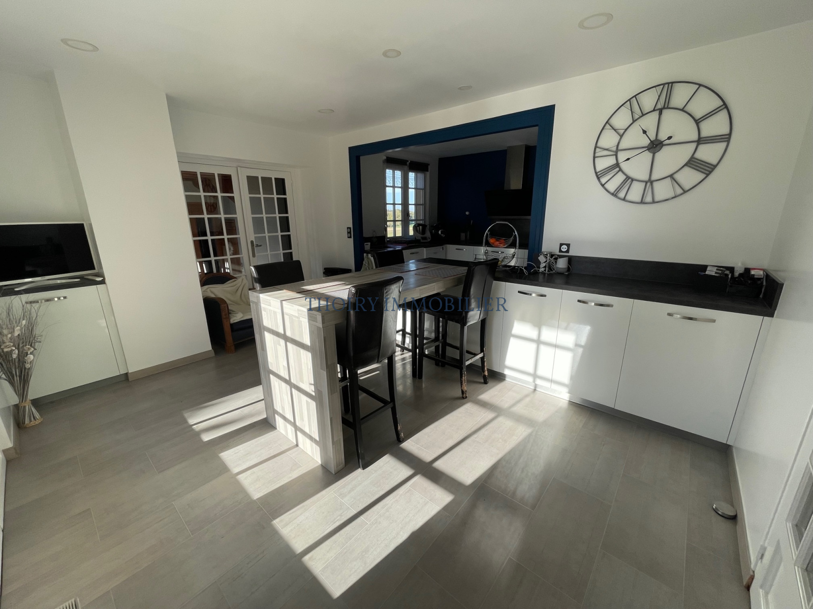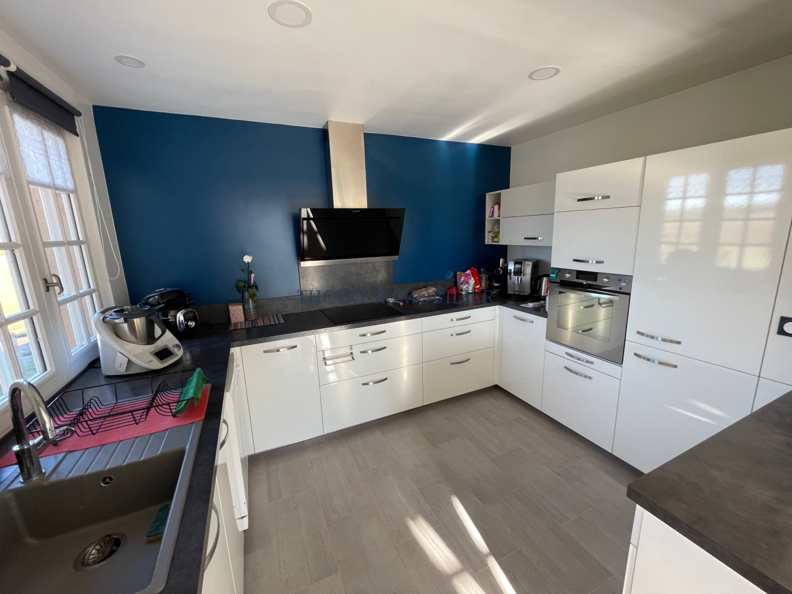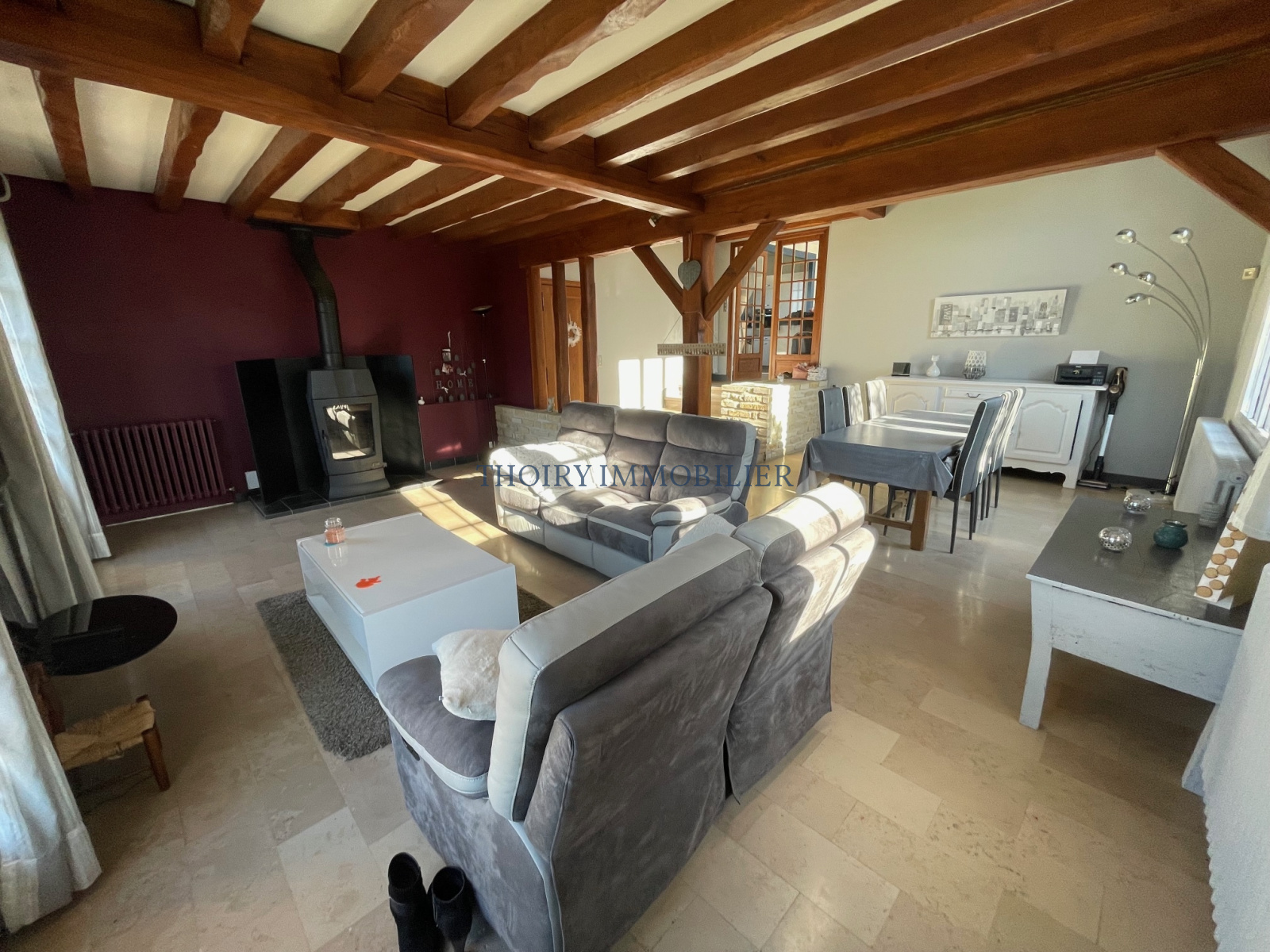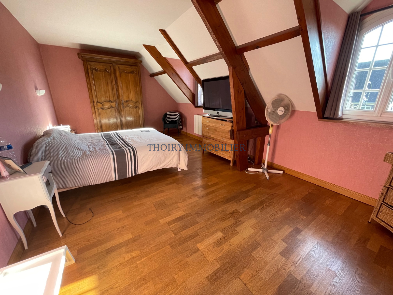 Maison traditionnelle comprenant au rez de chaussée: Entrée avec placards, séjour double + poêle à bois, grande cuisine dinatoire aménagée et équipée, bureau de 19 m², chambre avec salle de douche + wc, wc séparé.