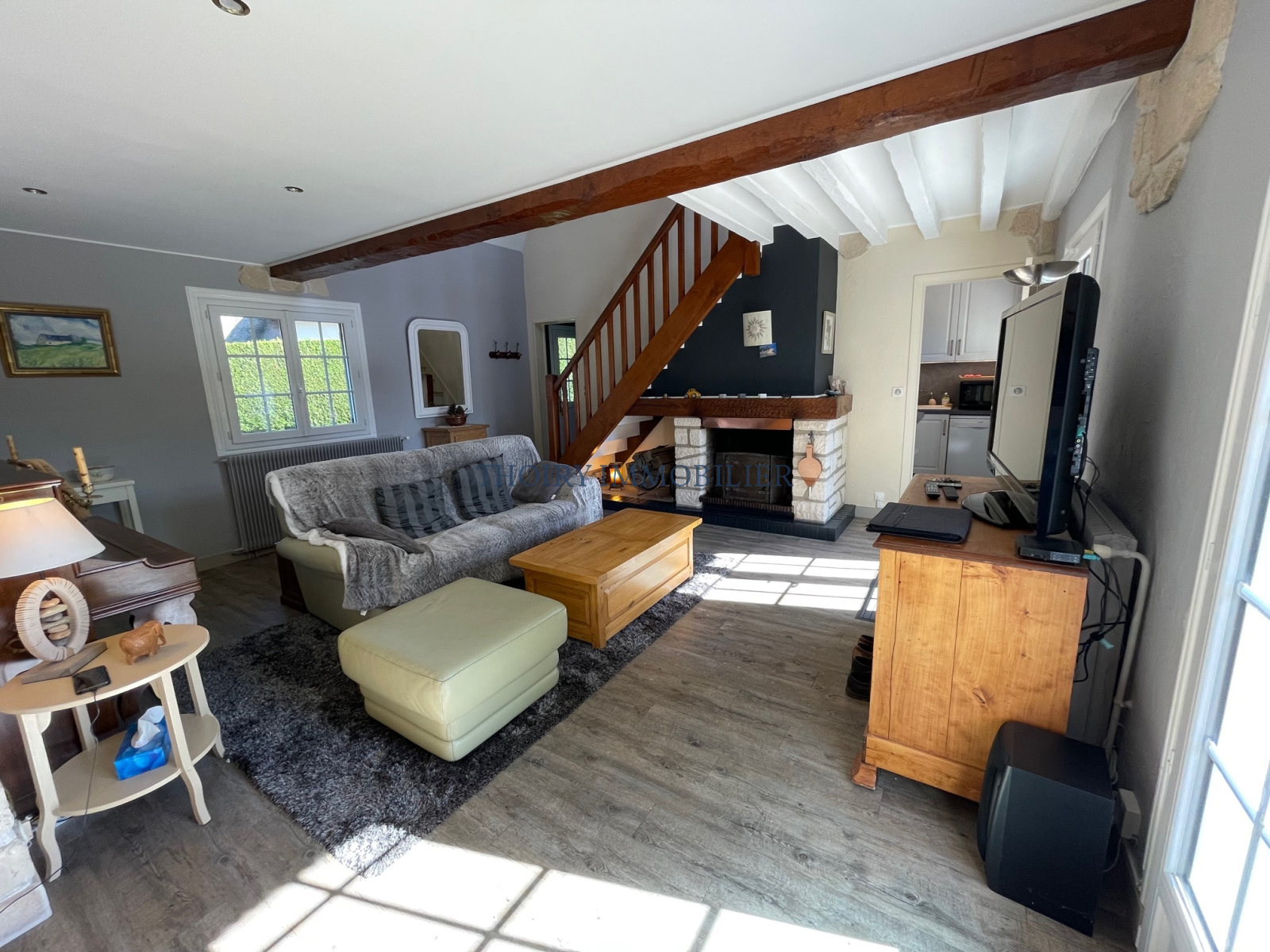 - Entrée, wc, séjour avec cheminée 37 m², cuisine aménagée équipée, une chambre.