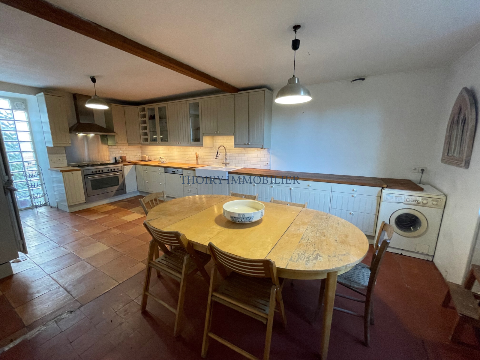 - Au rez-de-chaussée : entrée, wc, cuisine aménagée 25 m², séjour avec cheminée 50 m², pièce 36 m² à aménager.