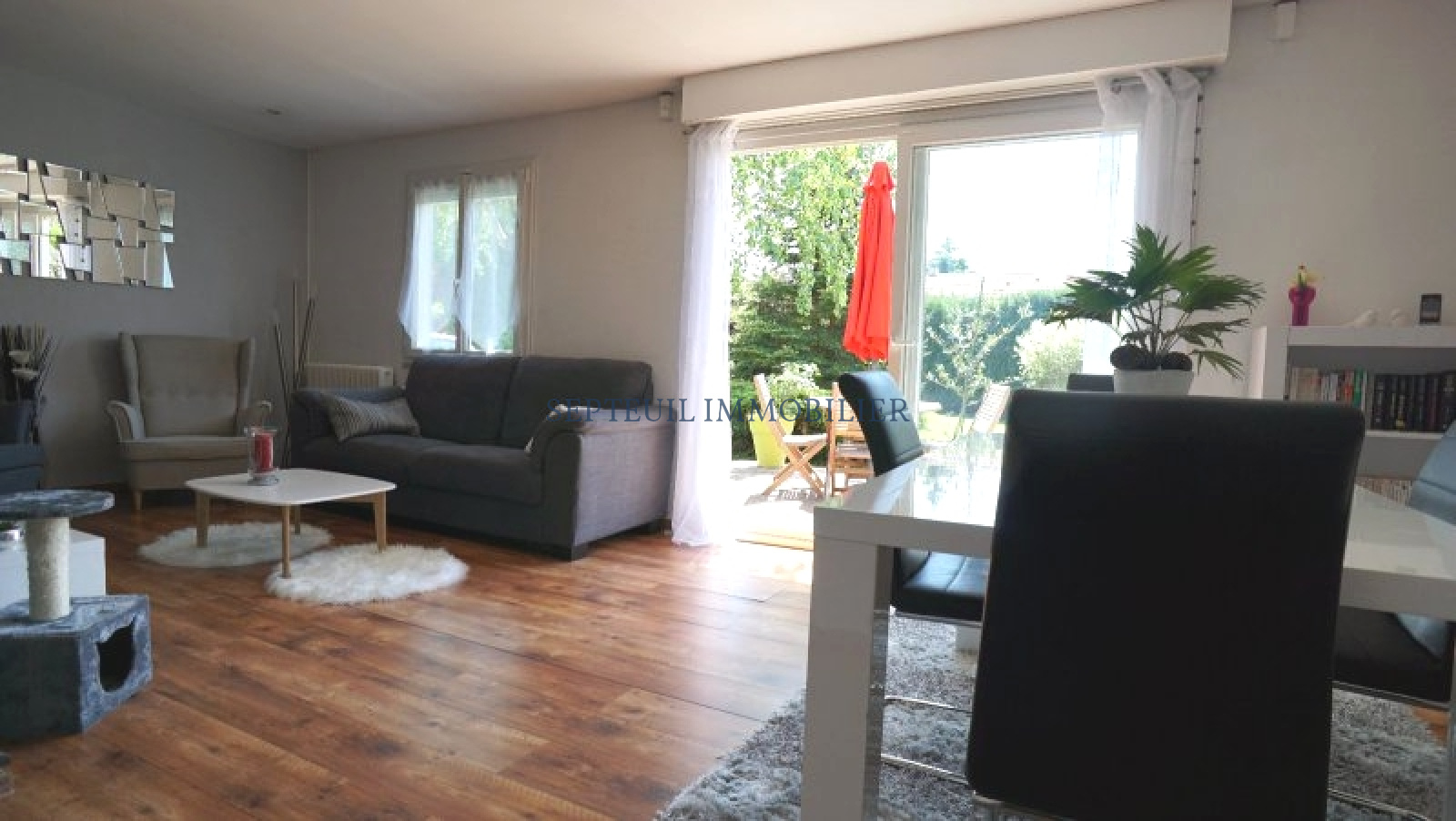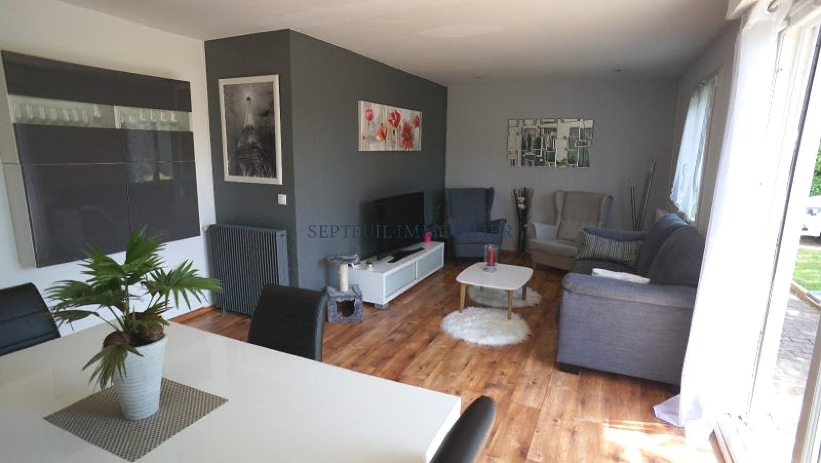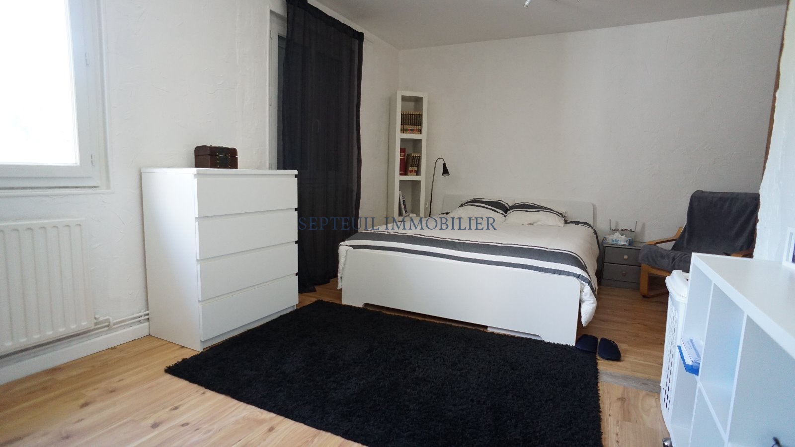 Entrée, séjour lumineux, grande cuisine équipée avec coin repas ( 20 m²), 2 belles chambres, salle de douche et wc.