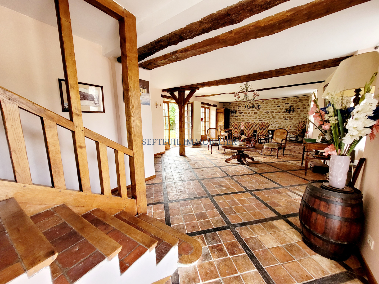 - Au rez de chaussée : entrée séjour de 50 m² environ, cuisine indépendante, 1 chambre de 21 m² avec une salle de bains, wc.